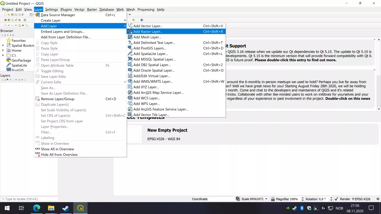 接下来进入菜单,选择图层->添加图层->添加栅格图层...,或按下(Ctrl-Shift-R)。