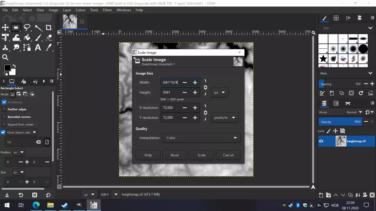 如果两个方向的分辨率相同(我们的情况以及大多数数据集中都是如此),且GIMP使用默认设置,你只需编辑宽度或高度中的一个字段即可,它们是关联的。在宽度数值(此处为5041,这表示该文件在两个方向上覆盖50410米,约50公里)后输入*10/4,其中10应替换为你之前记录的米/像素分辨率,4自然是狂热运输期望的分辨率。