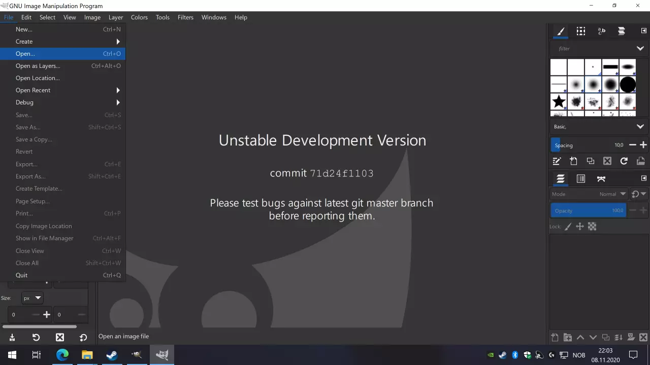 将输出模式设置为原始数据。格式应选择GeoTIFF。点击文件名行末尾的[...]来选择文件名和保存位置。我将此文件命名为heightmap.tif。记住保存位置。其他所有选项应保留默认设置。记录分辨率下的数值,此处两个方向均为10。 范围描述的是你要保存的地球区域的经纬度,如果你想要更小的文件,或者已合并多个文件且只需要其中一部分,可以进行编辑。分辨率是你保存文件的分辨率,默认情况下应设置为数据集的分辨率,此处为10,这是一个非常高分辨率且质量良好的数据集。所有这些数值的单位均为米(m),表示每像素对应的米数。通常数字高程模型(DEM)数据集的分辨率为90米或30米,你也会看到角秒这一单位,它实际上是角度单位。对于地球(仍然是圆形)而言,1角秒约等于30米。虽然你可以修改这些数值,但不建议这样做,之后我们会在GIMP中进行一些编辑来转换分辨率,这更符合我们的需求。 点击【确定】,窗口顶部应会出现绿色进度条,并显示保存成功。现在你可以关闭QGIS。 2. GIMP 现在你应该有一个TIFF文件,为了让《狂热运输》能够识别它,我们需要通过GIMP进行处理。现在打开GIMP,然后在文件菜单中点击打开...或按下(Ctrl+O),找到你的。选择tif文件并点击【打开】。