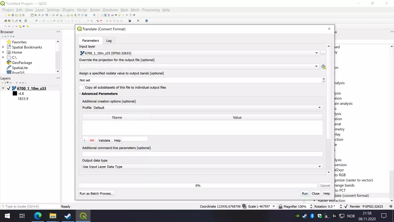 然后按回车键,新值应该会显示出来(我这里是12603)。对我来说,三次插值效果很好。内存分配可能会变得非常大,所以要注意。如果因内存错误导致失败,你必须回到QGIS并调小尺寸。