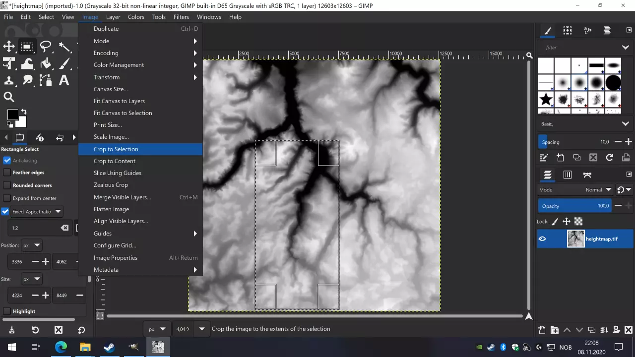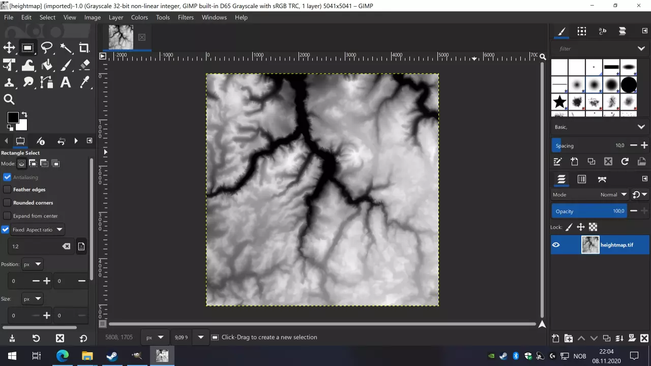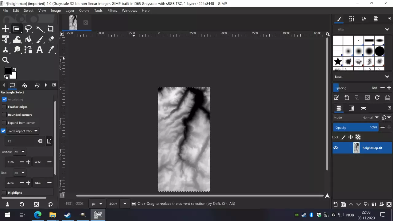 在GIMP中,裁剪图像最简单的方法是选择矩形选框工具,该工具在工具面板中显示为内部有实心正方形的虚线正方形轮廓。点击该工具,然后在设置面板中点击固定宽高比,并将其编辑为1:2或你希望地图具有的比例。 现在你可以在图像上拖动以创建选区。如果你记得我们的高度图是50x50公里,那么选区应该相对较大。要设置精确尺寸,请返回选区设置,在尺寸下方确保单位显示为px(像素),尺寸应与我们表格中的数值相同,即4225和8449。