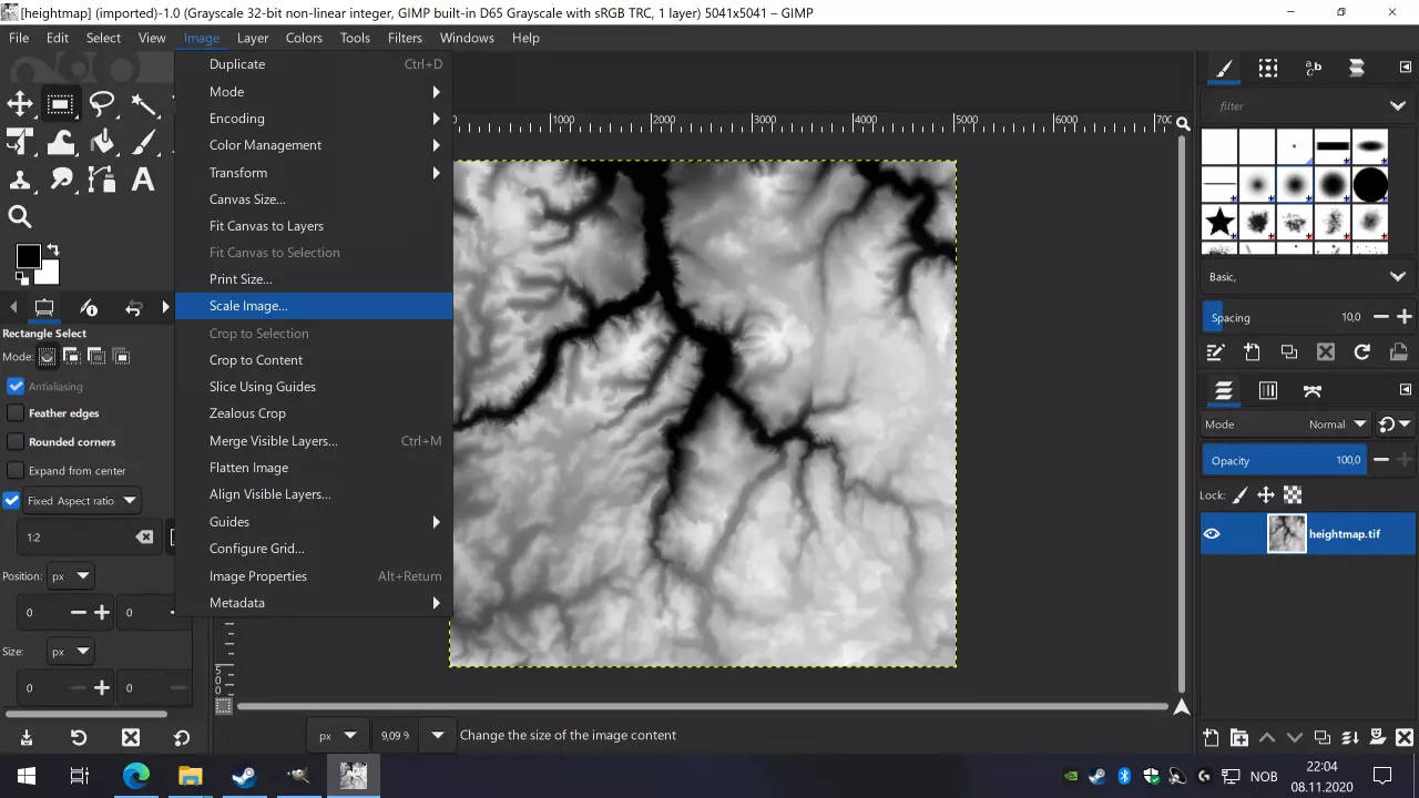 接下来的步骤适用于你希望将高度图调整为现实尺寸的情况。你也可以直接使用当前尺寸,直接跳转到描述导出的部分。 《狂热运输2》使用的分辨率为4米/像素。我们从数据集中生成的TIFF文件是10米/像素。因此,我们需要调整它的大小以匹配4米/像素。在图像菜单中,选择“缩放图像...”。