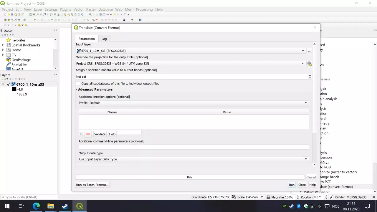 设置参数后点击【运行】按钮,此时会出现一个日志窗口,其中包含大量文本,希望没有错误。如果出现错误,首先检查日志内容,然后可以点击【更改参数】重新设置参数。一切正常后,点击【关闭】。现在,【图层】面板下方应会出现类似“已转换”或类似的新字段。如果该字段尚未被选中,请点击将其选中。