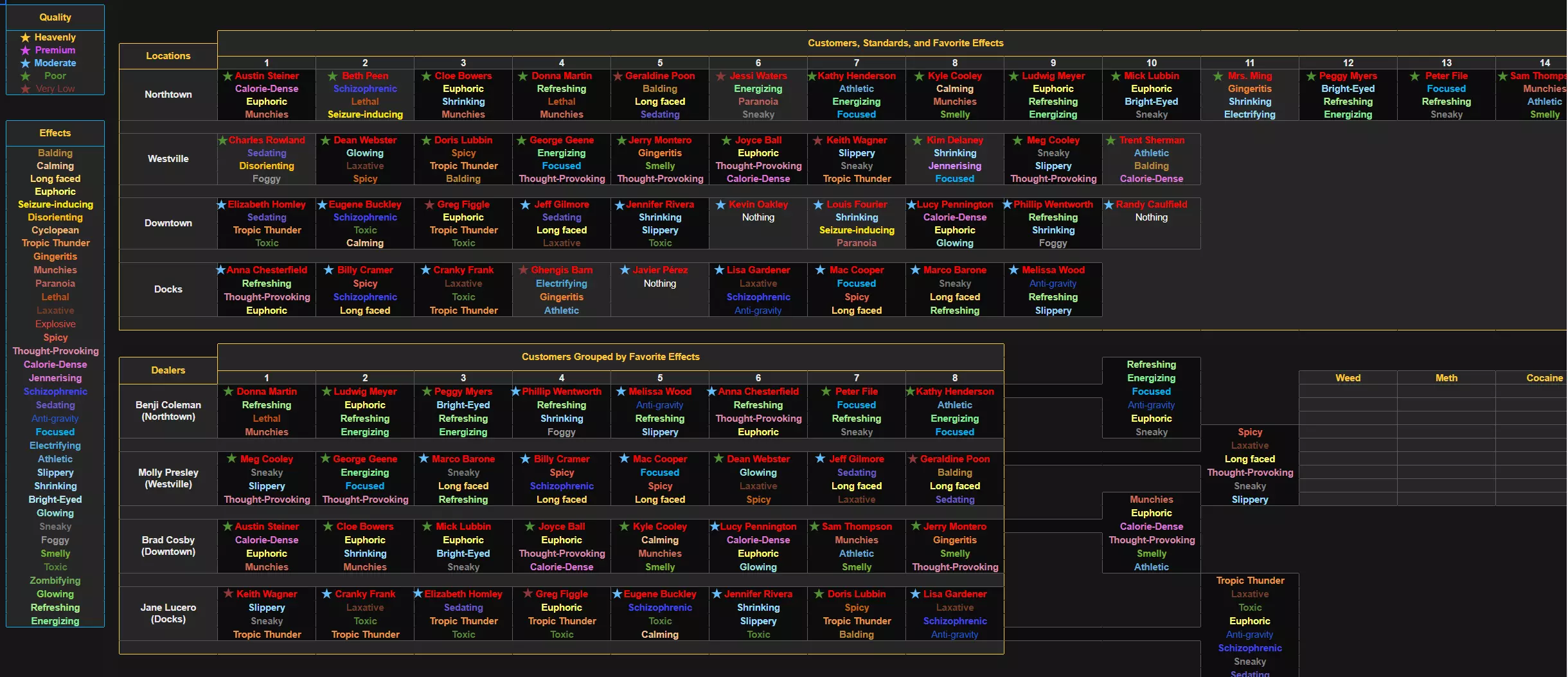 为每位客户和物质找到合适的效果可能非常耗时。本指南通过列出所有顾客、他们偏好的效果以及物质效果的完整分类,来帮助你的游戏体验。 NPC消费 NPC的消费具有高度动态性,取决于他们与你的关系以及你已解锁的产品。我自己用新存档和满级账号对此进行了测试。如果NPC的关系等级为3级或5级,他们的消费行为会出现显著波动。我还测试过持续报价直到价格变为0%、通过手机还价,甚至在不同日期进行销售,但NPC的消费情况仍然差异很大。似乎没有固定的上限,因此难以预测。
