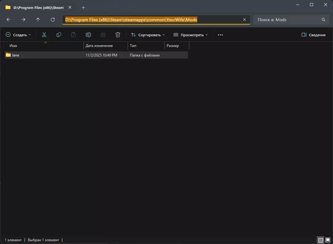 然后我们将之前解压的文件夹复制到YourWife Mods中,使其呈现如下状态: