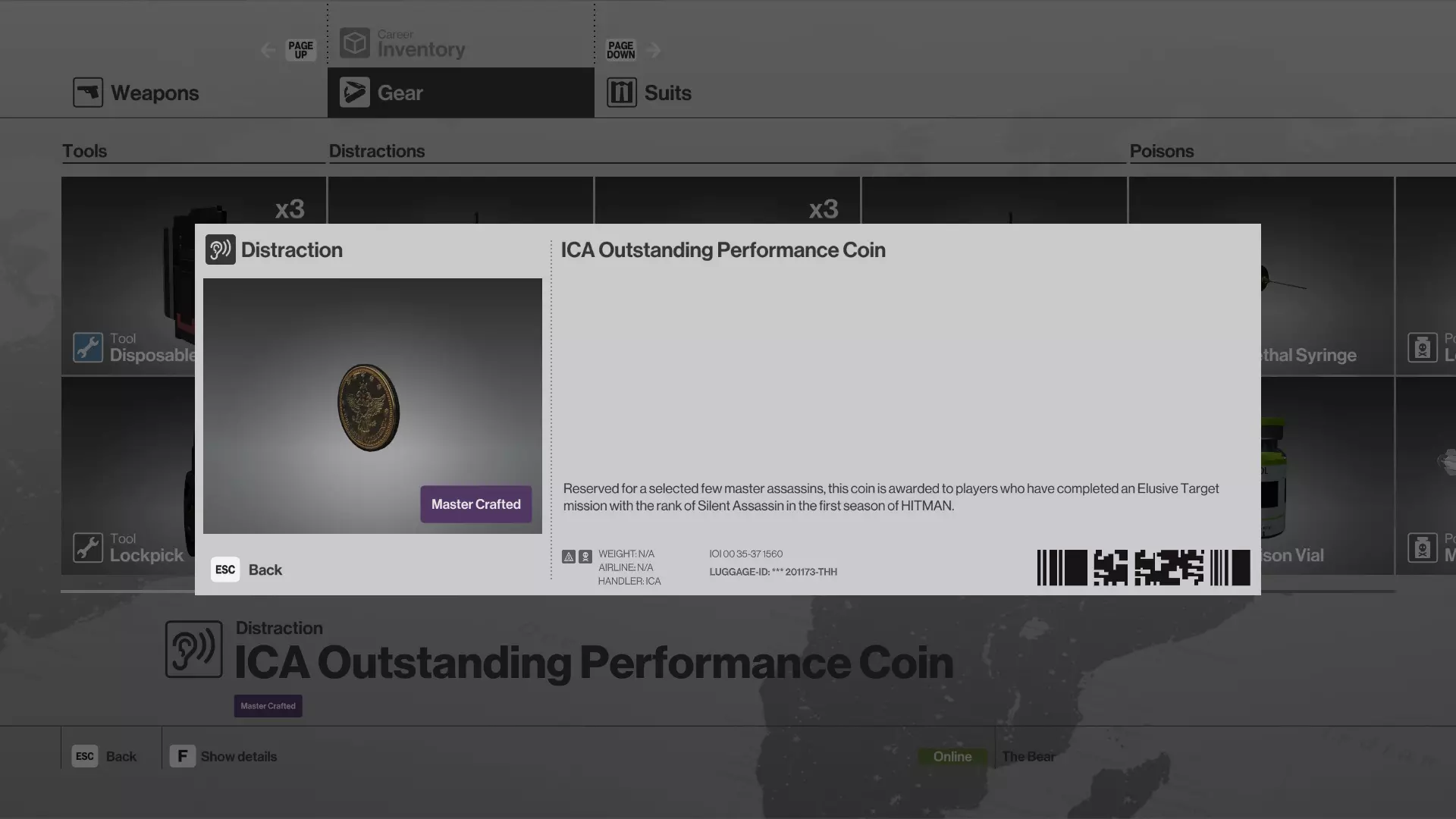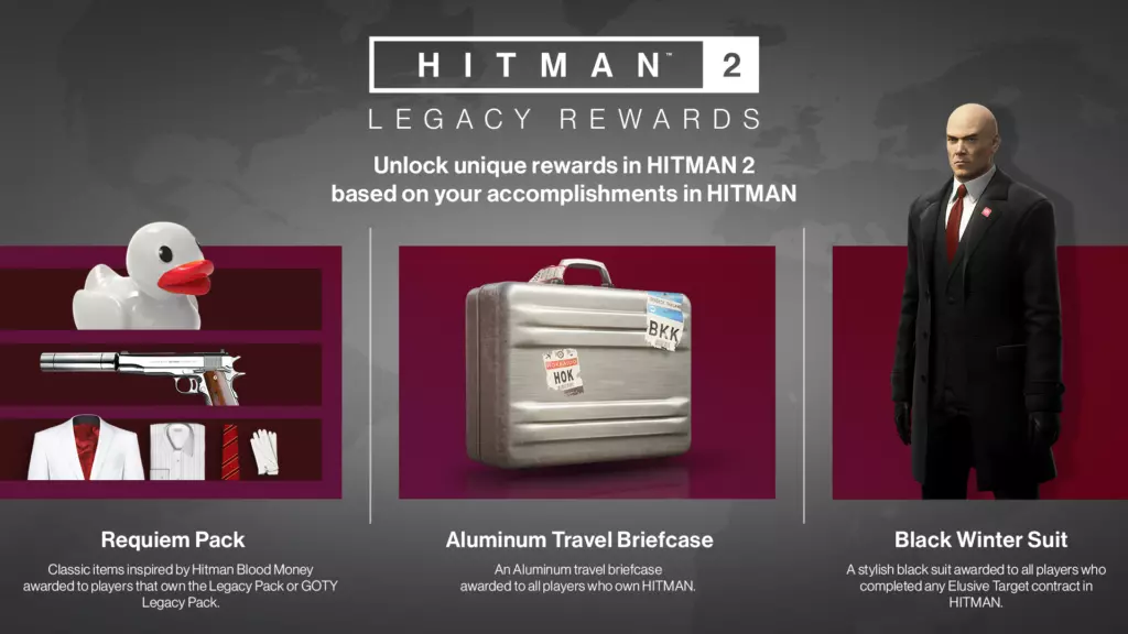 Legacy Location Rewards Banner (The quantity numbers shown are not Accurate as the image was not updated from the previous season) What's Missing? (notes) ICA Training Facility, Hawke's Bay, New York and Haven Island have never had location rewards announced for Elusive Targets. Of the four only Hawke's Bay has had an Elusive Target released for it, nothing was rewarded. Elusive targets for Mumbai have been cancelled. The suit which was originally announced as a reward for this location has been moved to an Escalation Mission in Mumbai: The Divine Descendance. Hawke's Bay default Tactical Wetsuit can be unlocked from the escalation mission The Mills Reverie rather than from an Elusive Target. Unlike the elusive target suits which are modifications of default suits (such as adding gloves or hats), the wetsuit is identical to the default. The Third item unlock (earphones) and third version of The Undying (as an elusive target) were cancelled and will not be released for Hitman 2. Tools, Poisons and Miscellaneous List by Type (Instead of Location) Lockpicks / Tools Lockpick – Complete Mission Story Challenges in ICA Facility Lockpick Mk II – Unlocked at Mastery Level 2 (Miami) Classic Lockpick – Complete All Classic Challenges on Professional Difficulty in all Hitman 2 Missions Disposable Scrambler – Complete Mission Story Challenges in Colorado Electronic Key Hacker – Unlocks at Level 7 (Isle of Sgail)Containers ICA Briefcase – Complete The Finish Line mission (Miami) to Unlock Black Leather Briefcase – Complete All Classic Challenges on Master Difficulty in all Hitman 2 Missions ICA Executive Briefcase MKII (homing*) – Complete the Best Case Scenario challenge pack in Isle of Sgail Tool Box (Blue) – Complete 40 Featured Contracts Arctic Tool Box (Red) – Expansion Pass Equipment (Winter Sports Pack) ICA Executive Briefcase (Black Leather with badge) – Executive Pack Bonus Aluminum Travel Briefcase with travel location stickers – Legacy reward*The "homing" effect is just an intentionally slower animation for the spinning of the briefcase, it can cause it to appear as if it's following a target, it's just a cosmetic change to the thrown animation Coin Distractions (stacks of 3) Coin* – Standard Default (no unlock required) Gold Coin – Complete Tuppence a Wish Feat in Bangkok Classic Coin – Complete All Classic Challenges on Master Difficulty in all Hitman Legacy Pack Main Missions ICA Performance Coins – Legacy Reward*Stacks with commonly found coins on maps Audio Distractions ICA Remote Audio Distraction – Unlocked at Level 10 (Sapienza) ICA Remote Audio Distraction Mk II – Unlocked at Level 18 (Miami) ICA Remote Micro Audio Distraction – Unlocked at Level 20 (Santa Fortuna) Mixtape 47 – Unlocked at Level 20 (Bangkok) The Big One* (Distraction, Noise Maker) – Complete all Mission Stories & Five Assassination Challenges (Landslide in Sapienza) Red-Tie Kiwi** – (Toy, Fragile) – Complete Thriller Night Challenge Pack (Hawke's Bay)*Non-lethal fire-cracker, distracts an entire area for a few seconds to look at it **This is a 1 time use distraction item that only works when thrown. It's ignored if placed on the ground, breaks on impact and can not be thrown at anyone directly to do anything. It's basically a single use coin without the versatility of being useful when placed on the ground. It's only "special" effect is that it makes two noise at once, first when it hits the ground and another when it squeaks/poofs, if two people hear it, they might both come over to look. Miscellaneous Tools ICA Proximity Taser – Unlocked at Level 10 (Miami) ICA Remote Taser – Complete Mission Story Challenges in Santa Fortuna Remote EMP Charge – Complete Story Missions in Mumbai ICA Electrocution Phone – Complete Mission Story Challenges in New York (The Bank)Sedative Poisons Sedative Poison Vial – Unlocked at Level 2 (Paris) Sedative Pills – Unlocked at Level 2 (Santa Fortuna) Modern Sedative Syringe – Complete The Master Vampire Challenge Pack (Paris)Emetic Poisons Emetic Poison Vial – Complete Mission Story Challenges in A Gilded Cage Emetic Pills – Unlocked at Level 7 (Santa Fortuna) Modern Emetic Syringe – Unlocked at Level 10 (Bangkok) Emetic Syringe Mk II – Unlocked at Level 13 (Mumbai) Antique Emetic Syringe – Unlocked at Level 20 (Sapienza) Remote Emetic Gas Device – (Tools, Explosive) – Unlocked at Level 5 (Maldives) Emetic Poison Grenade – (Tools, Explosive) – Complete The Merle Revelation escalation mission (Santa Fortuna)Lethal Poisons* Lethal Poison Vial – Unlocked at Level 15 (Paris) Lethal Pills – Unlocked at Level 7 (Whittleton Creek) Modern Lethal Syringe – Unlocked at Level 2 (Sapienza) Lethal Syringe Mk II – Unlocks at Level 5 (Isle of Sgail) Antique Lethal Syringe – Complete the Himmapan Horror Challenge Pack (Bangkok)*Note: The Black Almond's Dagger contains a single dose of lethal poison that can be added to consumable food/drink but is also a lethal melee weapon so it's in the weapons list Guns List by Type (Instead of Location) Pistols (Loud) HWK21 – Unlocked at Level 7 (Paris) HWK 21 Mk II – Unlocked at Level 7 (Miami) ICA19 F/A (Full Auto) – Unlocks at Level 5 (Marrakesh) Concept 5 Pistol (Full Auto, Low Recoil) – Unlocked at Level 15 (Miami) Rude Ruby* (Low Accuracy, Fast Fire) – Unlocked at Level 15 (Whittleton Creek) Striker** (Piercing, Extra Damage) – Complete all levels of The Dexter Discordance escalation (Hokkaido) El Matador** (Piercing, Extra Damage) – Complete The Delgado Larceny escalation's final level with a Silent Assassin rating (Santa Fortuna)*Rude Ruby can not be reloaded with bullets found, comes with it's own limited supply **Piercing: 1 bullet can hit 2 targets if they are lined up. Extra Damage: Body and leg shots are lethal. Pistols (Quiet) ICA 19 (Black)(Suppressed) – Default (no unlock required) ICA 19 Chrome (Suppressed) – Legacy Reward ICA 19 Black Lilly 