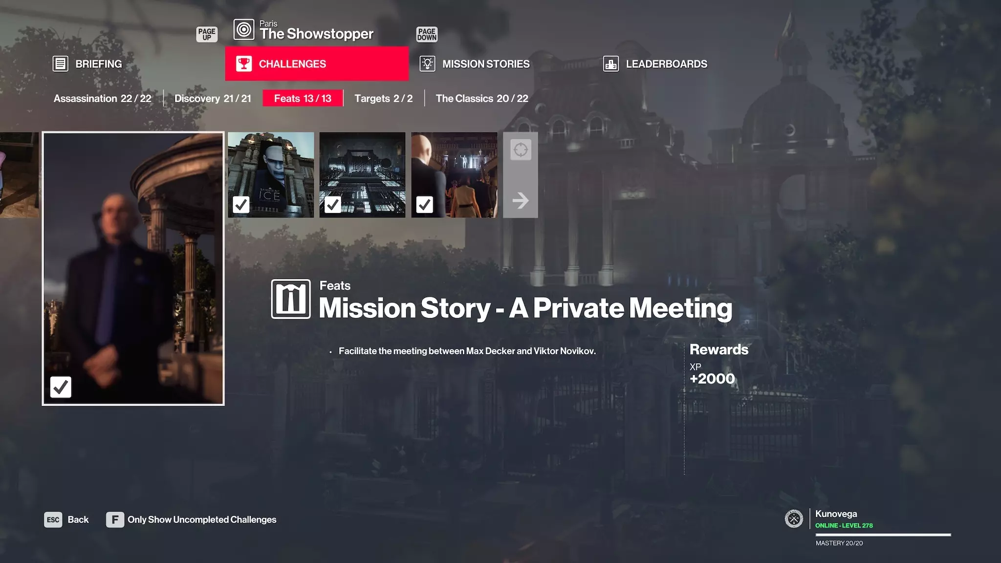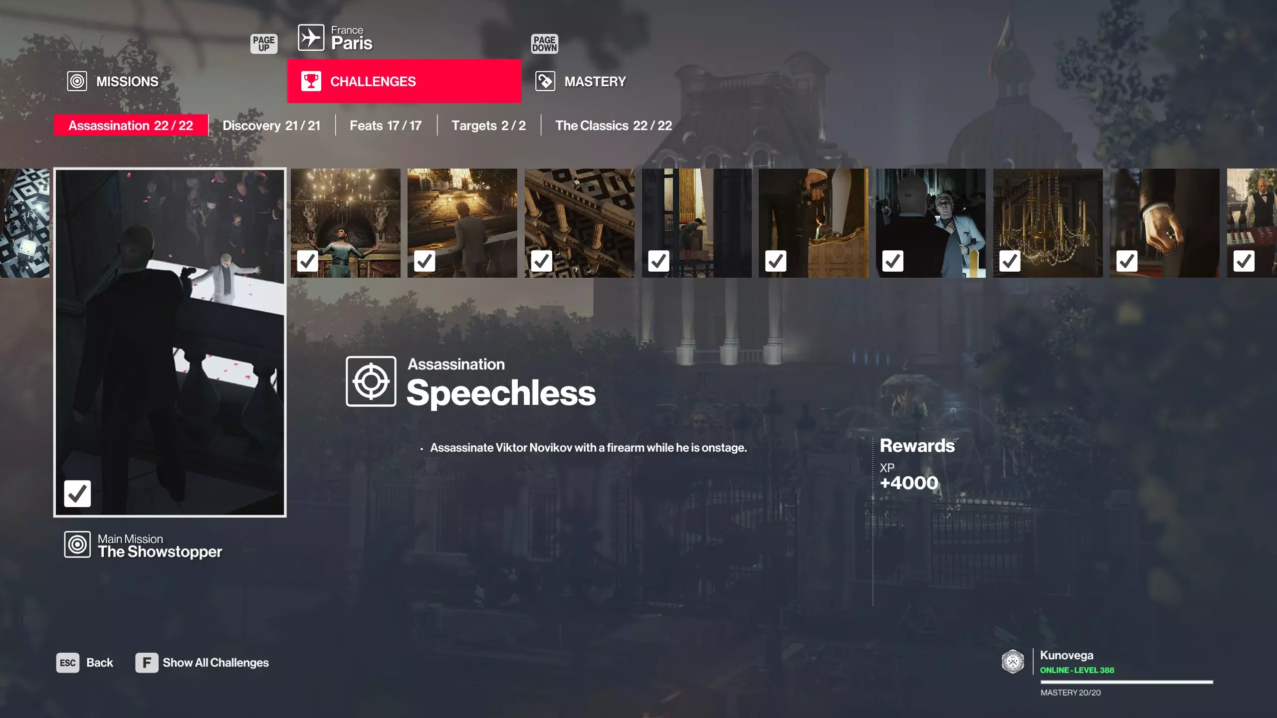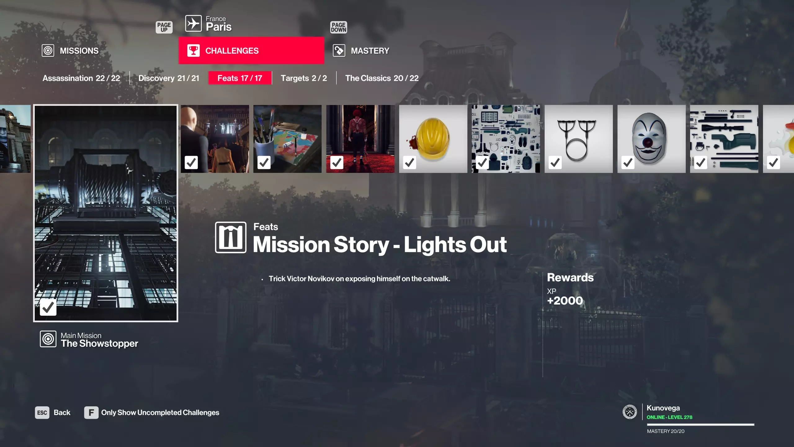 理解“剧情任务挑战” 这可能是挑战完成过程中最容易被误解的部分之一,我会尝试解释一下:当某个挑战要求“在XYZ地点完成剧情挑战”时,它指的是成就列表中的实际挑战。 每个成就都会以“任务剧情 - 名称”开头。 大多数地点有三个必须完成的成就,以解锁特定物品。造成混淆的原因是,“任务剧情”标签页中列出了超过三个任务剧情,虽然你能在列表中找到相关剧情,但完成挑战可能不仅仅需要跟随剧情。 该系统的工作原理是,跟随剧情只会在“任务剧情”部分获得一个勾选标记。最终导向的实际挑战必须以特定方式完成。如果以其他方式击杀目标,你只会获得任务故事的对勾标记,而无法完成挑战。这本质上是让你“书写自己的结局”。 游戏通过任务故事来教你触发特定机制,引导目标进入特定路径,但就任务故事的对勾标记而言,它并不在意你最终如何击杀目标。因此,你可以重复使用学到的触发机制来完成多种不同类型的击杀。 但实际的挑战部分需要特定的击杀方法。在某些情况下,如果你理解了触发机制,即使完全不按照故事流程也能完成挑战。因此,任务故事菜单中的勾选标记完全可能独立于同名的挑战(在成就菜单中)达成,反之亦然。它们的设计初衷是引导玩家从一个任务过渡到另一个,但游戏足够灵活,允许你以自己的方式分别完成它们。 为了举例说明,我将使用【巴黎:熄灯】: 首先,这是一个任务故事,而非挑战。注意其类别为任务故事,名称为【熄灯】。
