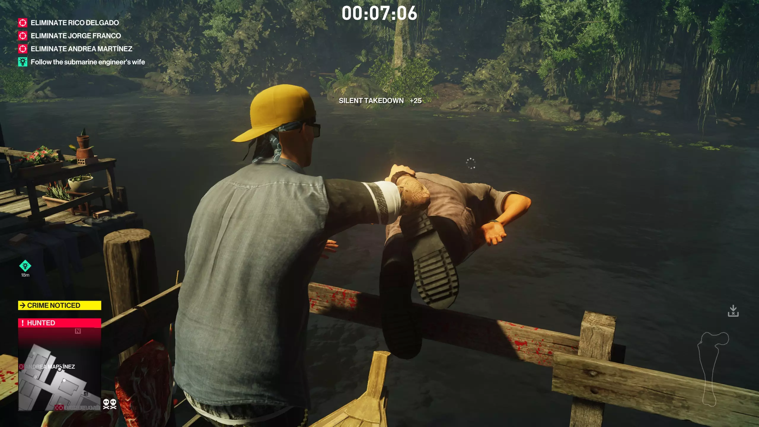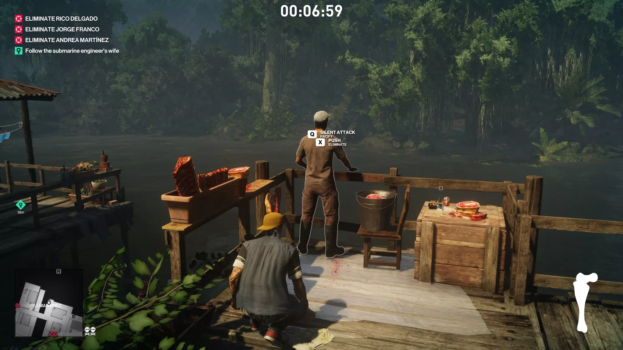 在他靠在栏杆上之前不要将其击晕,然后立即抓住他的身体并将其扔过栏杆。这样做时是否被其他人发现无关紧要,但如果被那个肉类爱好者看到,会打破他的行动规律,你需要再次等待他完整的行动周期。如果你在鱼被喂食并进入狂乱状态之前杀死他或击晕他,挑战将无法解锁。