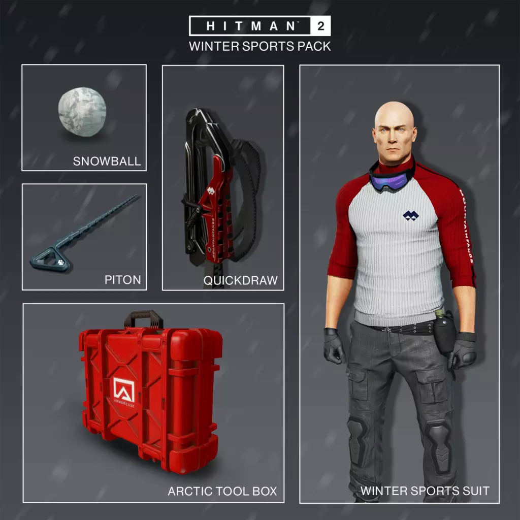 【游戏更新内容】 1. 2018年12月18日的2.12版本更新中,新增了通过完成特定数量精选合约来解锁装备的功能。注意:若你在该版本发布前已完成部分合约,需重新游玩才能获得解锁 credit。 2. 2019年1月21日的2.13版本更新中,新增了“杂工扳手”。 3. 2019年2月26日的2.14版本更新中新增了部分内容,但需等到2019年6月游戏精选合约数量超过40个时才能获取。 补充说明:随着时间推移,精选合约列表中现已包含情报竞赛合约和精选合约。无需关注它们的来源,只要在精选合约列表中,其解锁功能均相同。扩展通行证装备包 冬季运动包 ~ 2019年1月22日添加(扩展包1) 冬季运动套装(服装) 快扣攀岩装备(绞杀绳) 岩钉攀岩锥(致命近战武器) 雪球(非致命,易碎) 北极工具箱(容器) 时尚休闲包 ~ 2019年8月27日添加(扩展包2) 时尚休闲套装(服装) ICA闪光手机(干扰装置,爆炸性闪光设备) IO精英S2VP耳机(绞杀绳)