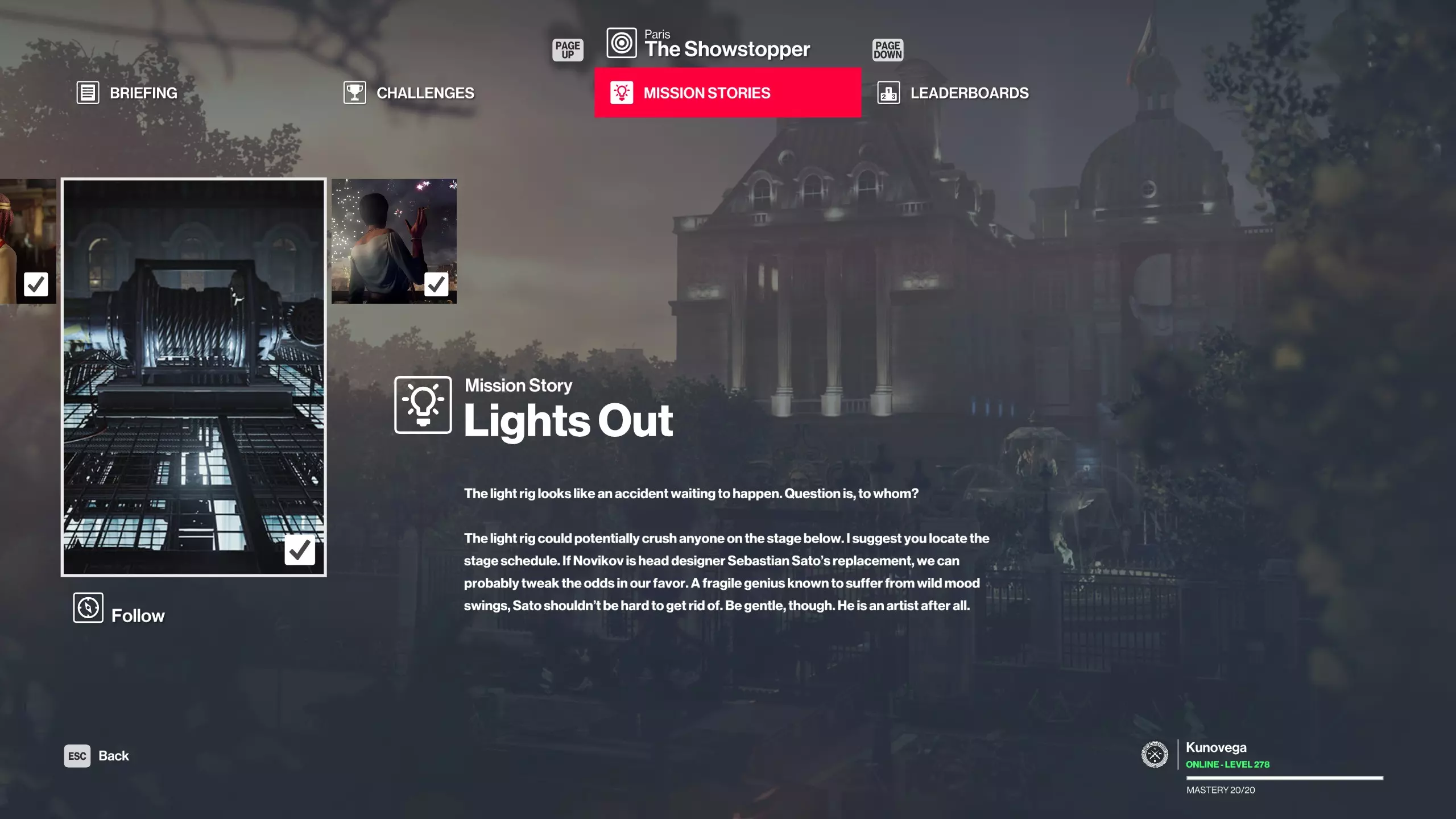 《杀手》系列中的“熄灯”(Lights Out)就是其中之一。但如果你只完成了故事模式而未完成挑战,就无法解锁名为“任务故事 - 巴黎”(Mission Stories - Paris)的挑战。 为什么要这样分开设置呢?因为你可以通过多种方式将灯光设备砸向维克多,而这本身就是一个名为“The Showstopper”的独立挑战。