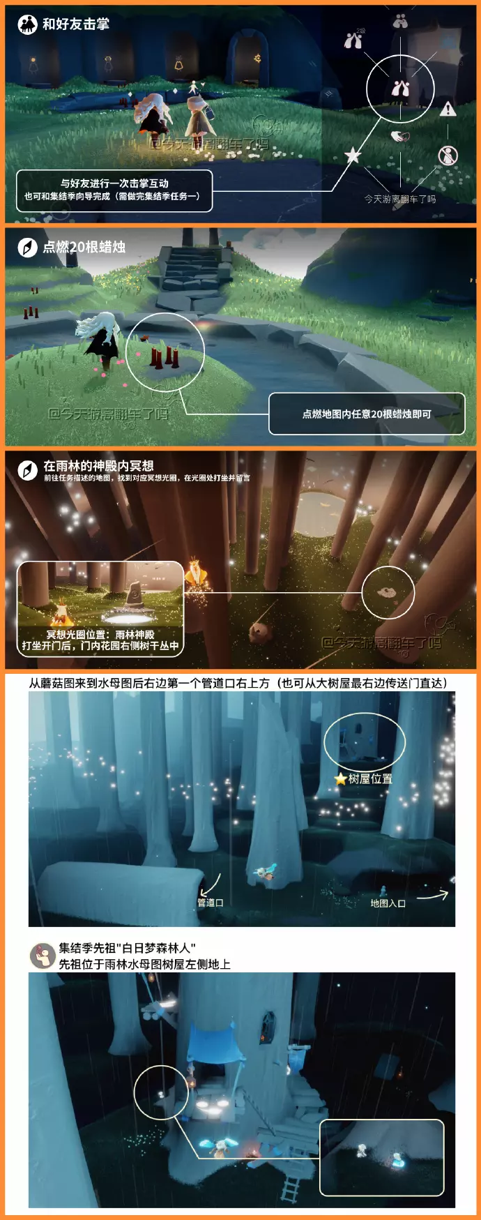 《光遇》游戏中每天的每日任务及大蜡烛的位置都不相同,玩家完成每日任务及收集大蜡烛都可以得到丰厚的兑换奖励,奖励可以用于兑换各种动作及道具,不过很多小伙伴不知道每日任务怎么做,又懒得自己去找大蜡烛的位置,我们汇总了每日任务的完成攻略以及蜡烛位置,一起来看看吧!