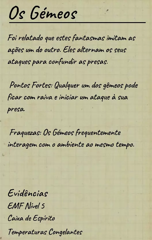 18. 双胞胎(Os Gêmeos) 狩猎理智值:50% 速度:主幽灵1.5米/秒,副幽灵1.9米/秒 主要特点 双胞胎本质上是两个幽灵,尽管它们拥有相同的幽灵模型: 存在一个主幽灵和一个副幽灵。 主幽灵速度较慢,速度为1.5米/秒(每秒不到2步)。 副幽灵速度较快,速度为1.9米/秒(每秒超过2步)。 副幽灵的幽灵房间会与主幽灵的房间相邻但不同。 两者中的任何一个都可能发起狩猎,但副幽灵发起狩猎的几率略低。无证据测试 如何识别双子: 聆听狩猎声。 如果你听到鬼魂的移动速度比普通鬼魂稍慢,而在另一次狩猎中它的移动速度比普通鬼魂稍快,那么很可能是双子。 如果你持续听到鬼魂在这两种速度之间交替,这就可以确认双子的存在。 额外提示 双子有两个互动范围:第一个在3米内,第二个在16米内。 它们偶尔会使用这两个范围几乎同时(1秒内)与环境互动。如果你注意到两个互动在两个不同的位置非常快速地连续发生,尤其是多次发生,这可能表明是【双胞胎】。 用电磁辐射检测仪测试: 使用电磁辐射检测仪,观察两次读数是否在间隔不到1秒的时间内停止。所有鬼魂都可能在大约2秒内与物品进行互动。被诅咒的物品,如巫毒娃娃,也可能导致几乎同时发生的互动。 注意:所有鬼魂的互动都发生在同一楼层的有限范围内,但它们可以通过相邻房间的墙壁进行互动。