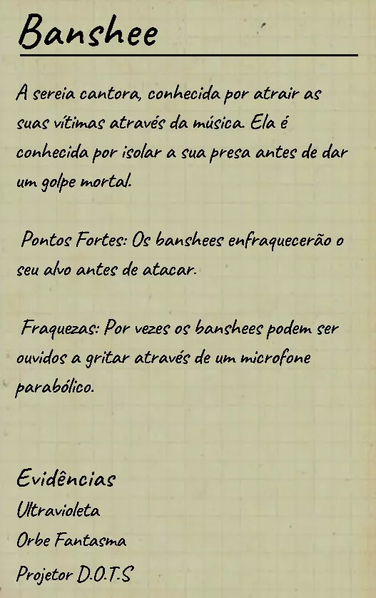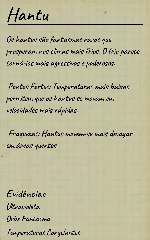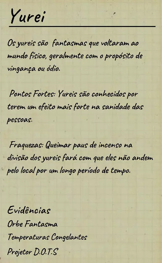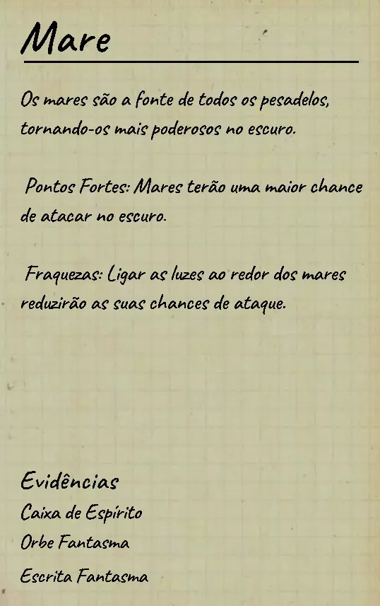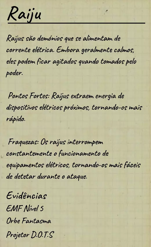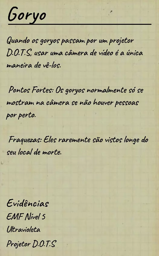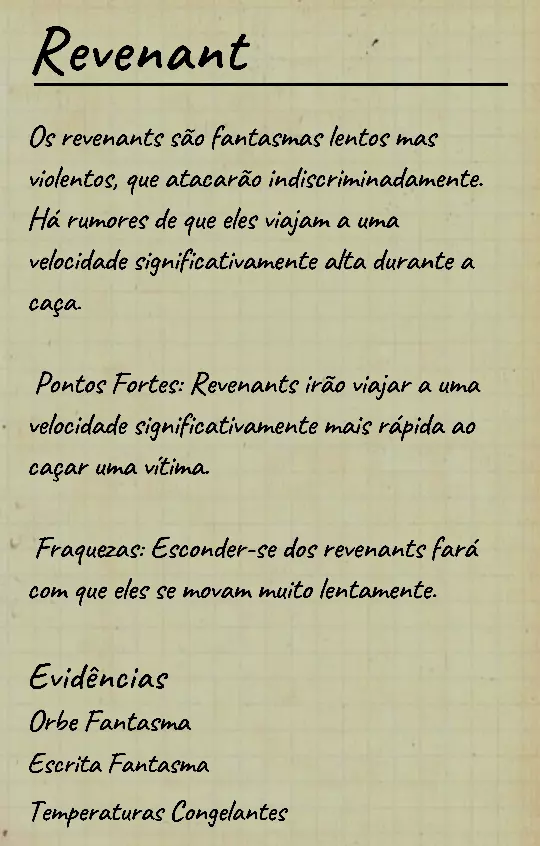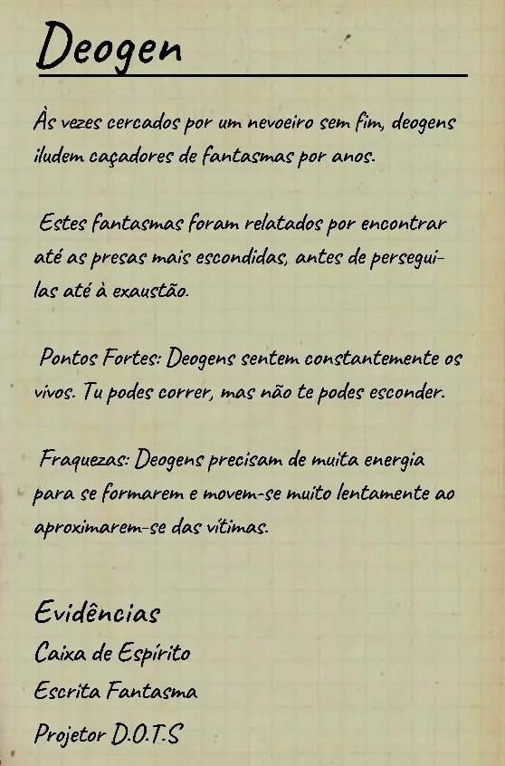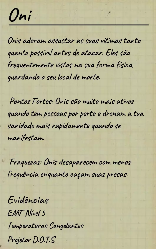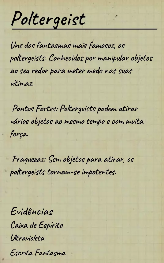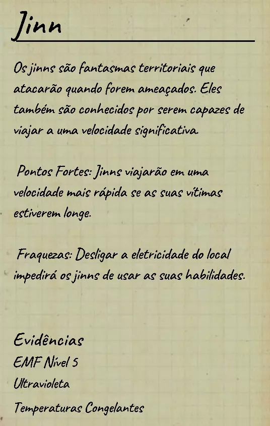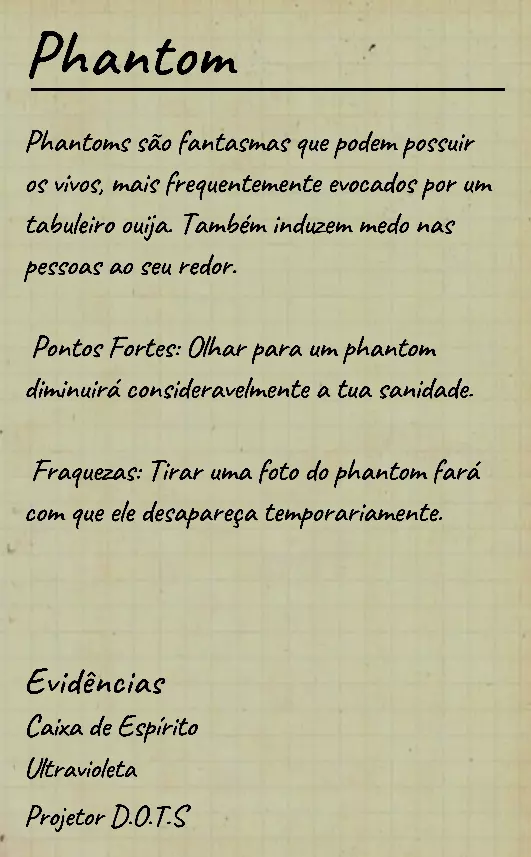 👋 Bem-vindo(a) ao guia em português de identificação de fantasmas no Phasmophobia! 📌 Percebi que a maioria dos guias disponíveis estão em inglês, então decidi criar este conteúdo 100% em PT-BR para ajudar jogadores que buscam formas de identificar fantasmas com ou sem evidências. Com base na minha experiência e na troca com jogadores experientes, reuni informações confiáveis e testadas em diversas partidas. 💬 Caso encontre alguma informação desatualizada ou incompleta, sinta-se à vontade para comentar! Estarei sempre atento para manter o guia atualizado. 🙏 Obrigado por ler — e boa investigação! 🔎👻 ⚠️ Atenção, leitores! 👻 Estamos atualizando este guia com as informações mais recentes e ajustando seu visual para tornar a leitura mais clara e organizada. 🔄 Se você notar algo errado ou incompleto, por favor, avise nos comentários para que possamos corrigir rapidamente. Agradecemos pela compreensão e pelo apoio! 💙 📚 Antes, algumas dicas essenciais Antes de começarmos a falar sobre os comportamentos de cada fantasma, devemos estar sempre atentos ao que acontece ao nosso redor: objetos se movendo, sons estranhos, interferências, eventos e qualquer detalhe que possa indicar o comportamento do fantasma. Abaixo estão alguns pontos cruciais que você deve observar desde o início da investigação: 👣 Passos do fantasma & piscadas durante caçadas Primeiramente, é importante conhecer o ritmo de movimentação padrão dos fantasmas, que é de aproximadamente 1,7 m/s (~2 passos por segundo). Assim que um fantasma te avista em linha reta, ele pode acelerar para 1,65x sua velocidade base — mas atenção: há fantasmas com comportamentos de velocidade únicos, podendo ser bem mais rápidos ou mais lentos dependendo da situação. 🔊 Ouvir o som dos passos e observar o deslocamento visual do fantasma pode te dar pistas preciosas sobre quem ele é. 💡 Outro detalhe importante é o padrão de "piscada" (flicker) durante as caçadas. A maioria dos fantasmas pisca entre 0,1s e 0,9s, mas há exceções: 👻 Fantasmas como o Phantom piscam mais lentamente. ⚡ Já fantasmas como o Raiju piscam mais rápido ao se aproximarem de eletrônicos. Treine sua percepção para reconhecer esses detalhes visuais e sonoros! 🧠 Sanidade: como funciona? A sanidade é seu "tempo de segurança" dentro do mapa. Muitos fantasmas só atacam quando sua sanidade (individual ou média da equipe) atinge certos limiares. Entenda: 📉 Drenagem passiva de sanidade (por mapa): • 🏠 Mapas pequenos: 0,12%/s (~10% a cada 83s) • 🏥 Mapas médios: 0,08%/s (~10% a cada 125s) • 🏢 Mapas grandes: 0,05%/s (~10% a cada 200s) 🎮 Modificadores por dificuldade: • 🟢 Amador: x1 • 🟡 Intermediário: x1.5 • 🔴 Profissional ou superior: x2 🕯️ A luz é sua aliada: permanecer em ambientes iluminados ou com velas evita a perda de sanidade. No entanto, há fantasmas que conseguem drenar sanidade mesmo com luzes acesas (ex: Yurei). ⚠️ Também é importante saber que certos eventos drenam mais sanidade que o normal, como: 👀 Aparições completas (The Twins, Phantom) 🗣️ Sussurros no ouvido 💨 Explosões repentinas de objetos 🔎 Resumo prático Agora que você conhece os princípios básicos da sanidade, movimentação e flicker, você já pode começar a investigar com mais precisão — mesmo sem usar evidências! 📘 Nos próximos tópicos, vamos abordar o comportamento individual de cada fantasma e como identificá-los mesmo sem provas físicas. Tudo de forma clara, prática e 100% atualizada com base na versão mais recente do game. 1. 👻 Spirit (Espírito) 🧠 Sanidade para caçar: 50% 🏃 Velocidade base: 1,7 m/s (padrão) 📌 Características principais O Spirit é o fantasma mais neutro do jogo: • Não possui habilidades passivas ou ativas únicas. • Costuma ser territorial e pode realizar eventos assim que o jogador entra na sala do fantasma. • Possui comportamento defensivo e tende a ficar mais ativo se incomodado. ⚠️ Apesar disso, ele é facilmente confundido com outros fantasmas comuns se o jogador não realizar testes específicos! 🧪 Teste sem evidências 💡 O melhor teste para identificar um Spirit envolve o uso do incenso durante uma situação de risco: Passo a passo: Drene sua sanidade até abaixo de 50%. Durante uma manifestação (como evento ou início de caçada), use o incenso diretamente no fantasma. Se ele demorar cerca de 180 segundos (3 minutos) para iniciar uma nova caçada, isso indica fortemente um Spirit. ⏱️ Caso o fantasma volte a caçar em menos de 180 segundos, não é um Spirit! Esse intervalo de 180s é a principal característica defensiva do Spirit após ser "espantado" com incenso. 💡 Dicas adicionais 🔹O Spirit costuma: • Fazer eventos logo após você entrar na sala dele; 🔹Ser mais ativo que o normal quando provocado; 🔹Reagir mal a múltiplas interações ou presença constante. 🎯 Tente deixá-lo irritado com objetos jogados ou luzes acesas — ele tende a reagir rápido. 👁️🗨️ Dica visual: não confie apenas na ausência de habilidades especiais — outros fantasmas como o Wraith, The Twins ou The Mimic também podem confundir por parecerem "neutros" em certos momentos.