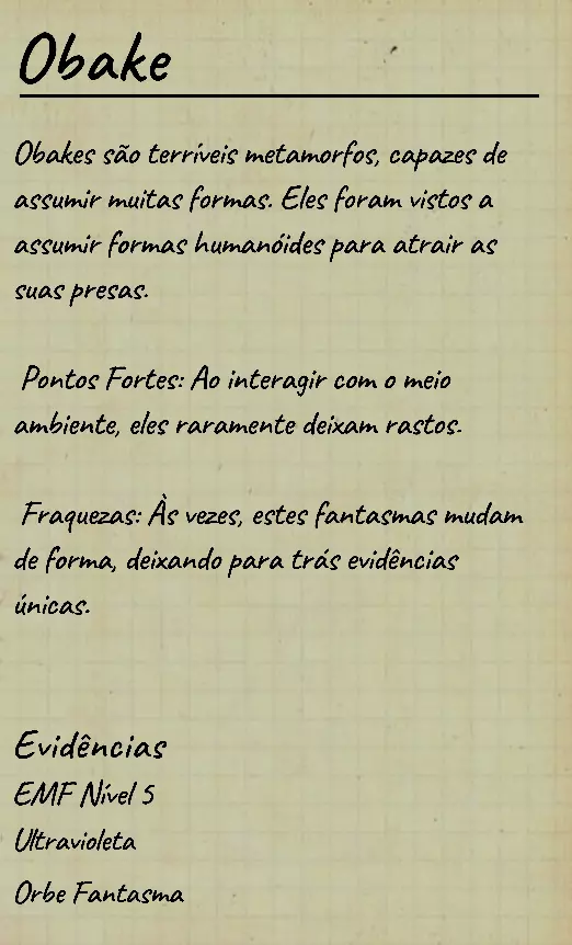20. 御灵(Obake) 狩猎理智值:50% 基础移速:1.7米/秒(标准) 主要特性 御灵是一种以善于变形、行动隐秘且难以追踪而闻名的幽灵,在狩猎和互动过程中具有独特特性: - 狩猎期间处于隐形状态时,有6.66%的几率随机变换为其他幽灵的外观模型。 - 如果狩猎持续时间足够长,通常会在一次狩猎中变形两次。 - 即使指纹出现概率为100%,御灵也可能无法留下指纹。 无证据测试 变形测试(狩猎期间): • 使用香薰延长狩猎时间。 • 每次幽灵出现时,仔细观察其外观模型。• 如果它在狩猎期间改变外观,则100%是【御化(Obake)】。 • 变形只会在它处于隐身状态时发生。 测试与证据 特殊指纹: • 有25%的几率留下6指指纹,而非5指。 • 即使在应该留下指纹的情况下也可能无法留下——唯一拥有此能力的幽灵。 额外提示 如果注意到幽灵在某次互动中留下了指纹,而在另一次互动中没有留下(同一局游戏,相同难度设置),则强烈表明是【御化(Obake)】。 【御化(Obake)】留下的指纹持续时间与其他幽灵相同(标准难度下为2分钟),但由于其特性,出现频率更低。狩猎期间切换模型不会影响行为——只有幽灵的外观会短暂改变。