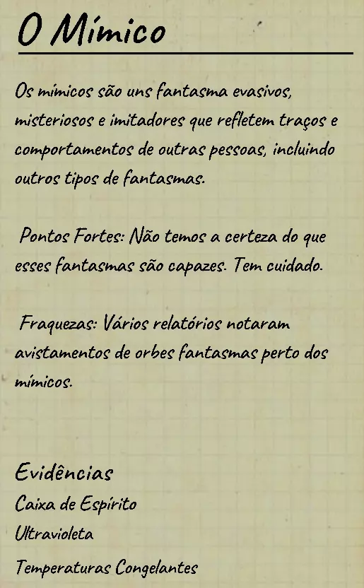 21. 拟态者(O Mímico) 狩猎理智值消耗:取决于其模仿的幽灵类型 移动速度:取决于其模仿的幽灵类型 主要特征 拟态者会模仿其他幽灵,并且在每次狩猎中至少会定期改变所模仿的类型。这种能力甚至会迷惑经验丰富的玩家。它们是唯一拥有四种证据的幽灵:刺骨寒温、指纹、灵盒和幽灵 orb。然而,幽灵 orb 不算作日志中的证据——被视为额外特征。当将 orb 标记为证据时,日志会排除拟态者,但不要被误导——它仍有可能是元凶。无证据测试 无证据对局中的灵球测试:如果在禁用证据的自定义对局中看到幽灵球,那就是拟态者——它是唯一能在这种情况下生成幽灵球的幽灵。 行为变化测试:拟态者会频繁改变其模仿的幽灵类型。如果它在一次猎杀中移动迅速,下一次却移动缓慢,之后又表现出其他怪异或混合的行为,这就是你正在面对拟态者的强烈迹象。额外提示 如果所有证据都处于激活状态,拟态者可能会复制其他鬼魂的特殊特征(例如大赤怪的可变指纹或通灵盒的特定回应)。 如果你在同一局游戏中察觉到两种不同鬼魂的独特行为,这很可能意味着存在拟态者。 拟态者无法模仿证据,只能模仿行为。