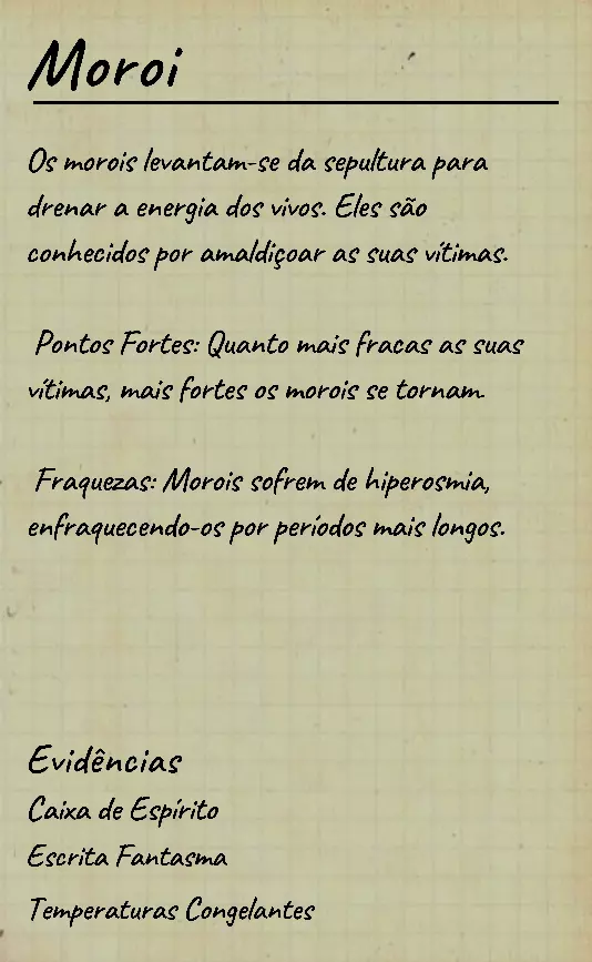 22. 莫罗伊(Moro) 狩猎理智值:50% 速度:1.5米/秒 - 2.25米/秒(取决于玩家的理智值) 主要特征 莫罗伊的速度取决于玩家的理智值(在多人模式下取平均值)。当玩家理智值为50%时,莫罗伊在狩猎时的移动速度为1.5米/秒。此后,玩家每损失5%的理智值,莫罗伊的速度就会增加0.083米/秒,直到玩家理智值降至0%,此时莫罗伊在狩猎时的移动速度将达到2.25米/秒(约每秒2.5步)。此外,如果玩家通过通灵盒获得回应或通过抛物面麦克风听到声音,莫罗伊会对该玩家施加诅咒。当诅咒施加在他们身上时,其理智值流失速度将是正常被动流失速度的两倍,甚至在手持蜡烛或处于光照下时也会开始流失(但处于【安全区域】时不会)。若玩家服用理智 pills,诅咒将被移除。Moroi 在狩猎时受 incense 的影响时间也会更长,致盲效果持续12秒而非6秒。 无证据测试 速度测试:若你的理智值为0%,且鬼魂移动速度极快(每秒3步或2.25米/秒),同时你处于断路器开启且附近无电子设备的状态,那么你遇到的可能是 Moroi。唯一能在没有视线的情况下保持如此快速且稳定移动的幽灵是【Moroi】和【Thaye】。你可以通过速度来区分它们,【Moroi】在狩猎时的移动速度为2.25米/秒,而【Thaye】的速度为2.75米/秒(这只是0岁时的速度,【Thaye】会随着年龄增长而减速)。 香火测试与视线判断:如果你仍然无法区分两者,可以拿一根香火并等待狩猎开始。在幽灵狩猎后,确保它能看到你。看到你之后,不要使用香火,直到它离你很近。如果它在视线范围内加速,那就是【Moroi】,因为【Thaye】无法在视线范围内加速。理智测试:当你的平均理智值为50%,且鬼魂进入狩猎状态时,如果你发现它移动缓慢,那么它可能是【莫罗伊】。莫罗伊在平均理智值50%的情况下狩猎时,移动速度为1.5米/秒。如果你的理智值下降,鬼魂的速度也逐渐加快,那么它就是莫罗伊。 诅咒测试:测试莫罗伊的一个更简单方法是利用诅咒(需开启理智监测器)。获取一个 parabolic sound device(抛物面声音设备)(或 spirit box( spirit box),如果你已有相关证据),并尝试获取抛物面声音(或回应)。之后,回到车上,拿起蜡烛和打火机,检查你的理智值。如果你手持蜡烛时理智值仍在下降,那么它就是莫罗伊。额外提示:如果你只有1或2个证据,且其中没有灵盒,那么它不可能是梦魇,因为灵盒是梦魇的强制证据。
