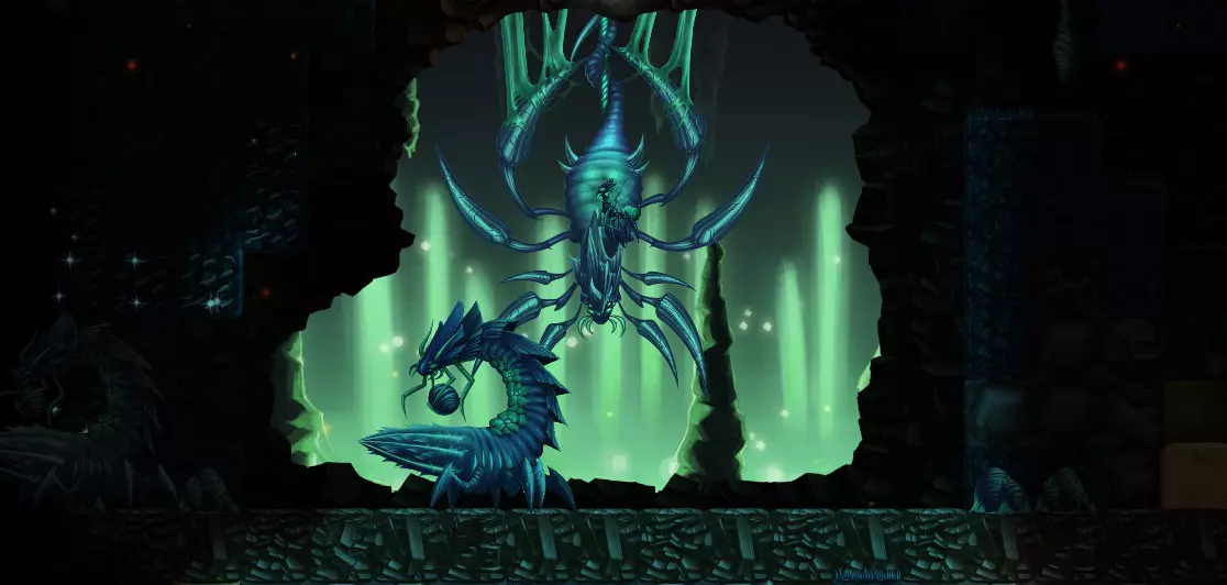 与合作模式中的同类玩法完全不同。在你和敌方基地之间有一条通道。地图上没有水晶房间,取而代之的是几个小房间,里面通常有可以解救的雪人以及一些精灵战士。如果有机会,建议清理房间,雪人会提供一些帮助,而士兵有几率掉落比金色品质更好的部分盔甲。这个生物群落相当紧凑。可以很快挖到秘银,或者通过魔法光找到它,因此在这个生物群落中,顶级装备的发展速度是最快的。 蜘蛛生物群落。