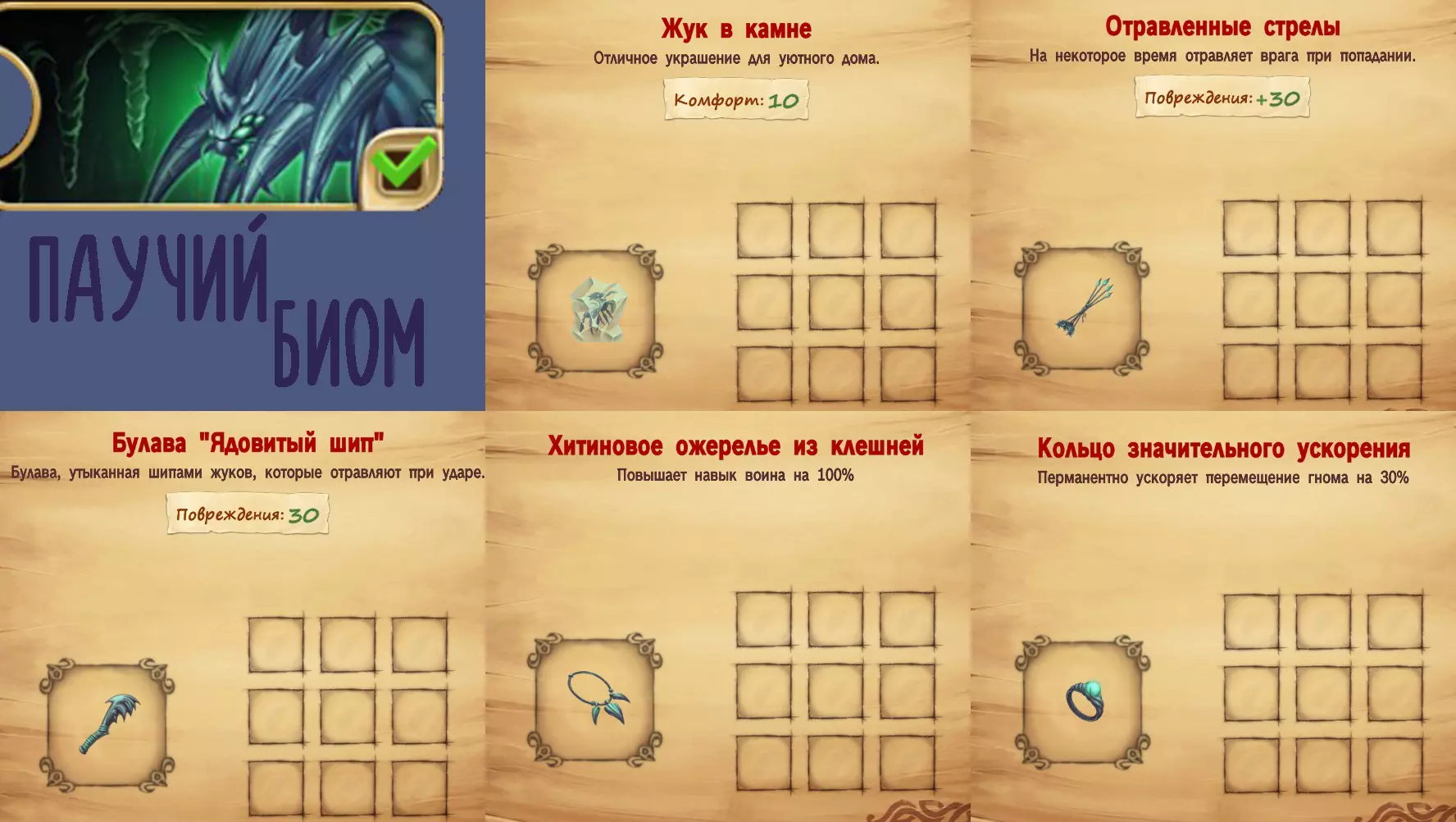 它非常类似精灵族的PVP模式,这里基地之间也有通道。与蜘蛛生物群系的合作模式有很大不同。这里自然没有Boss,但仍有母巢怪和小怪的房间,只是不能杀死母巢怪,而是当它们快死时,会和它们的随从一起变为友方单位。我觉得这毫无意义,因为友好的母巢(matriarхи)只会待在它们的洞穴里,根本不会提供任何帮助,所以你完全可以无视这些房间。(这可能根本就是个会被修复的bug)和精灵生态区一样,这里的布局相当紧凑,但有时可能会缺少某些资源(地图上生成的数量可能就是很少)。 矮人在多人模式下的升级。获胜的关键要素,尤其是在PVP中,是你的矮人升级等级。拥有100%技能的矮人在战斗中造成的伤害,正好是没有技能的矮人的两倍。因此,如果你想在PVP中获胜、快速通过合作生物群落,升级矮人是必须的,这是你金币最有价值的投资之一。将技能从0提升到100%需要11本书,也就是22金币。考虑到在一个生物群系中获胜大约能获得60点,这并不算多。在升级地精的某个技能之前,建议先用遗忘药水将其已有的技能重置。 实用技能。