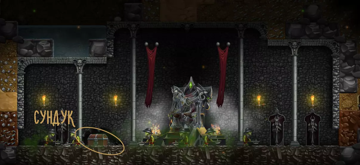该生物群系类似于单人游戏中的第一个世界。它具有相当大的深度尺寸,以及较高的土壤密度(空洞较少),这使得无法用魔法光来开启地图。必须深入挖掘才能获得最珍贵的资源。在获得良好的装备,最好还有更适合矮人职业的武器后,就可以前往地图中心了。这个 Boss 非常高大,无法通过高度为一格的通道。所以如果你将通往房间的通道设置为一格高度,就可以用弓箭手或法师对其射击,而它只能站在原地。因此在这个生物群系中,我推荐使用弓箭手或法师。不过,即使有弓箭手也并非易事,Boss 会时不时召唤僵尸来帮忙攻击你。 地下生物群系。目标:清理哥布林中央营地。摧毁藏身处内的哥布林宝箱即可获得胜利。