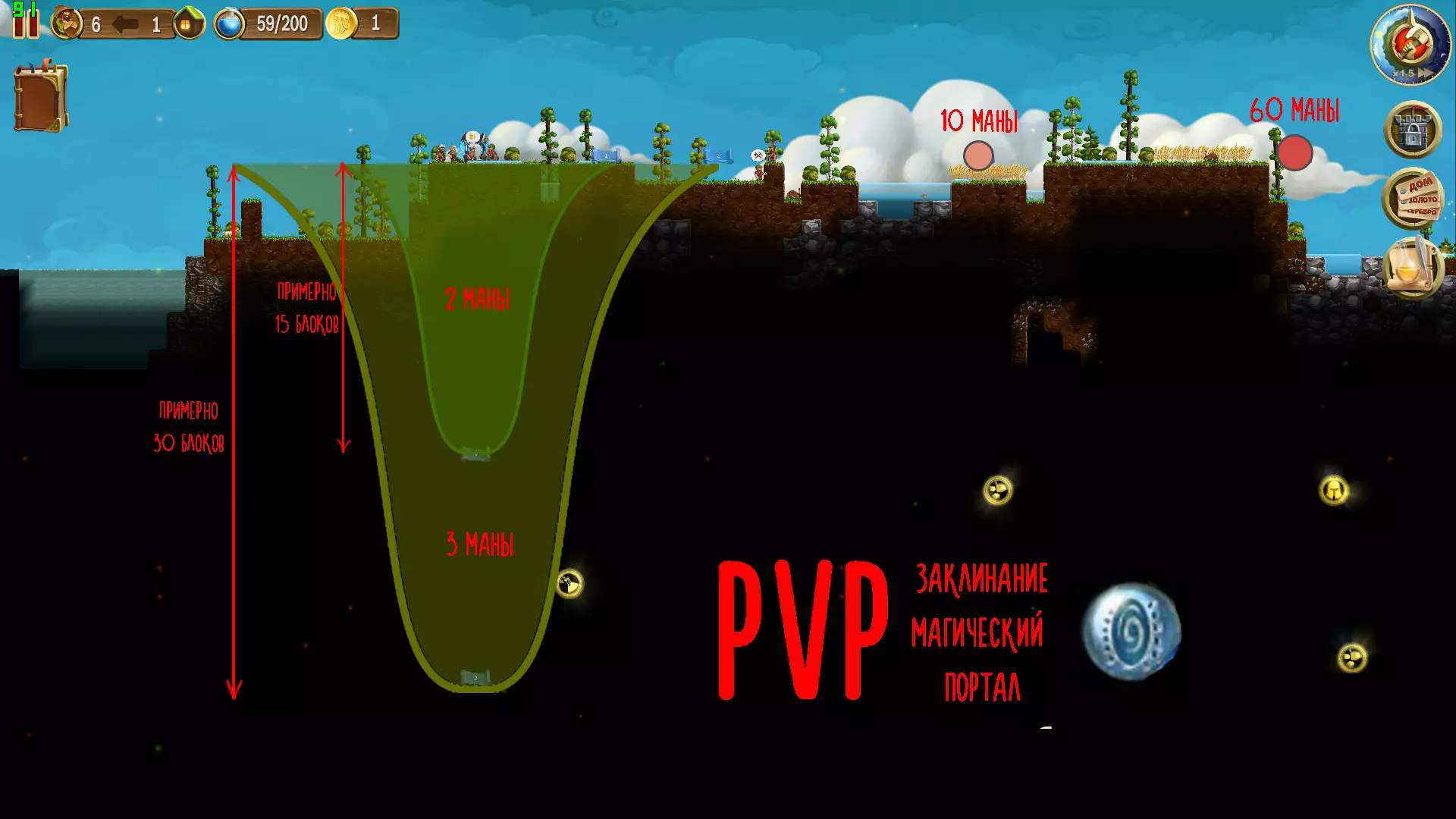 Если поставить целью с начала игры как можно скорее попасть в мультиплеер то это займет не больше получаса. Вся сложность заключается в нахождении 3 серебра и 2 золота, которые могут располагаться глубоко под землей. Впрочем, если вы уже долго играете, но так и не докопались до серебра с золотом, вы можете потратить монетки и купить их в магазине. На серебро+золото для портала уйдет 12 монет. После того как портал построен, у вас в первом слоте появится заклинание "Сетевая игра". Кастуем заклинание, ставим галочки на интересующих нас биомах, или если готовы пойти в любой ставим на первые места те в которые хотели бы пойти больше всего. Если вам за 2 минуты на находит противника, вылезает окошко, предлагающее зайти в биом в одиночном режиме или продолжить поиск. Если вы зайдете в биом в одиночном режиме к вам в первые минут 5 смогут подключиться игроки. Можно намеренно попасть в одиночку в мультиплеер, если отключить интернет, после подождать 2 минуты и дождаться предложения пойти одному. Как попасть в мультиплеер мы разобрались. Теперь давайте разберемся с тем, что там делать и как побеждать. Базовая информация. Отличия от одиночной игры. Вы попали в какой-то биом, неважно ПвП это или кооперативный режим, - вроде все похоже на начало одиночной игры, однако вам стоит понимать, что здесь совершенно другие цели и некоторые механики игры отличаются, как то: Сразу открыто все дерево технологий Все ваши ресурсы и экипировка остаются дома, вы начинаете с нуля. На карте появляются только 6 гномов (случайно выбранных из вашей одиночной игры). Если гном умирает можно призвать нового из "дома" нажав на стрелочку в левом верхнем углу. Закланания увеличивают свою стоимость по мере удаления от портала Ручной контроль гнома тратит ману. (если вы в биоме без оппонента это правило не действует) Отсуствуют некоторые крайне полезные предметы и заклинания, например "строительные леса" или заклинание "магический взрыв" На карте присутствуют некоторые предметы и строения которых нет в одиночной игре, позволяющие намного быстрее добывать ресурсы. (маленькие сундуки, комнаты с сундуками, деревянные подпорки в эльфийском биоме и др.) Карта намного меньше, концентрация на ней ресурсов намного больше. У вас есть небольшой стартовый набор ресурсов которого хватит чтобы сделать 6 кроватей из листьев + стол. Так же нам сразу дается кузница, верстак и тотем, которые остается только поставить. Умирая в мультиплеере ваш гном умирает и в одиночной игре, поэтому перед походом в мультиплеер рекомендуется построить хрантель душ и запастись зельями воскрешения. (Если прочитать мой гайд полностью и играть в кооператив аккуратно можно и не умирать конечно :)Непонимание игроками этих отличий мултиплеера от одиночной игры, а так же то, что в мултиплеере совершенно другие цели, заставляет игроков совершать огромное количество нелепых ошибок, вот самые распространенные из них: Постройка большого дома с деревянными или лучше стенами. Развитие до некоторых сложных в производстве строений и экипировки Забота о красоте и симметрии дома Нерациональное использование заклинаний и трата маны (в мултиплеере мана - ценнейший ресурс) Постепенное неспешное развитие (например крафт сначала железных кирок, затем их разбор и замена на серебряные – трата драгоценного времени) Мы разобрались