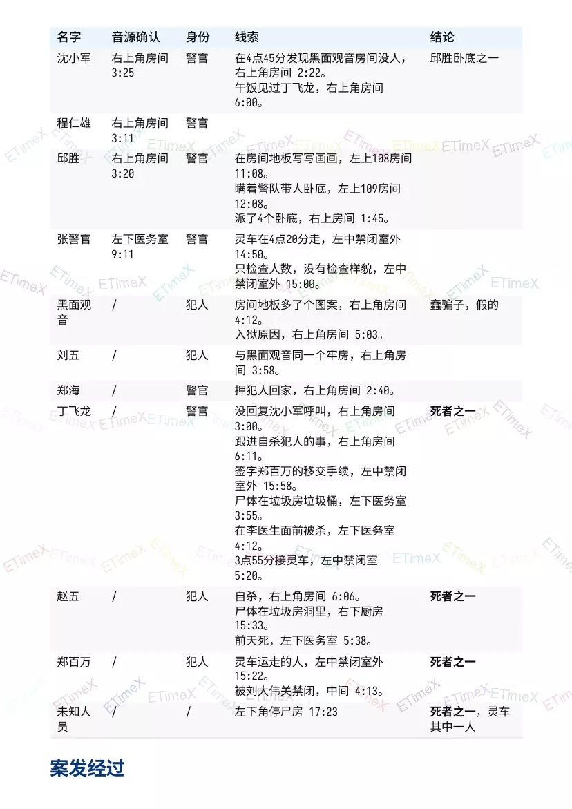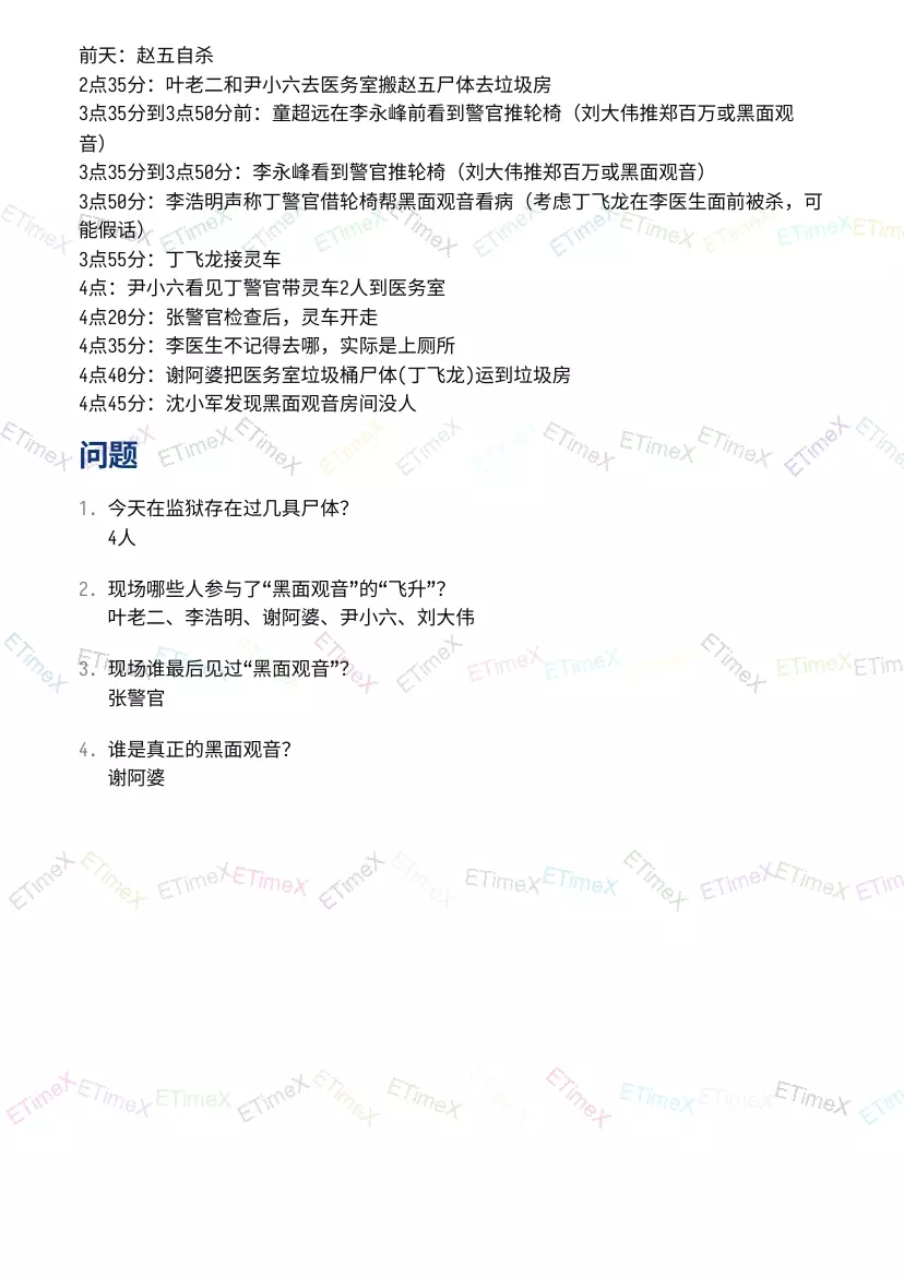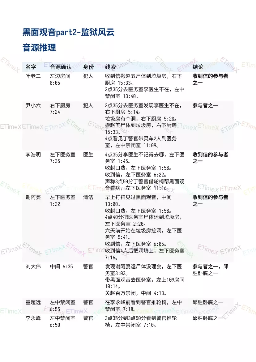 如何看懂?看表格应该会吧? 表格内容解析:获得的信息,游戏内地图位置,音频时间点。 例如:谢阿婆的线索,收封口费,左下医务室 1:58。 即在地图左下医务室 1:58的音频可以听到谢阿婆收封口费的内容。 最后的问题 以下3部分都比游戏内多一个问题。是通过【豪门风云】才出现的问题。 线索是通关音频播放的佛音,女声催眠【黑面观音】。 青旅风云