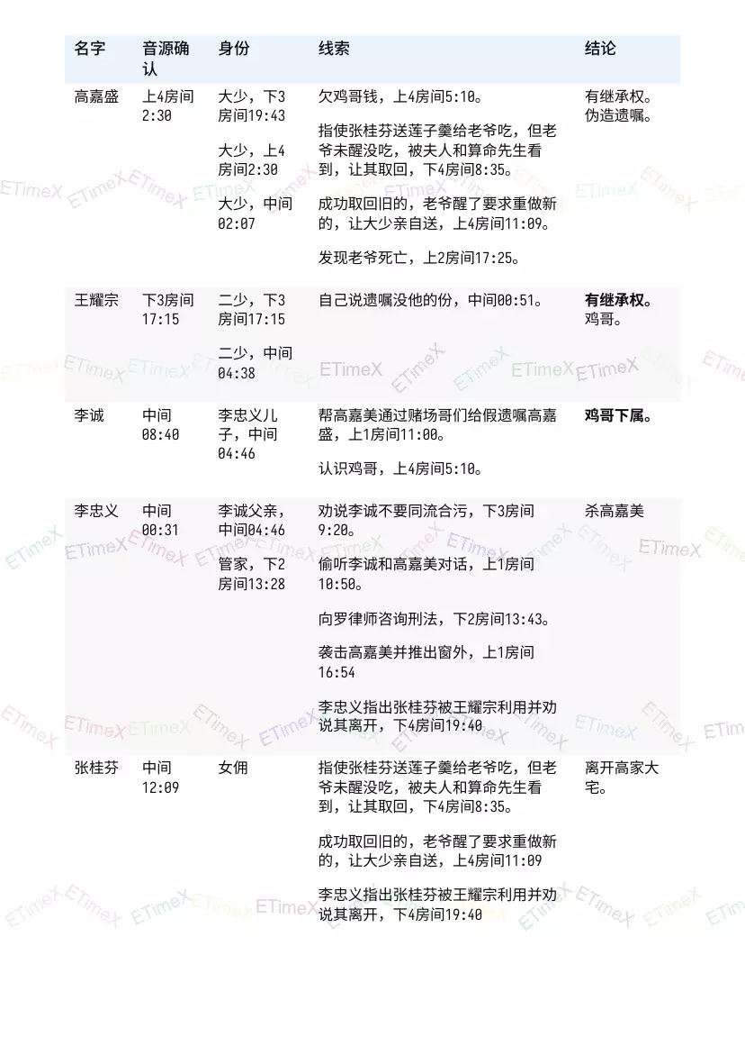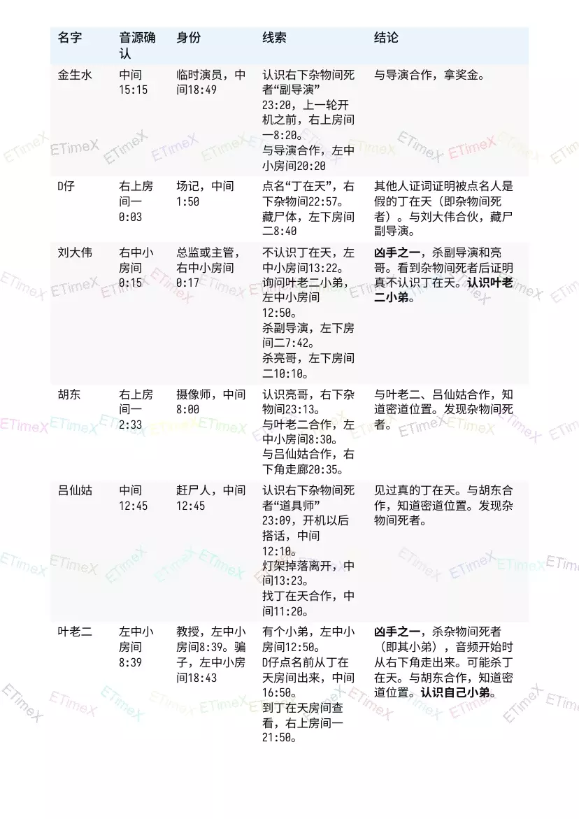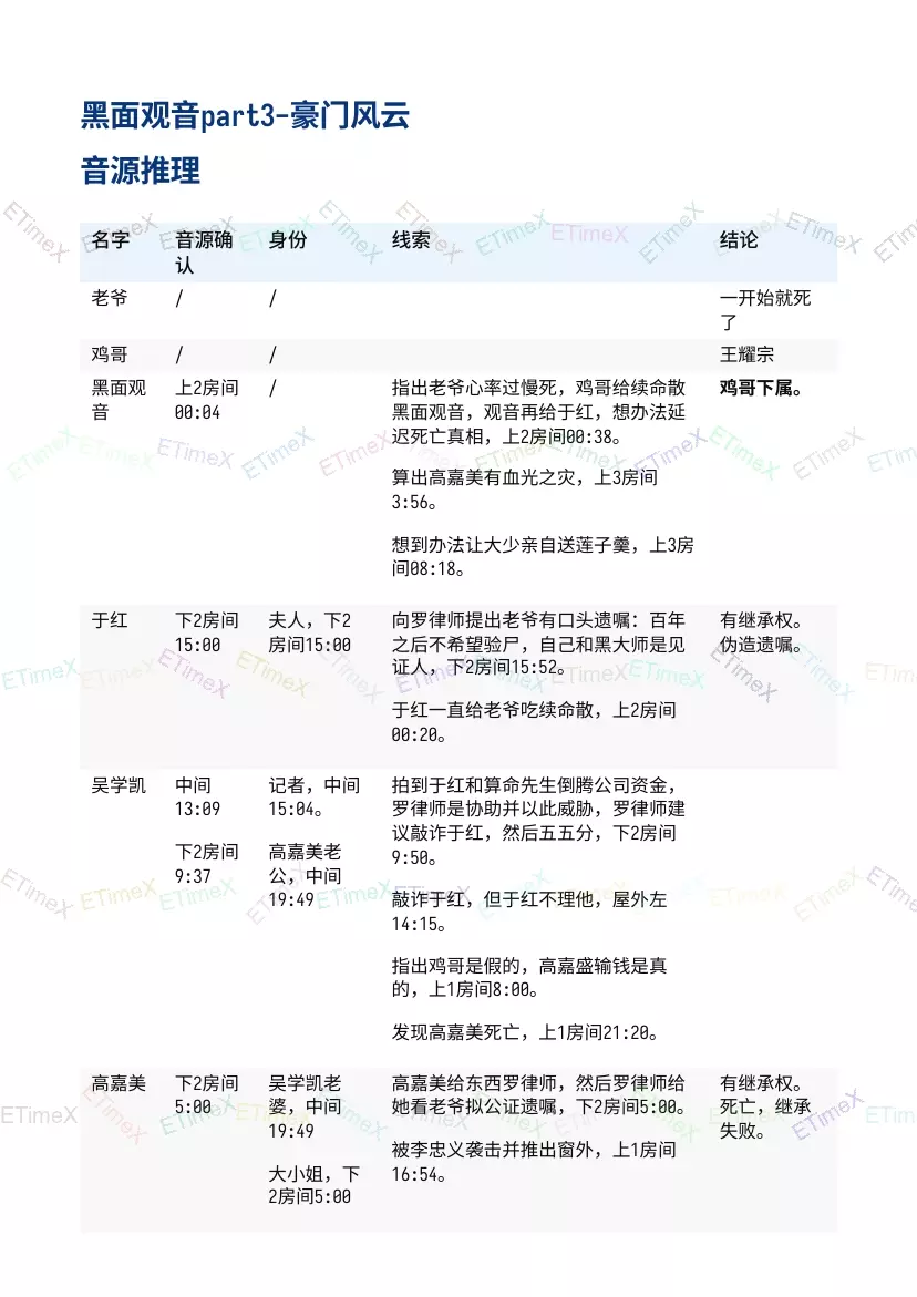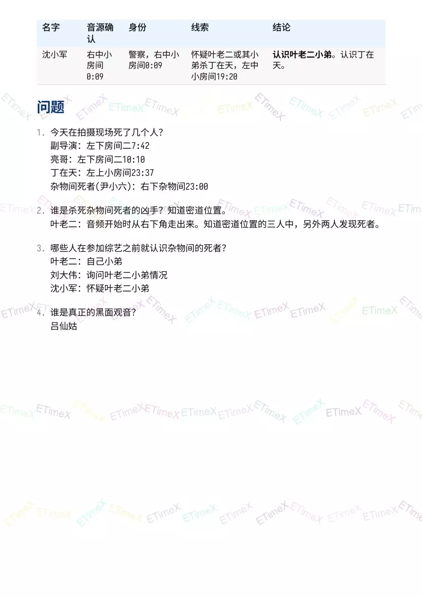 如何看懂?看表格应该会吧? 表格内容解析:获得的信息,游戏内地图位置,音频时间点。 例如:谢阿婆的线索,收封口费,左下医务室 1:58。 即在地图左下医务室 1:58的音频可以听到谢阿婆收封口费的内容。 最后的问题 以下3部分都比游戏内多一个问题。是通过【豪门风云】才出现的问题。 线索是通关音频播放的佛音,女声催眠【黑面观音】。 青旅风云