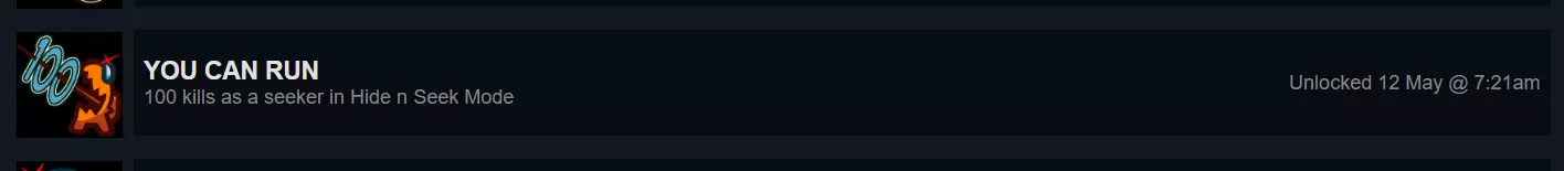 你可以跑 这个成就和下一个成就有点难,而且需要花时间才能解锁,不过我会告诉你一个技巧,让你很快就能完成。要达成这个成就,你需要在躲猫猫模式中作为搜寻者获得100次击杀。但每局游戏中成为搜寻者的几率非常低,会耗费大量时间,所以我的技巧是:或许你还不知道,如果你将游戏模式设为私人,就可以在躲猫猫模式的游戏设置中选择成为搜寻者。所以,你可以创建一个躲猫猫模式的房间,先设为公开让大家加入;当服务器中的总玩家数达到14或15人时,将模式改为私人,然后通过那个可以更改游戏设置的笔记本电脑之类的界面,将自己选为搜寻者,之后就可以开始大肆击杀所有人了。(这最多大约需要1小时)