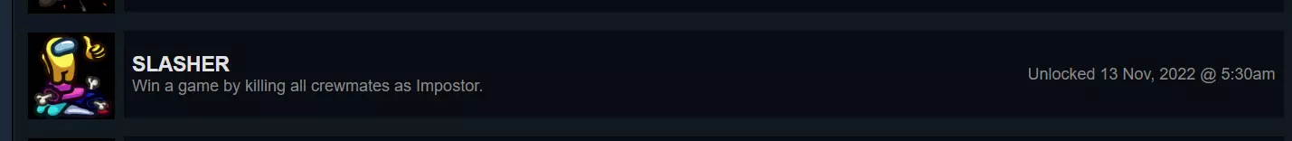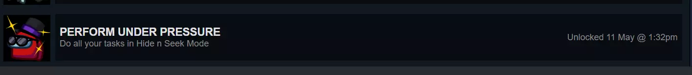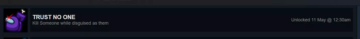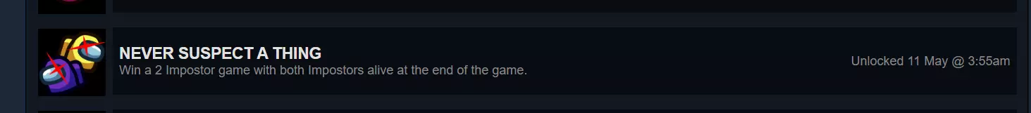 【NEVER SUSPECT A THING】 对于与朋友组队或使用多设备的玩家来说,这个成就非常简单:只需开启一场有2名内鬼的私人经典对局,击杀1名船员,确保你和另一名内鬼都存活即可获胜!(注意,完成此成就需要总共5名玩家才能开始对局)。 对于想独自完成的玩家,只需从菜单筛选中选择有2名内鬼的经典模式,只玩有2名内鬼的对局,直到你成为内鬼并与另一名内鬼一同存活获胜(这种方式可能需要一些时间)!此成就为隐藏成就。