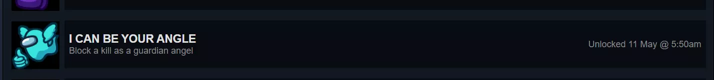我可以成为你的守护天使 这个成就也很简单,多试几次就能完成。找到一个开启了守护天使模式的对局。然后尝试成为第一个被淘汰的人,因为在这个模式下,第一个死亡的人会成为守护天使。你已经知道谁是内鬼了,因为是他淘汰了你,所以跟着他,比他稍微快一点,始终走在他前面,这样当他试图淘汰其他人时,你就能保护那个人,从而获得这个成就。
