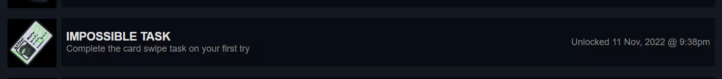 不可能的任务 这个成就多试几次就很简单。你必须在第一次尝试时成功完成管理员卡片刷卡任务;为此,你需要刷卡速度既不要太快也不要太慢。你可以先在练习模式中自行练习,然后进入公开游戏完成该任务以获得成就。此成就为隐藏成就。