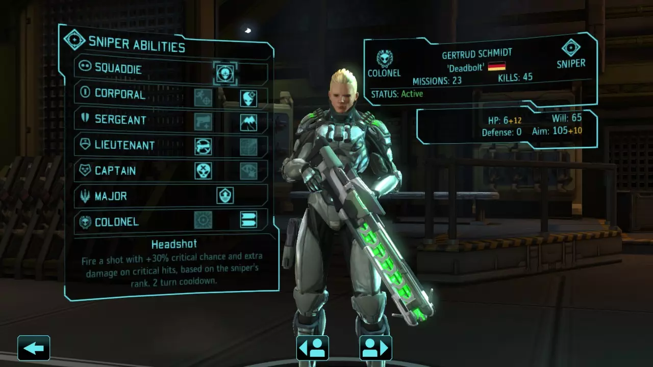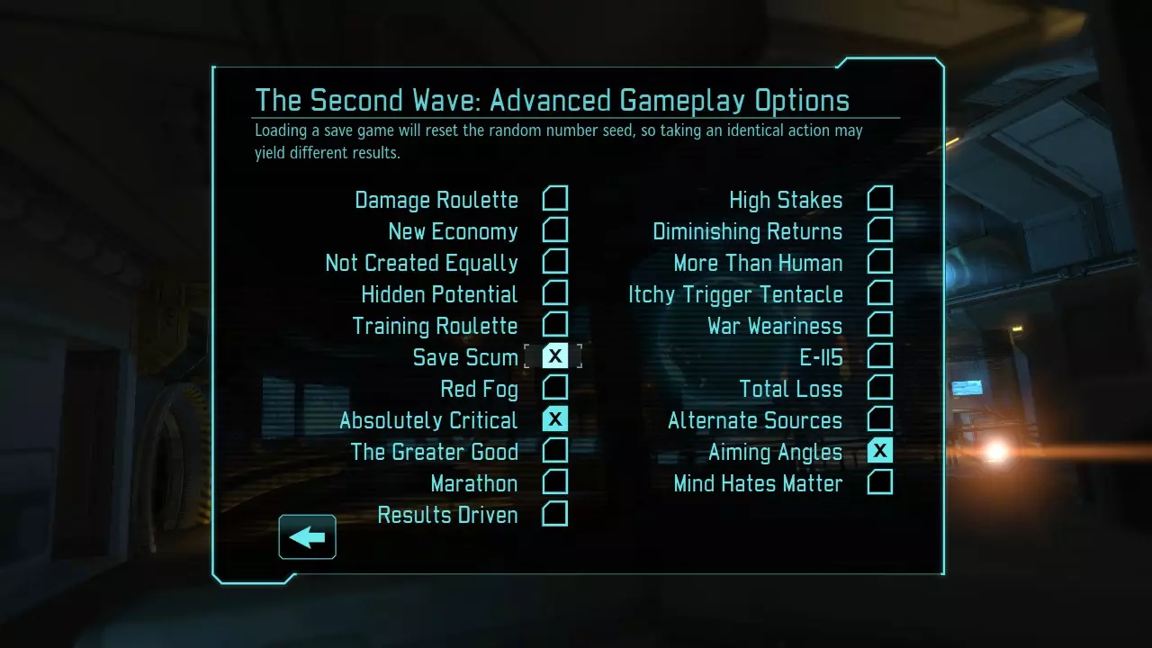 以“不可能”难度通关游戏。 不能在游戏最终阶段、最后一个任务前或倒数第二个任务期间切换难度,必须从开始就以“不可能”难度进行游戏。这很可能是你最艰难的一次游戏体验,因为在铁人模式中你可以通过存档读档来反复尝试。 游戏玩法提示 战前准备 第二波选项能让游戏更易上手: 【存档读档】:通过加载存档可以“重掷”射击结果 【绝对暴击】:侧翼攻击必定暴击 【瞄准角度】:侧翼攻击获得瞄准加成