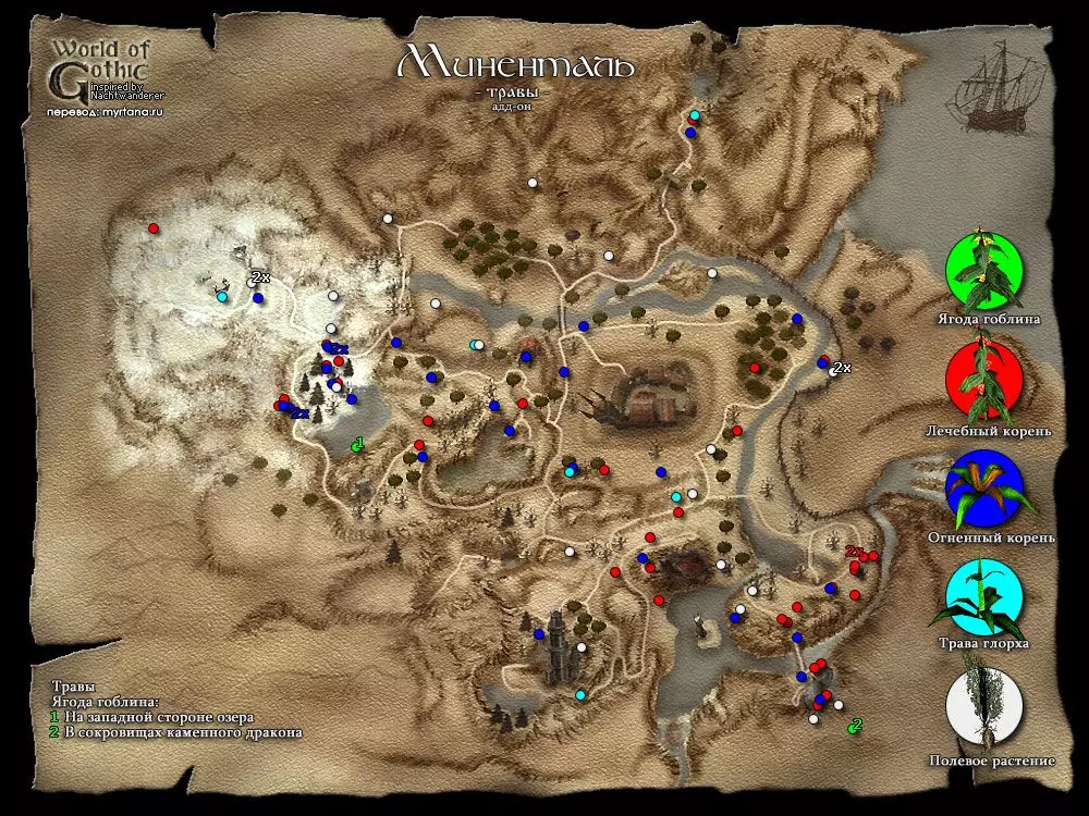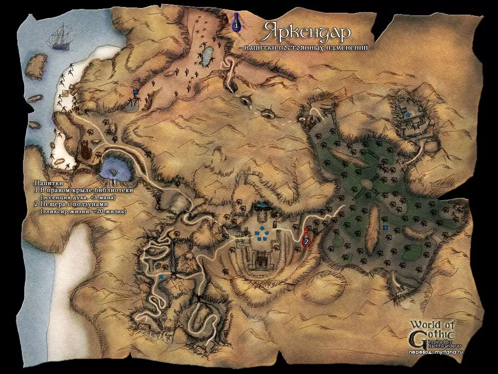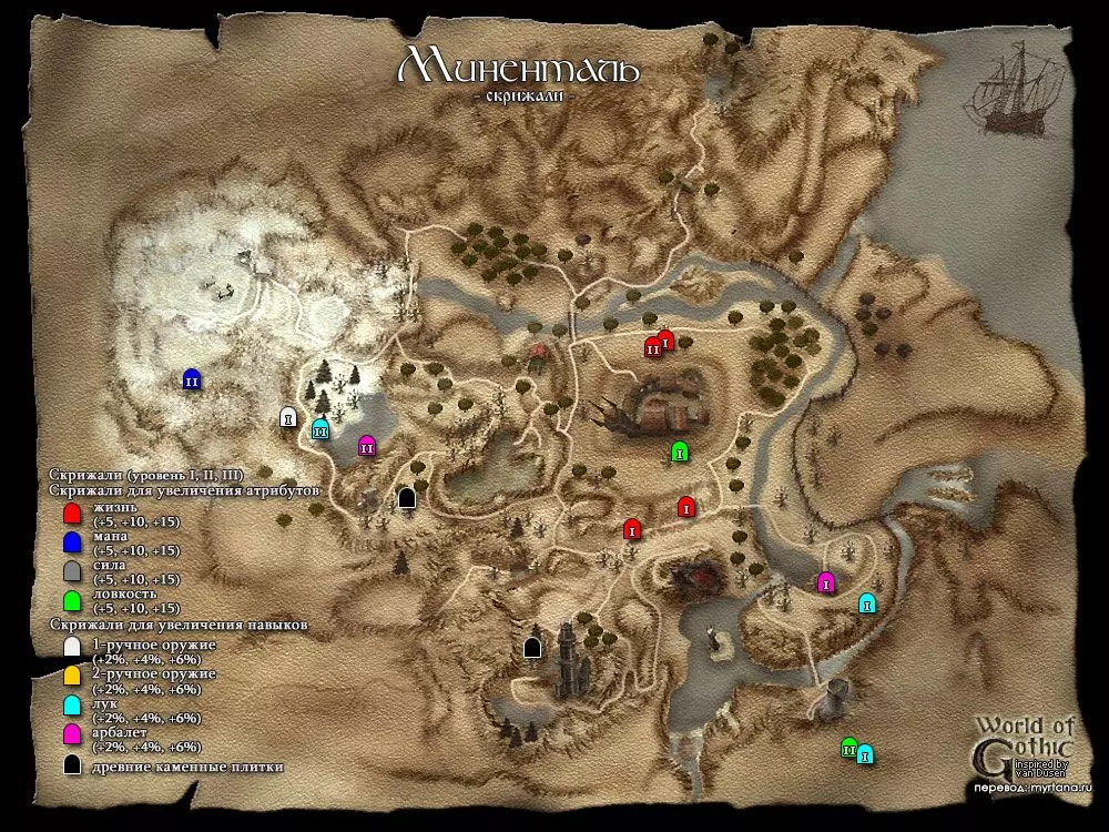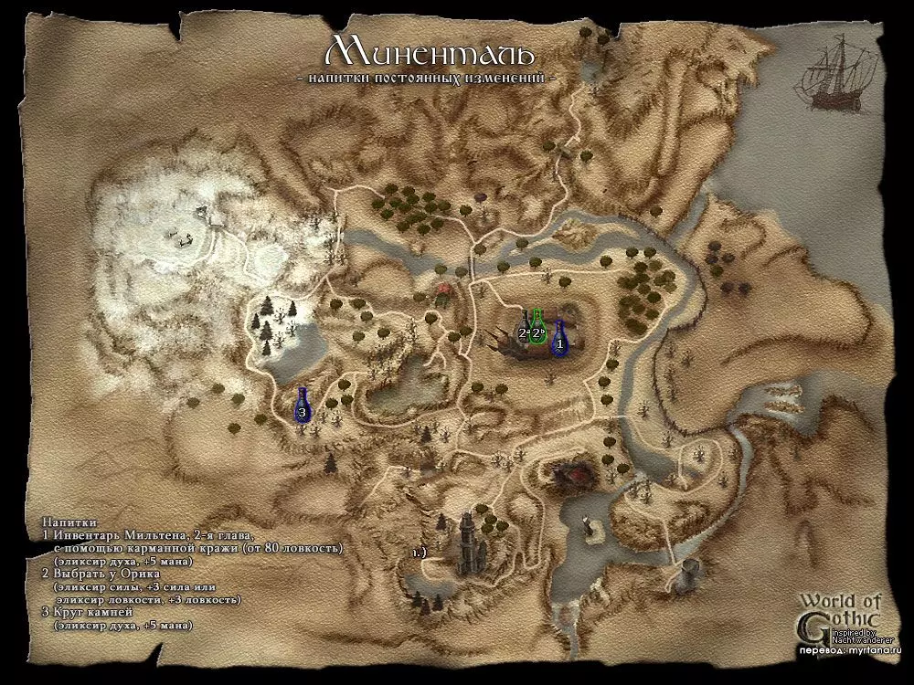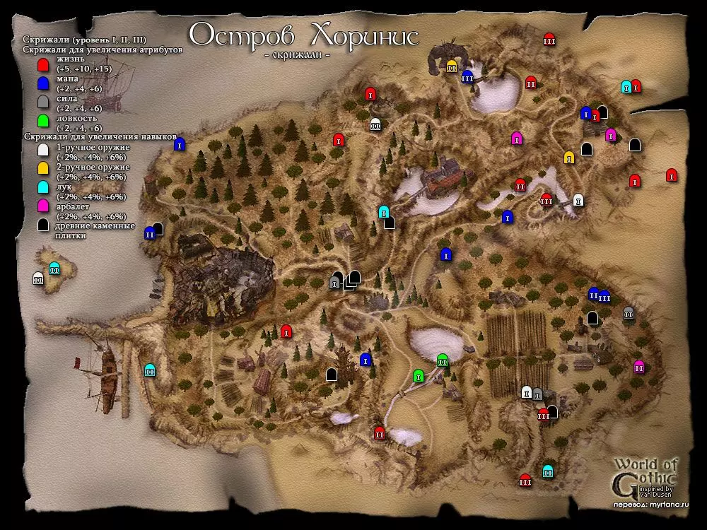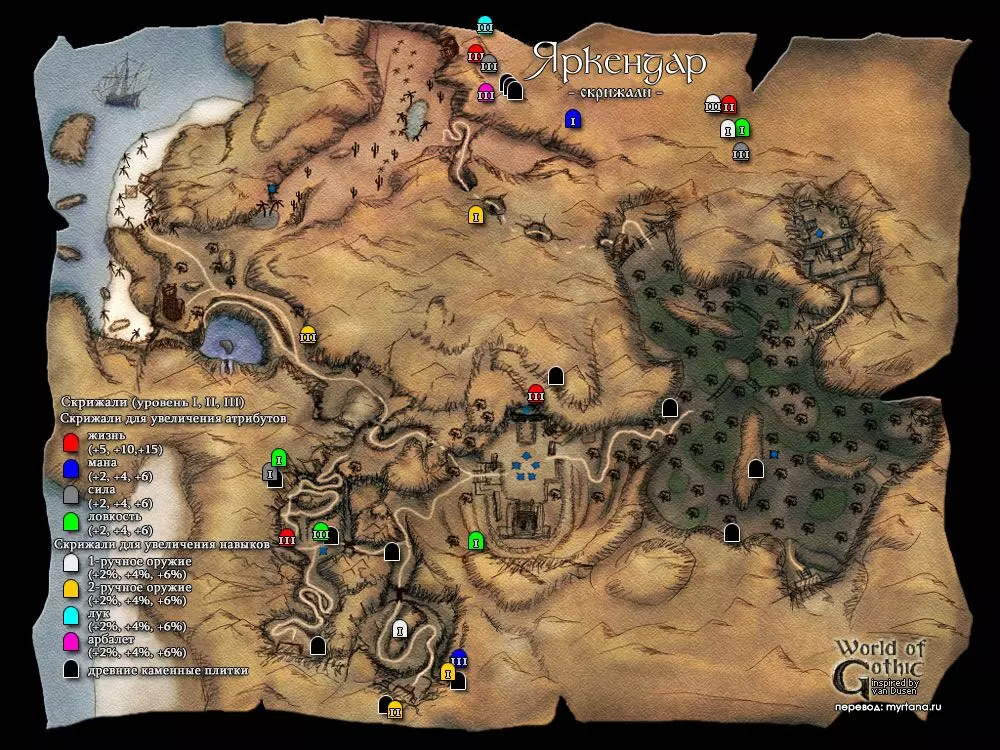 В чит режиме также доступны определенные ништяки. Активация режима B MARVIN B Затем через клавишу F2 вводим: insert statsbook появляется Книга статистики insert ch появляется помощник по персонажу у которого можно изучить за очки необходимые навыки, также получить книгу статистики, побыть бандитом. insert sh появляется помощник по сюжету у которого также можно произвести определенные настройки рекомендую отключить бесконечный опыт с призываемых скелетов рекомендую включить максимальный фиксированный опыт по главам, чтобы не откладывать сдачу квестов поставить прочие тонкие настройки на свое усмотрениеЧтобы выйти из чит-режима используйте то же сочетание клавиш, или сохранитесь и перезайдите в игру. Настоятельно рекомендую сразу же после активации нужных функций отключить чит режим, чтобы не портить себе игру! Нововведения аддона Ночь Ворона Дополнение добавляет кучу нового контента: Локация Яркендар Фракции Магов Воды, Пиратов, Бандитов Языки древних в виде каменных табличек, скрижалей и манускриптов Ремни, как новые типы брони персонажа Дополнительные ветки сюжета Изменения в системе учителей Кучу других мелочей, частично переименованы старые квесты, новое оружие, требования к оружию и баланс, броня, заклинания, монстры, трофеи, ништяки на крышах Хориниса, жемчужины и ракушки на пляже. Пролог География региона. Мир, в котором разворачиваются события серии игр Gothic называется Морград (нем. Morgrad), на нем расположен материк Мидленд (нем. Midland), где располагается королевство Робара II – Миртана. Рядом расположен остров Хоринис, где и будут разворачиваться события второй части игры. Остров Хоринис, представлен тремя локациями: Хоринис – город и окрестности Миненталь – Долина Рудников и в дополнении появился Яркендар – Долина ЗодчихДействующие лица Безымянный v.s. Мир древних богов, меча и магии и, конечно, войны. Войны с орками, драконами! Hail, Dovahkiin. Итак, вы попали. Попали в открытый мир. Как и любые настоящие герои вы вольны делать что угодно, идти куда угодно. На практике это означает, что если вы хотите выжить, а не попасться разбойникам, или стать обедом местным хищникам, то должны сначала обжиться, обрасти связями, освоить навыки выживания, а уж потом можете стать отважным искателем приключений. Я не буду рассказывать тонкости управления этой игры, загляните в настройки и все там увидите. Из того, что нужно знать – используйте клавишу Alt для того чтобы брать всю пачку предметов и Enter для обратного превращения из животных в человека. Почаще сохраняйтесь и имейте несколько сохранений, чтобы была возможность "откатить" прохождение назад, если вы запортачили прохождение одного из заданий. Да, и больше спите, это восстанавливает здоровье, если смотреть журнал, то видно игровое время и за сутки поспать можно несколько раз! Итак, вступительный ролик, наши магические доспехи, да и все что было нажито непосильным трудом в первой части благополучно исчезло с синим дымком, мир нужно спасать от новой угрозы. А воевать нечем, да и силенок у Безымянного поубавилось. Я не обещаю, что будет легко, особенно, если вы играете в Gothic II в первый раз, позаботитесь, чтобы под вами был несгораемый стул заранее. Да – это Глава I "Угроза"! Атрибуты Каждое существо в игре Gothic имеет следующие типы атрибутов: Характеристики Защита Навыки•ХарактеристикиСила, отвечает за урон и 