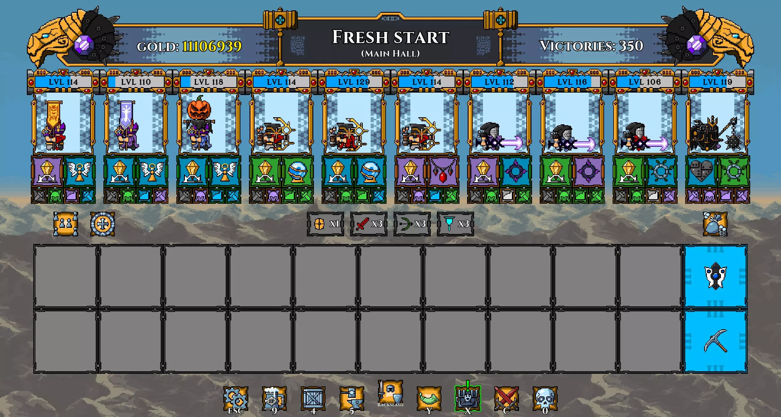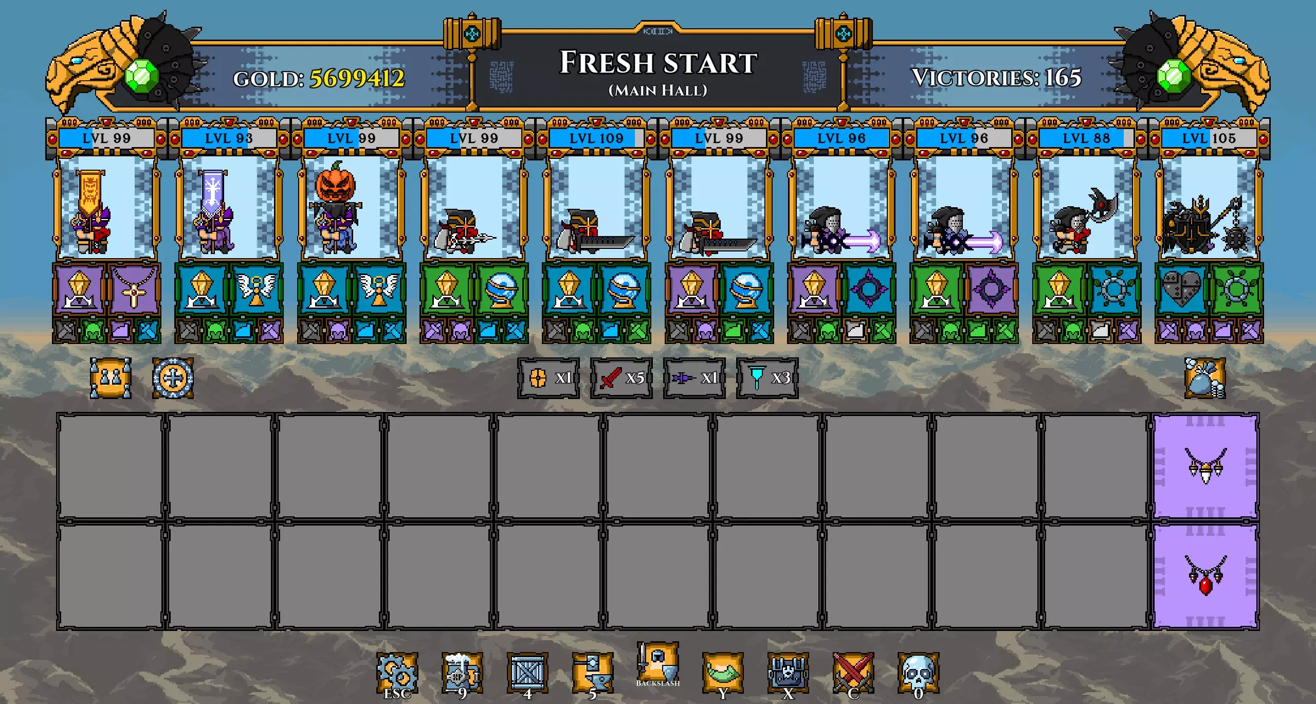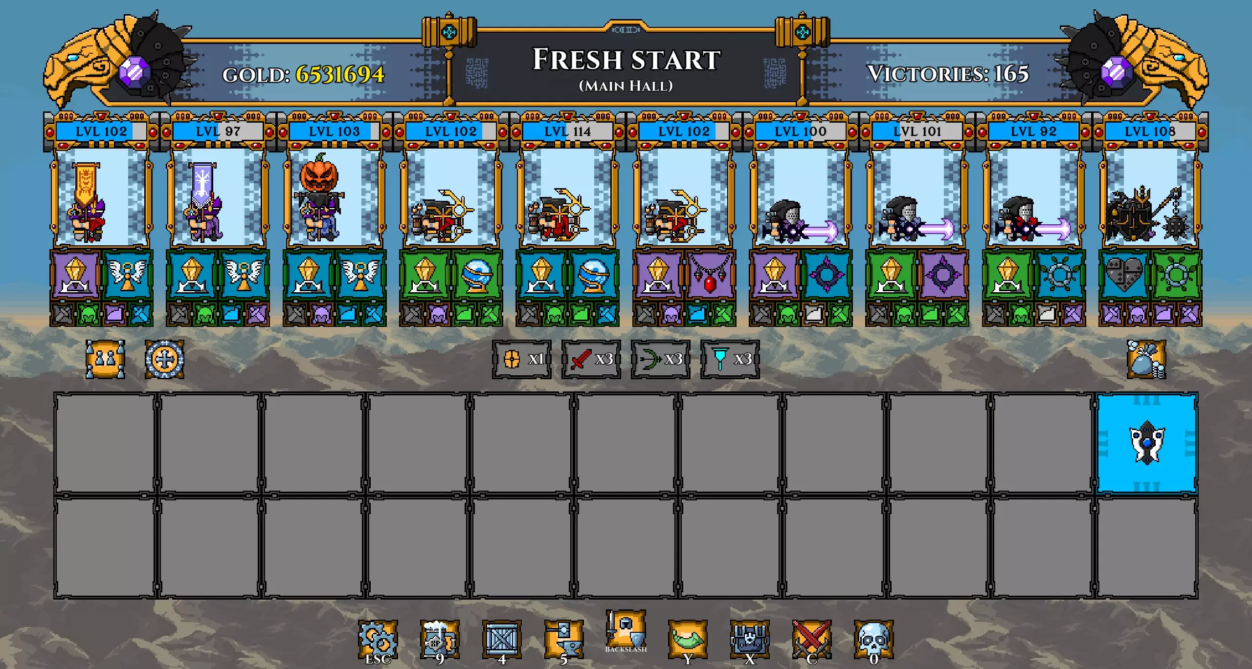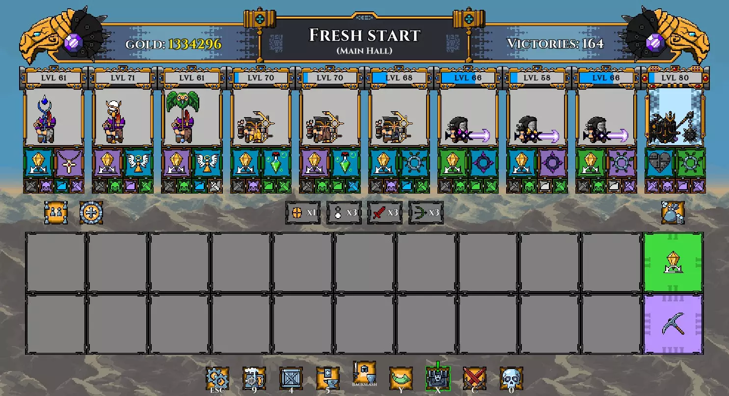 注意: 我已将坦克的武器更换为黄金长矛(以施加流血效果)。 我还再次更换了矮人,以便通过神器正确提升他们的等级。 在第100波时招募暗影冠军,并使用两个提供 stamina(耐力)的神器尽可能提升其等级。你的阵容现在应如下所示: