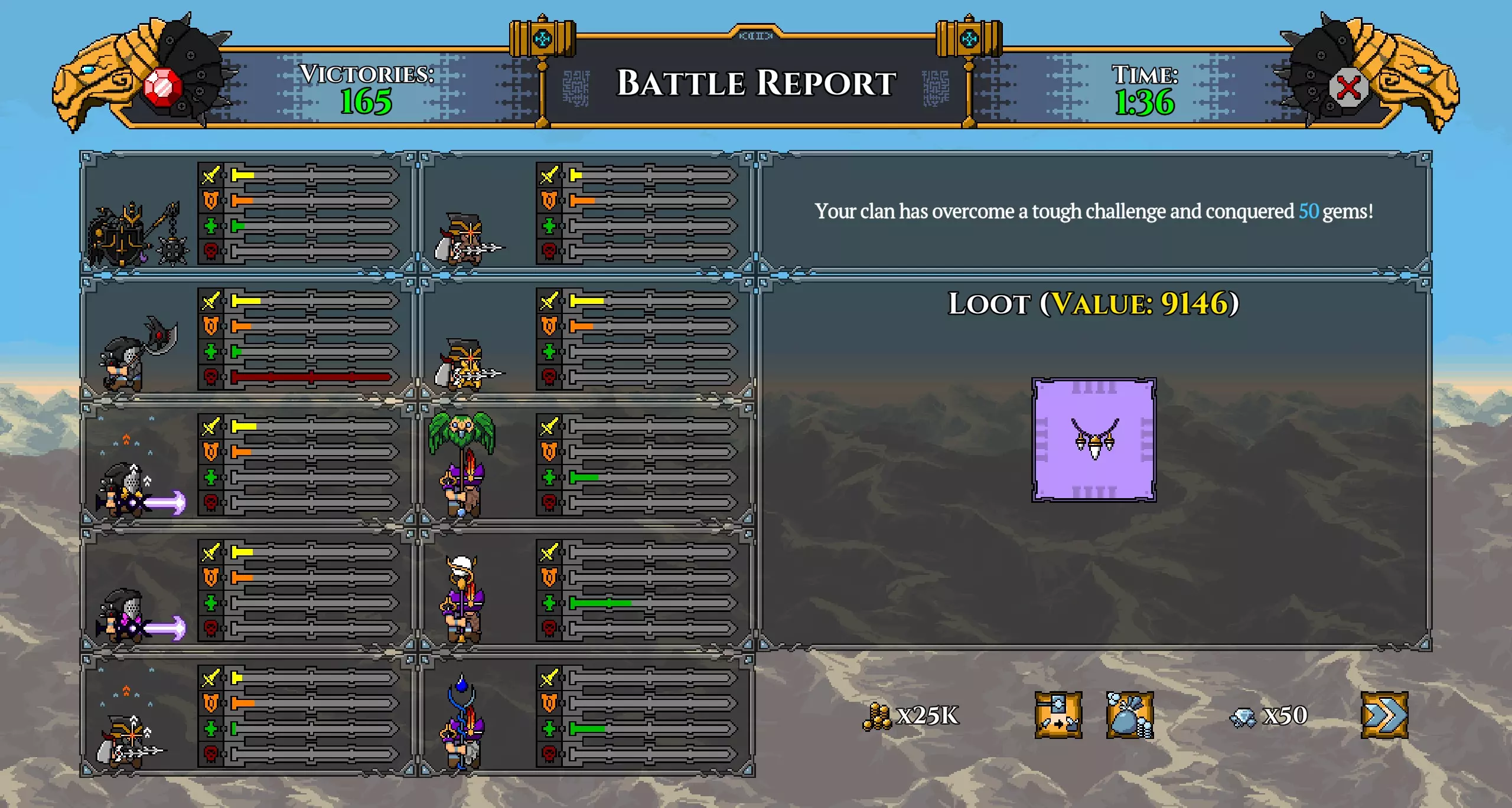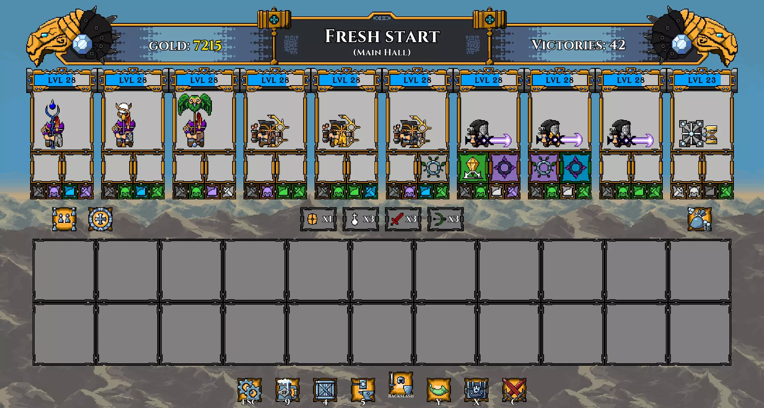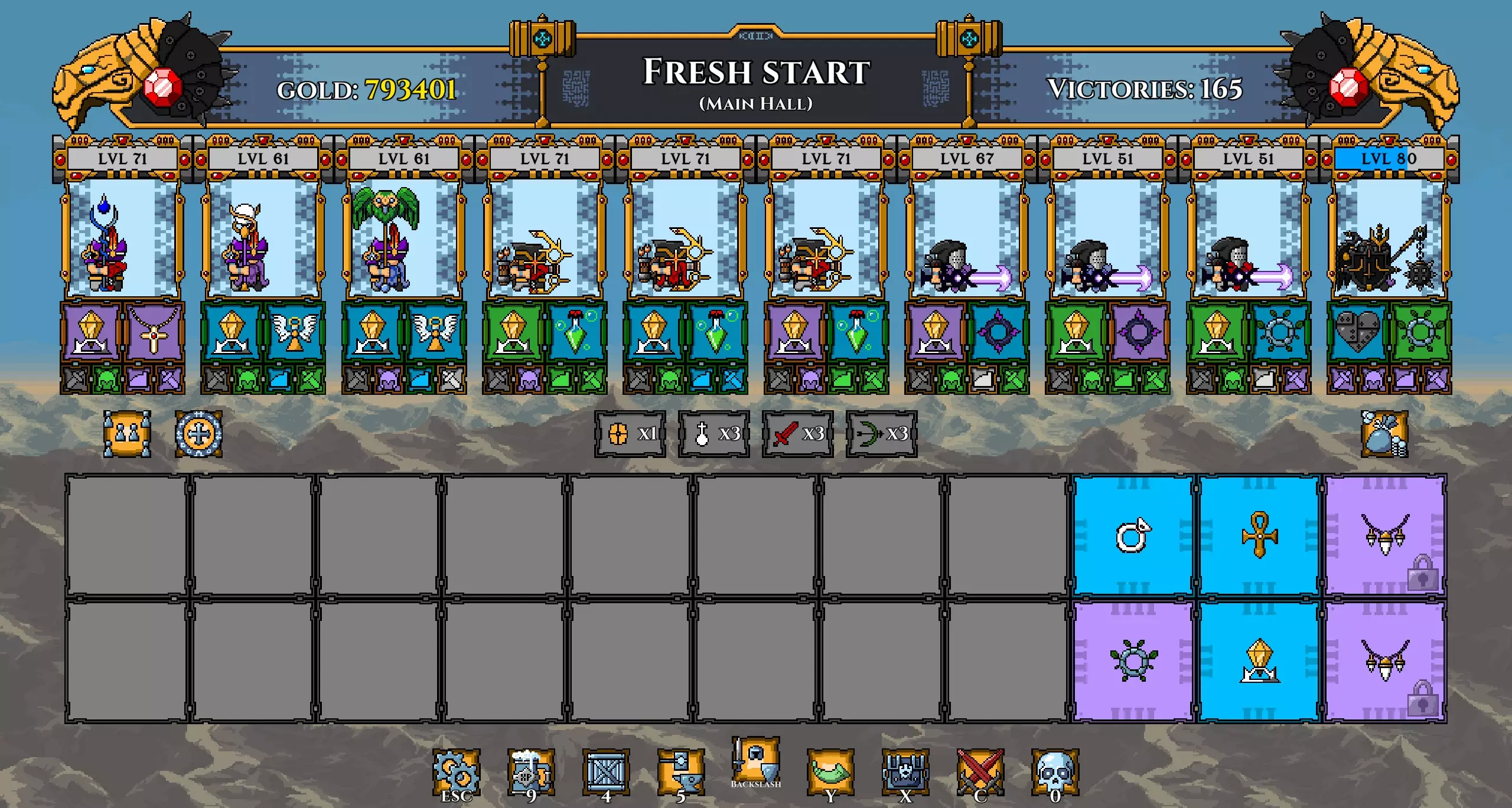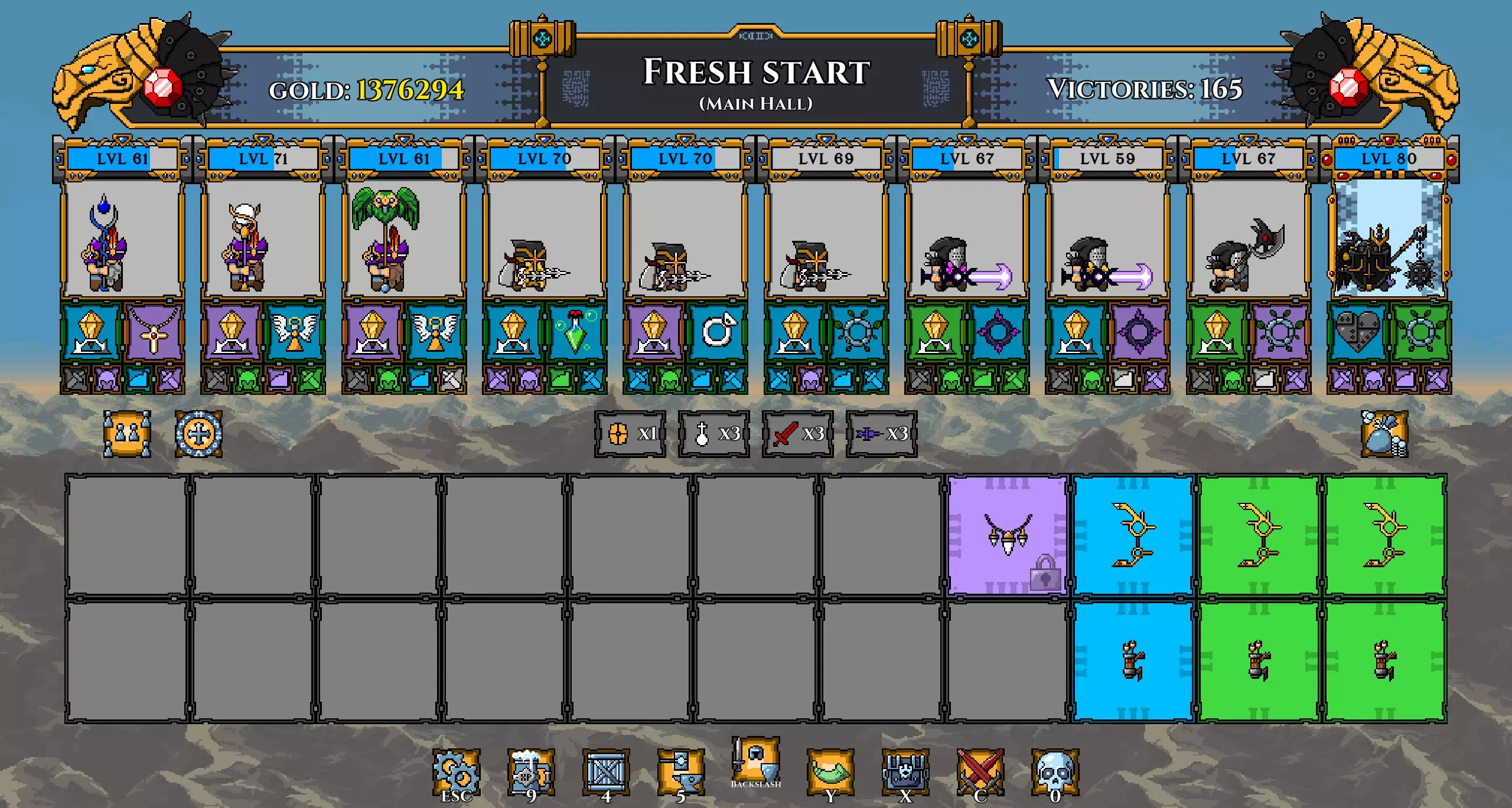 注意: 我已将坦克的武器更换为黄金长矛(以施加流血效果)。 我还再次更换了矮人,以便通过神器正确提升他们的等级。 在第100波时招募暗影冠军,并使用两个提供 stamina(耐力)的神器尽可能提升其等级。你的阵容现在应如下所示: