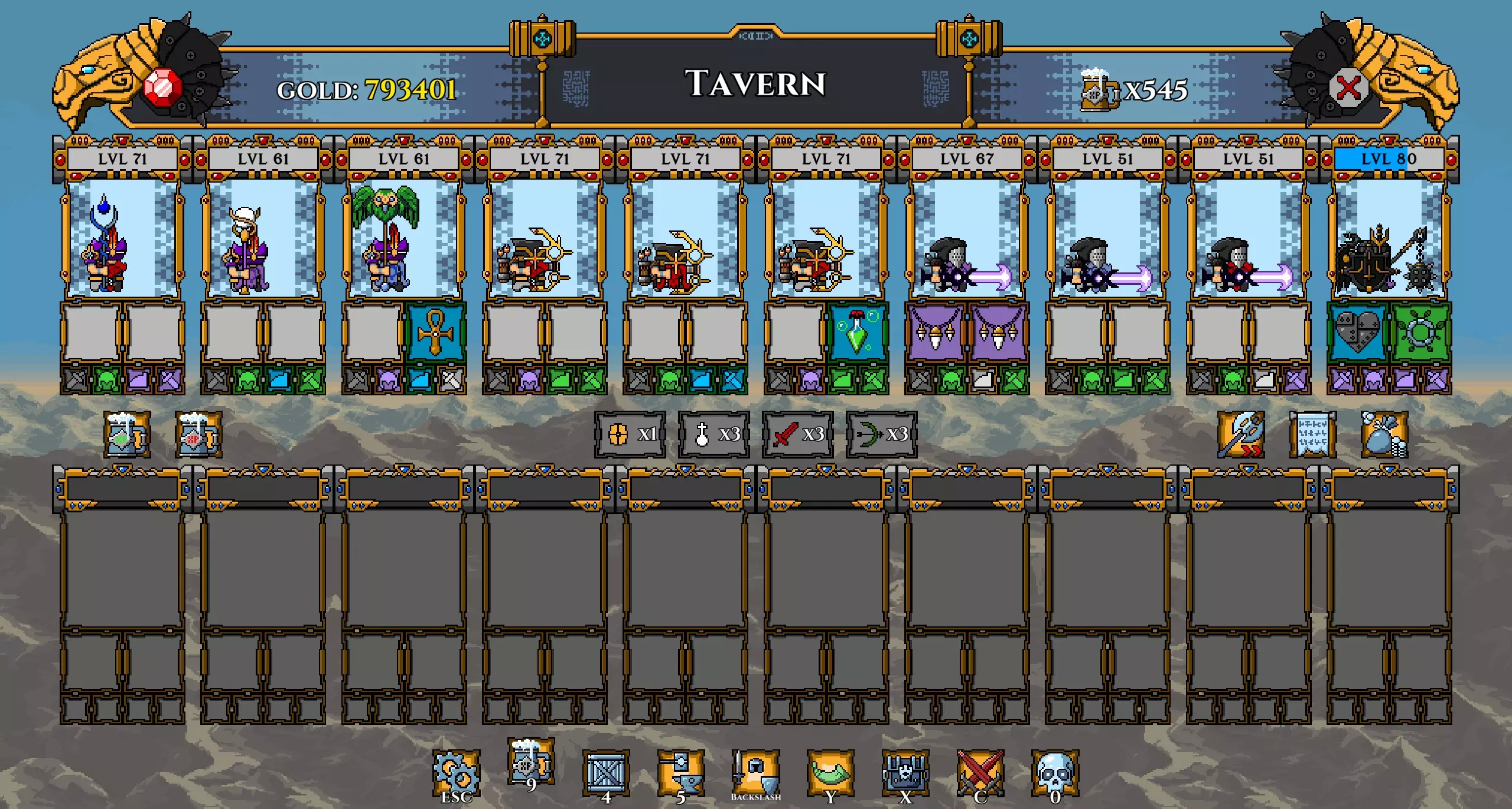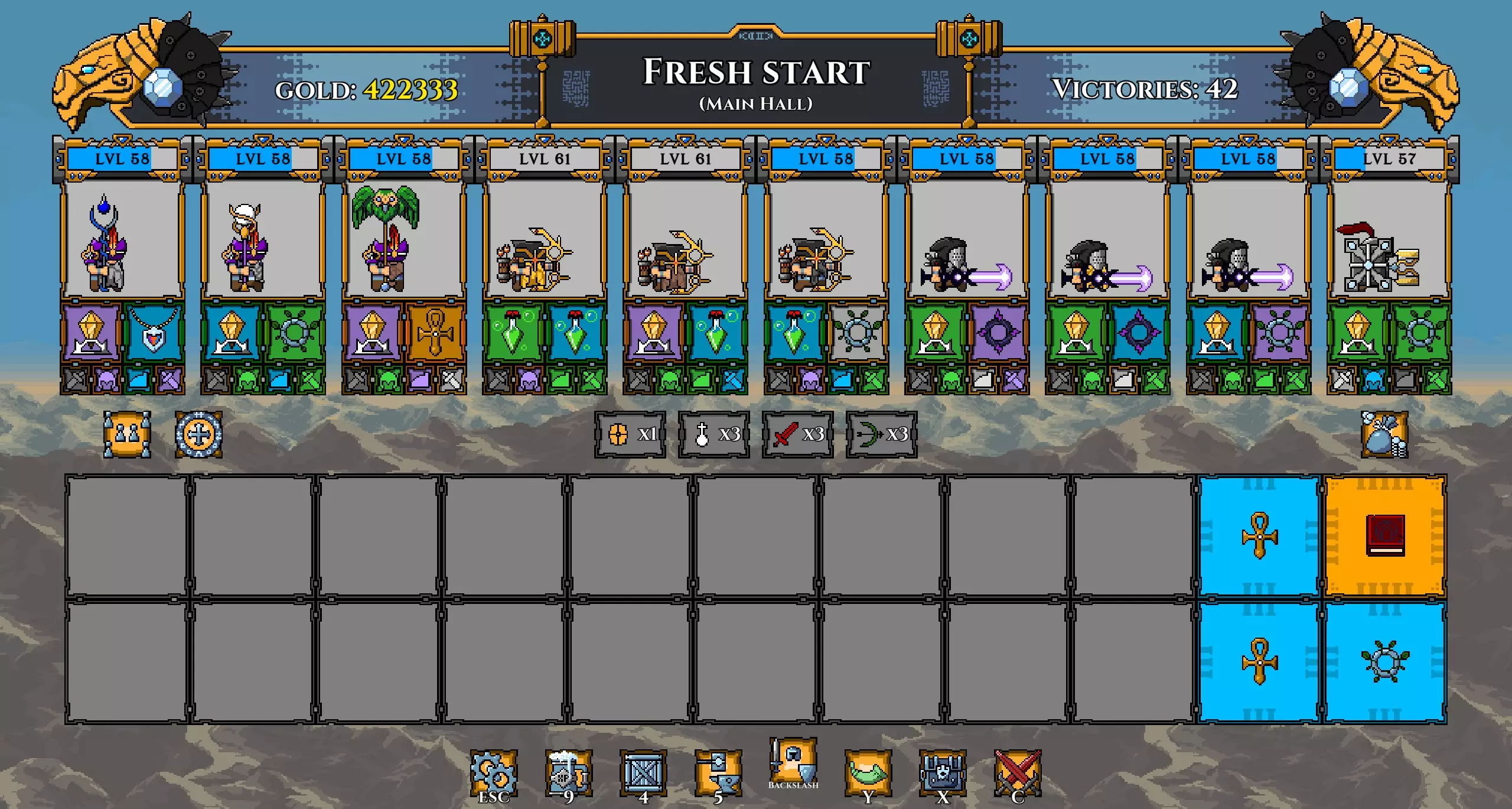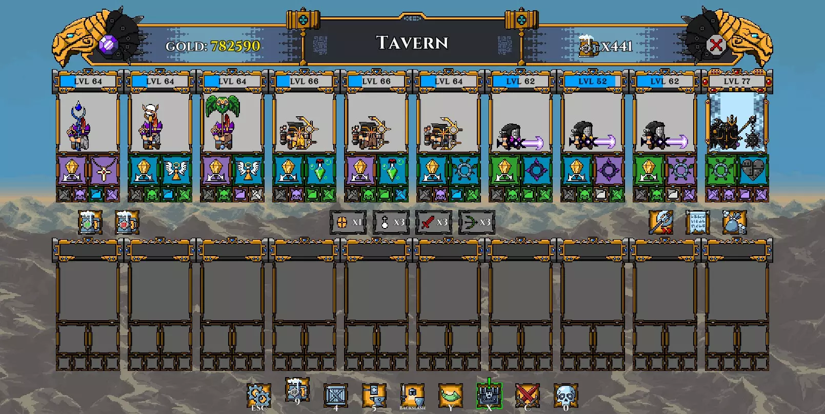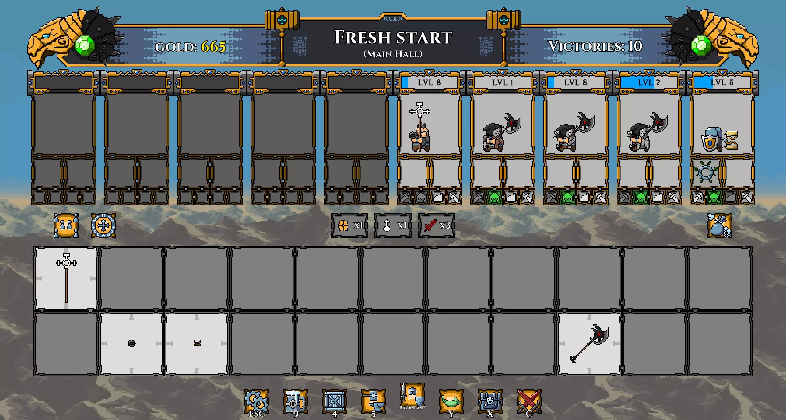 注意: 我已将坦克的武器更换为黄金长矛(以施加流血效果)。 我还再次更换了矮人,以便通过神器正确提升他们的等级。 在第100波时招募暗影冠军,并使用两个提供 stamina(耐力)的神器尽可能提升其等级。你的阵容现在应如下所示: