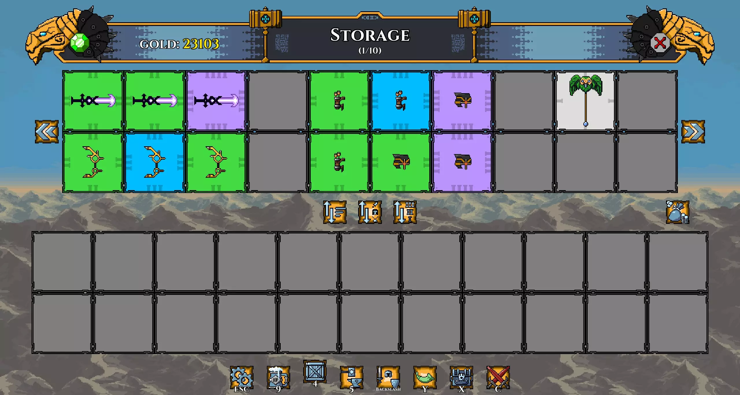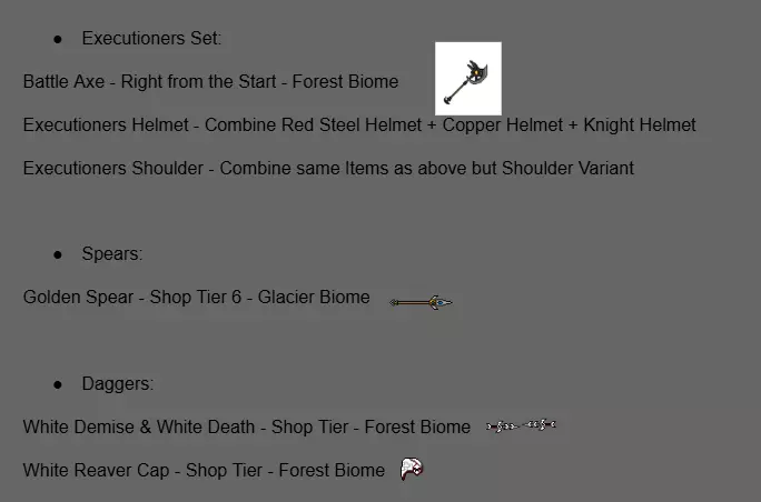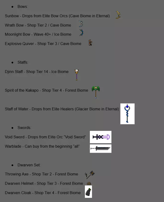 现在你可以在酒馆卖掉那些矮人,获得足够的金币和啤酒来购买10个新矮人并为他们配备一些装备。切换生物群系以获取所有装备(别忘了升级商店)。在指南末尾你会找到所有所需物品的列表(以及获取地点)。这可能是你首先要购买的装备: