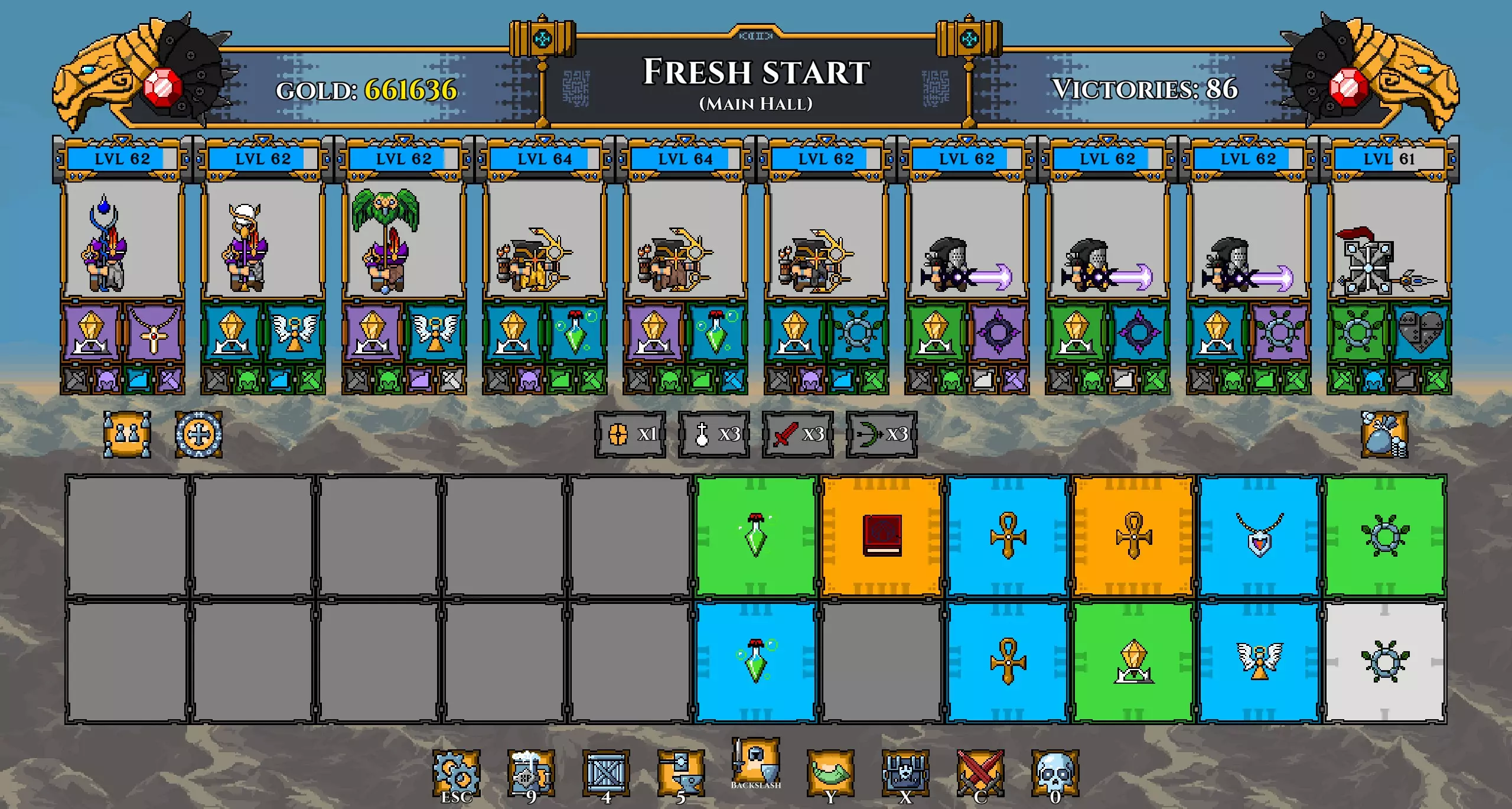 小贴士: 为刷新商店设置一个热键,然后同时点击刷新按钮和热键。这将帮助你快速刷新商店以获取好的神器(我喜欢先获取大量神圣水晶)。 现在招募一些新的矮人,并用新获得的神器提升他们的等级(使用那些提供属性加成的神器)。 达到第100波以上。 我顺利推进到了第86波。现在我会确保切换生物群系并收集那些免费神器。我仍然需要像大天使雕像、神圣水晶和 sanctified amulet 这样的神器。 注意: 之后你还需要收集一些魔力宝珠(目前尚未解锁)。 氏族配置如下: