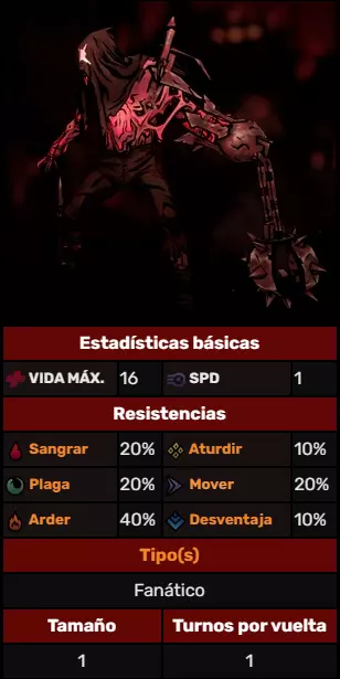 鞭笞者使用连接在其左臂上的带刺巨型金属球和锁链进行攻击。他穿着黑色裤子和黑色兜帽,未穿衬衫。左臂肩膀上还戴着一个巨大的金属护肩,右腿则有金属条保护。 未进入充能状态时,鞭子会造成中等伤害,并可能将你的后排英雄击退。一旦充能,鞭笞者就会成为严重威胁。他会获得【地狱工头】技能,这是一种残酷的劈砍攻击,会造成压力值和燃烧效果。在鞭笞者充能前将其击败非常重要。