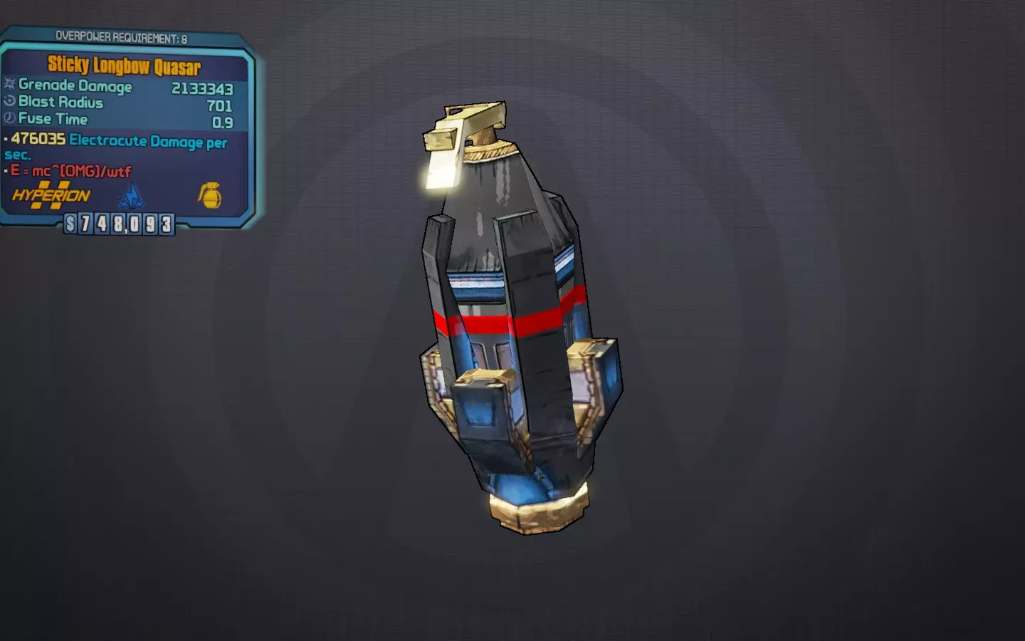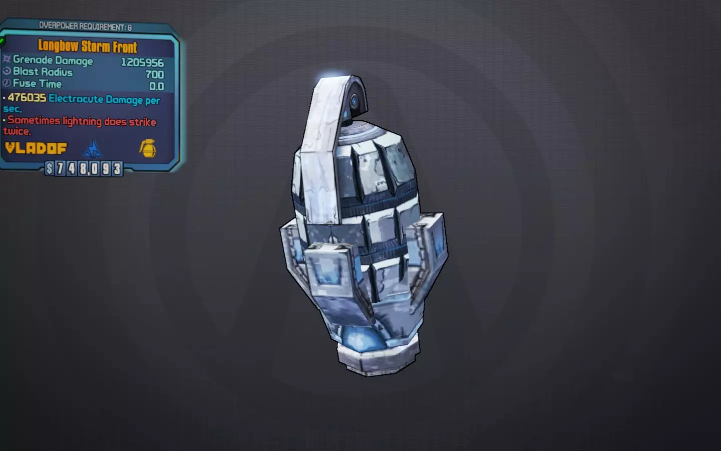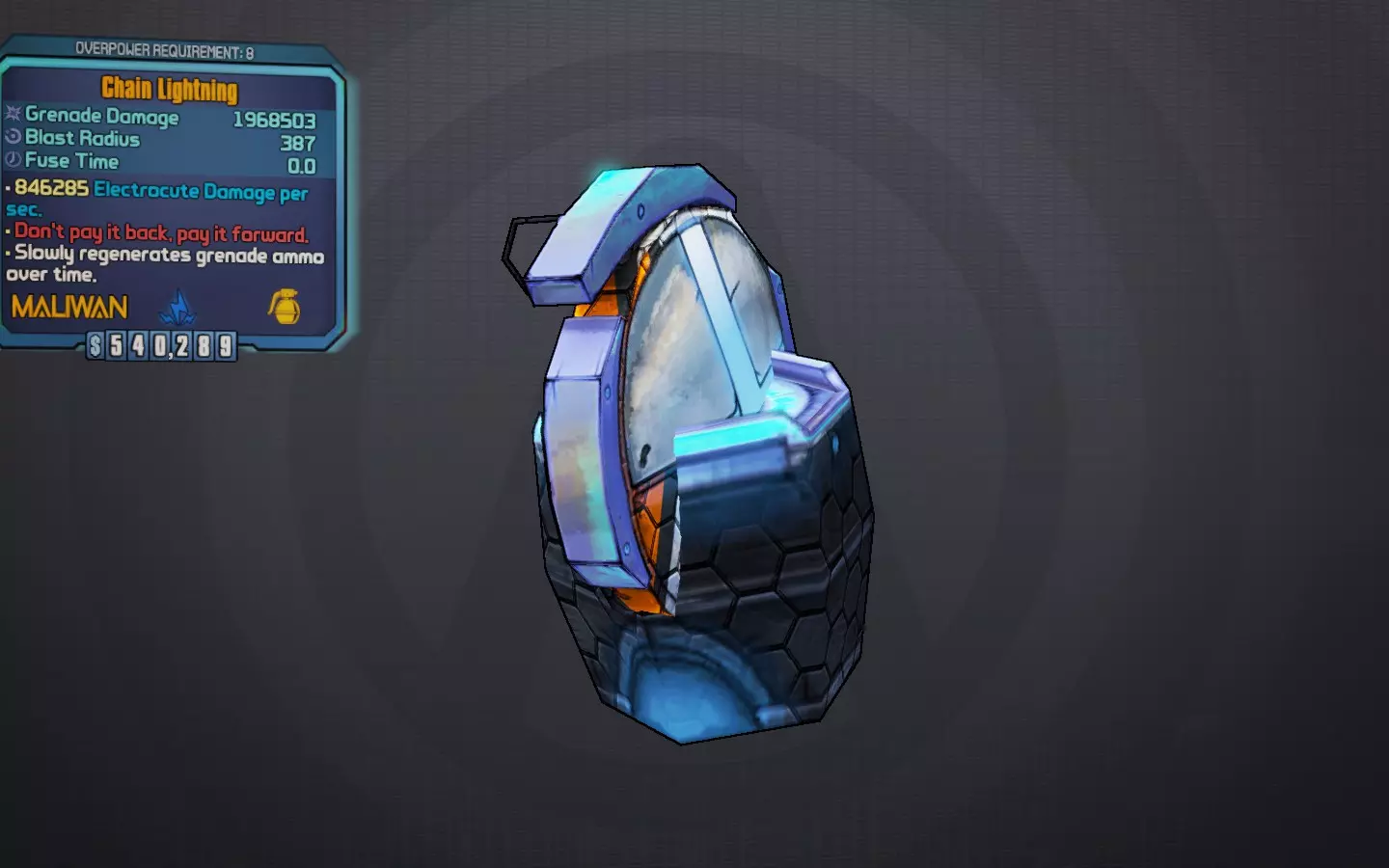 连锁闪电 无需偿还,传递下去。 大家最爱的电击手雷!连锁闪电是蒂娜DLC中蓝色“闪电”手雷模组的传奇版本。它总是以即时(0.0)引信时间生成,并且能被动回复手雷弹药,使其成为游戏中最出色、最灵活的手雷之一。投掷时,它会释放一道闪电,并在附近所有敌人之间连锁,包括烦人的潜行者和侦察机。凭借其高额基础伤害,它不仅能提供即时治疗,还能剥离护盾。 最佳引信:始终为即时 最佳元素:始终为电击 获取途径:在《无主之地2》的小缇娜DLC中,由精英巫师掉落;我强烈建议尝试龙堡中的祭坛来持续刷新它们。 其他值得注意的: