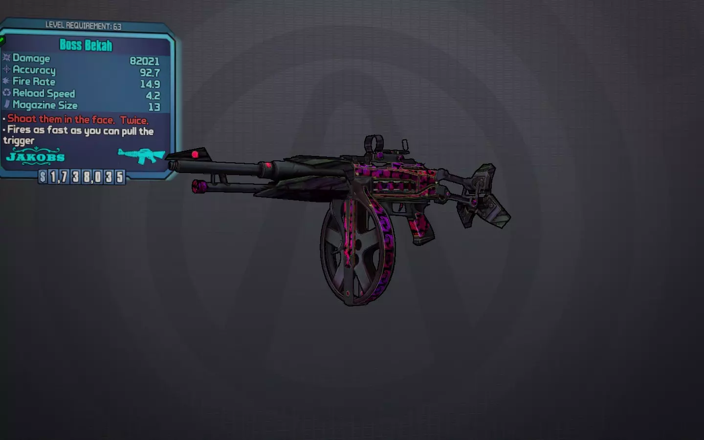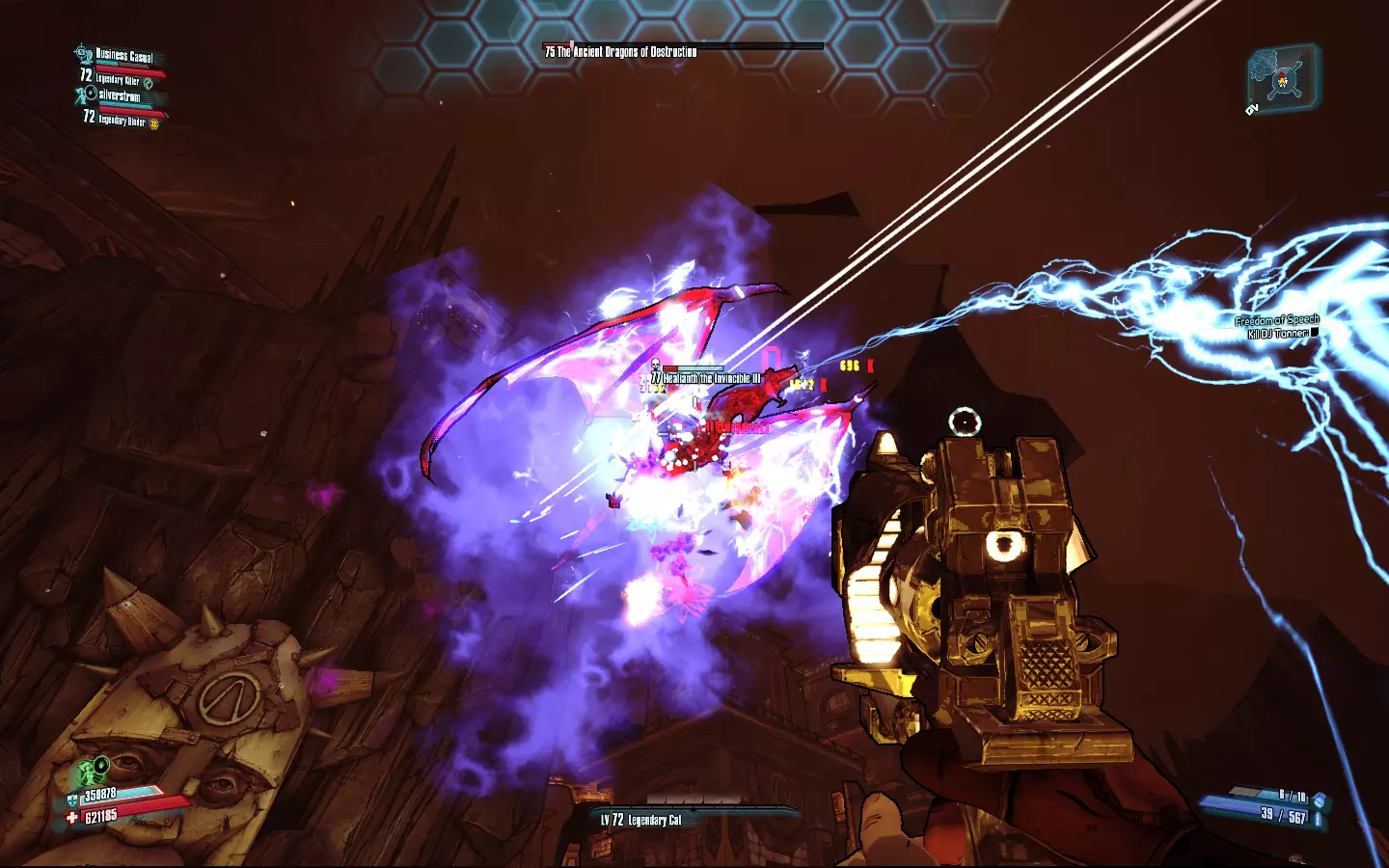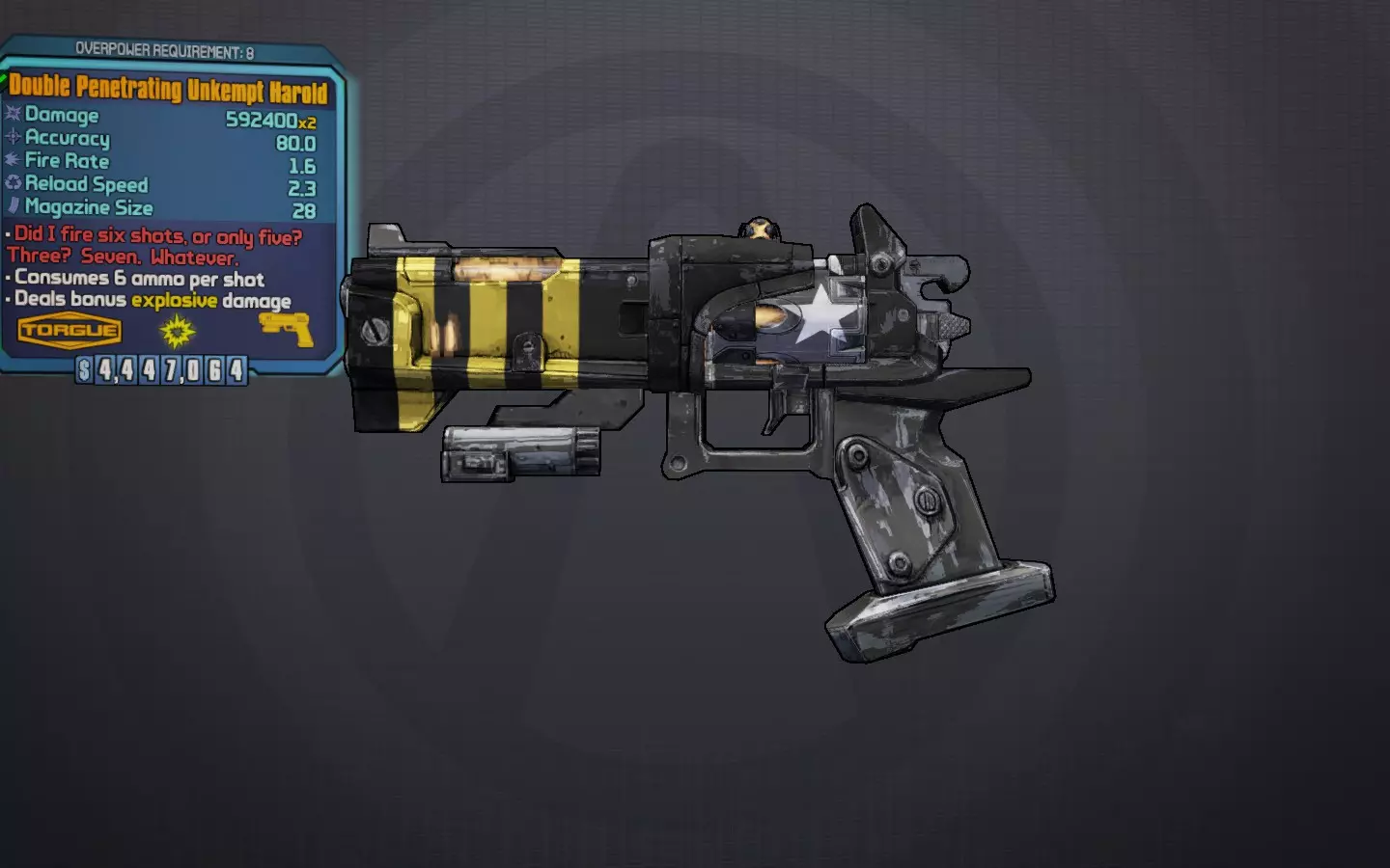 不羁哈罗德 我开了六枪,还是五枪?三枪?七枪。管他呢。 一把厚重的传奇托格手枪,每次射击消耗3发弹药(双发穿透版本消耗6发),发射7枚缓慢移动的子弹,这些子弹会在水平方向上大范围分裂。所有7枚子弹都带有未显示在面板上的溅射伤害,能充分发挥蜜蜂护盾的效果。它是游戏中伤害最高的手枪,而且必定为爆炸属性,因此对所有敌人都有毁灭性的效果。子弹移动速度足够慢,如果你射击一次后切换到啜泣者/鲁比,就能立即回满生命值。虽然这是一把非常可靠的枪,但它的弹药消耗极快,因此最好与沙鹰或其他非手枪类武器搭配使用。“双重”前缀看似多余,但对于OP等级来说是必要的。 最佳前缀:双重穿透 最佳元素:始终选择爆炸元素 最佳配件:托格握把 获取途径:在三 horns 峡谷击败萨维奇·李掉落,或在托格DLC中的托格商店作为每日商品出售 值得一提:
