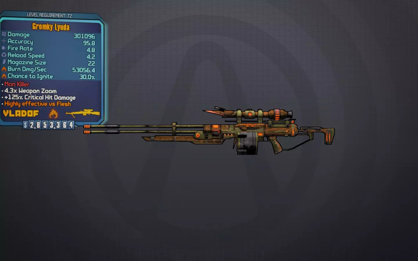 鲁达(Lyuda) 这把传奇弗拉多夫狙击枪是我最喜欢的狙击枪系列——弗拉多夫德鲁格的终极版本。它拥有极高的射速、较低的后坐力,其传奇版本会分裂成3发子弹,同时提升伤害和暴击加成。对于那些拥有易命中暴击部位的敌人和 Boss 来说非常出色,但缺点是“糟糕,我没弹药了!”的情况会经常发生。 最佳前缀:格罗姆基、斯科雷、拉兹雷兹 最佳元素:腐蚀、火焰、电击 最佳配件:弗拉多夫枪托、弗拉多夫握把 获取途径:在“好人、坏人、莫迪凯”任务期间,由沙尘区的盖特尔掉落