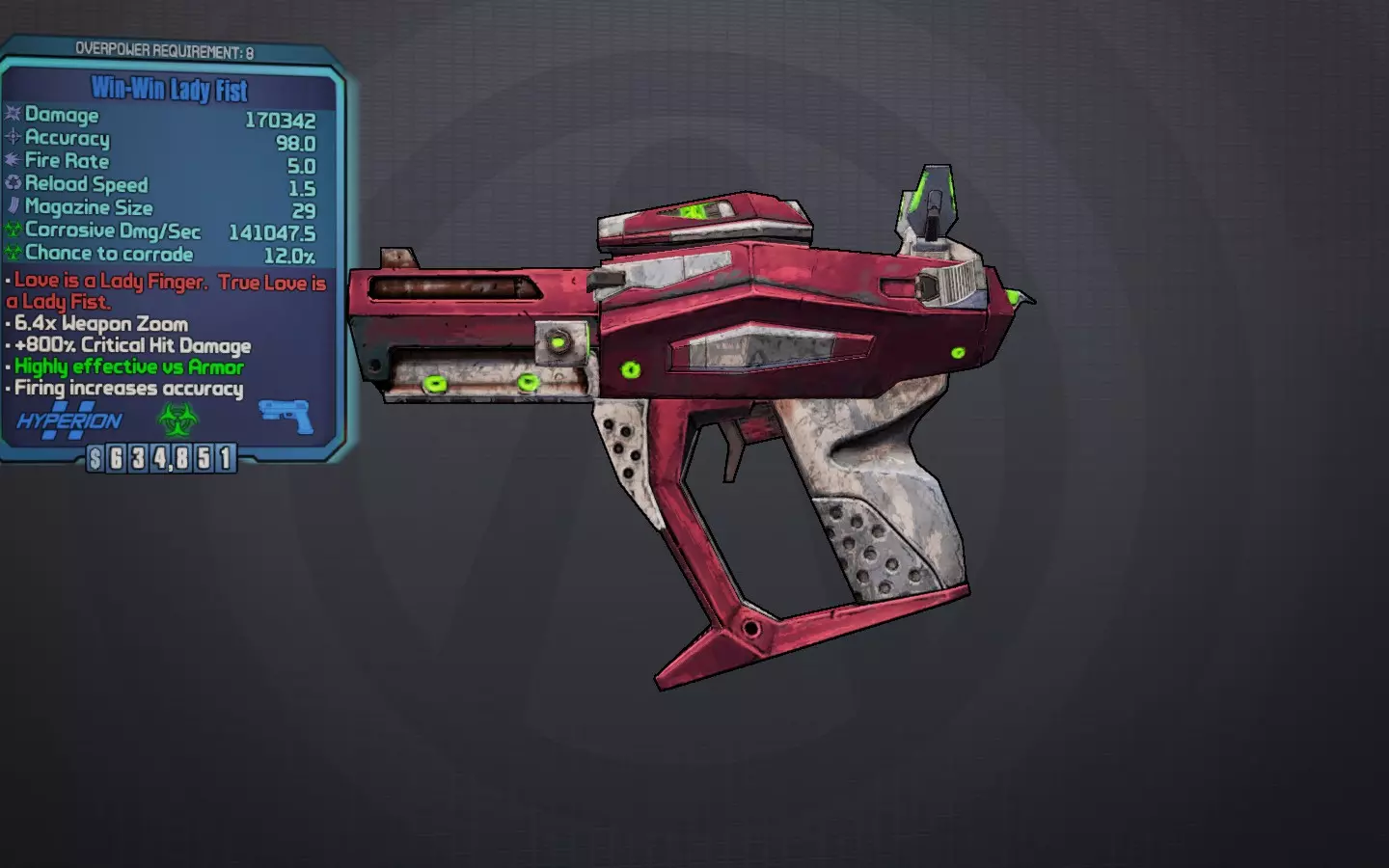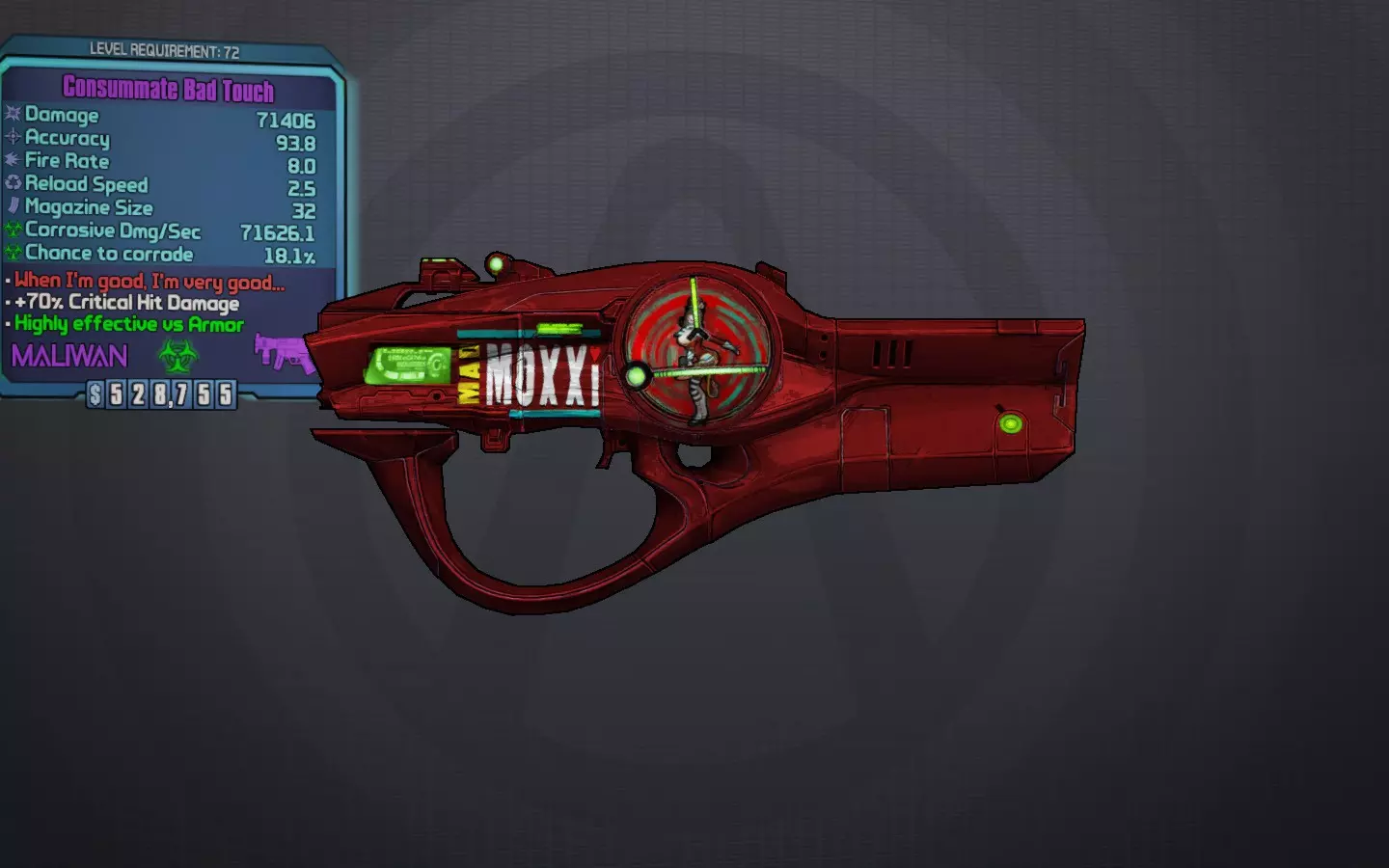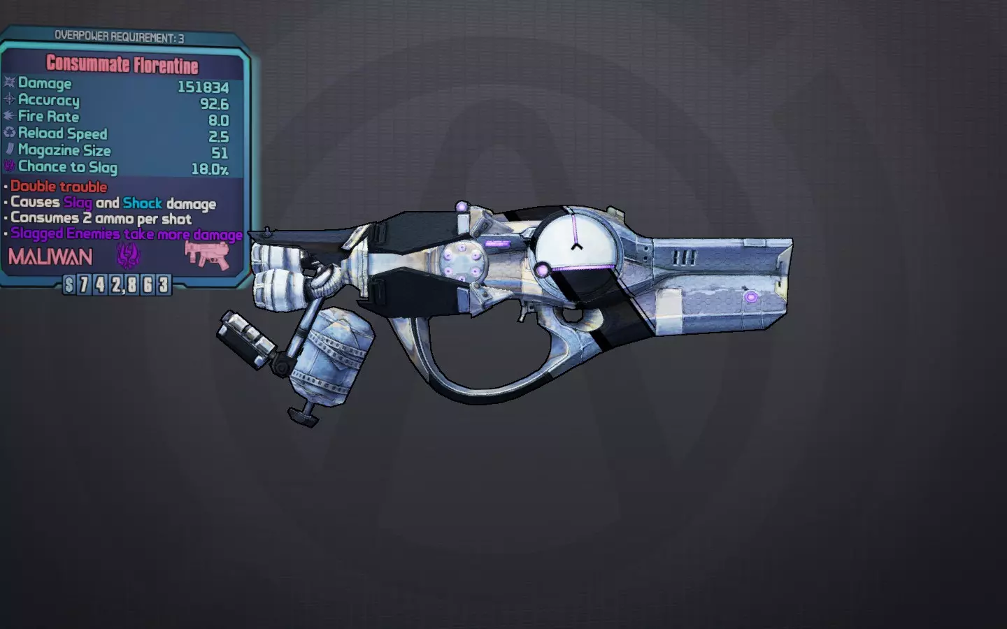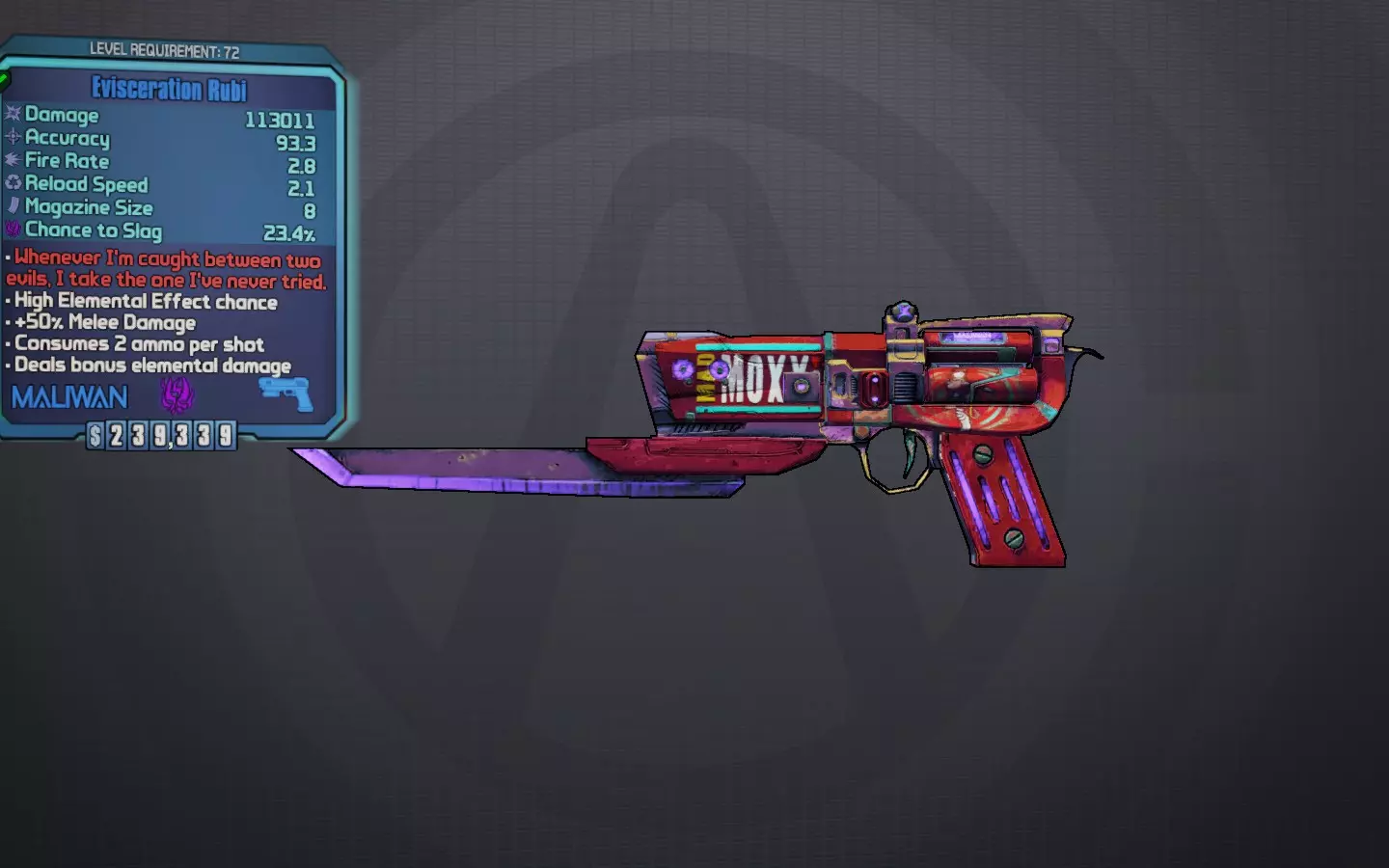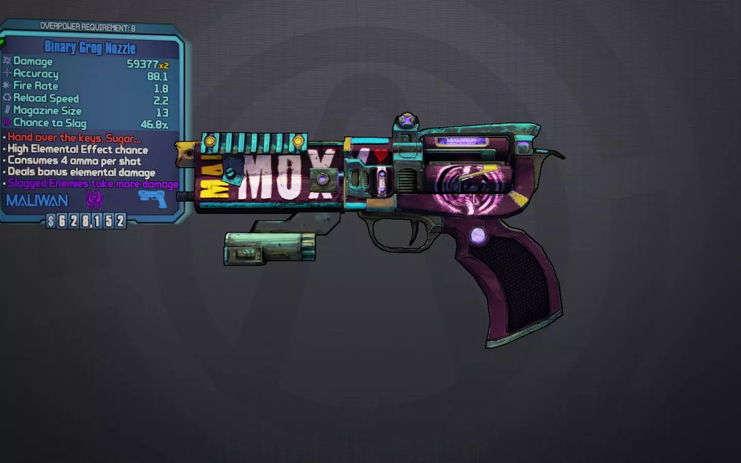 交出钥匙吧,甜心... 一把蓝色的独特莫西马里旺手枪,很像鲁比,但伤害较低,治疗率却异常高达65%。它还拥有隐藏的200%暴击伤害加成、较高的slag几率,并且能造成“醉酒”效果,该效果可转移到其他枪械上,使其无需消耗额外弹药就能喷射多发子弹,这对火箭筒同样有效。 最佳前缀:无关紧要 最佳元素:始终为slag 最佳部件:马里旺握把 获取方式:任务“胡须成就男人”的任务物品。若想保留这把枪,请勿交任务。 荣誉提名: