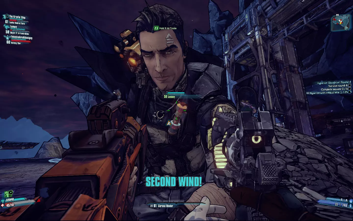 “修复”这个有趣的小技能在前期相当没用,但在终极 vault猎人模式(UVHM)中却能成为你的救命稻草——不是救别人,而是救你自己!当你被打至濒死状态(FFYL),有队友冒着枪林弹雨拼命想救你时,你可以在濒死模式下朝他们射击,持续为其治疗,这样你们俩就都不会死了。搭配像“切割机”(CHOPPER)这类弹匣容量大的强盗系枪械效果拔群。