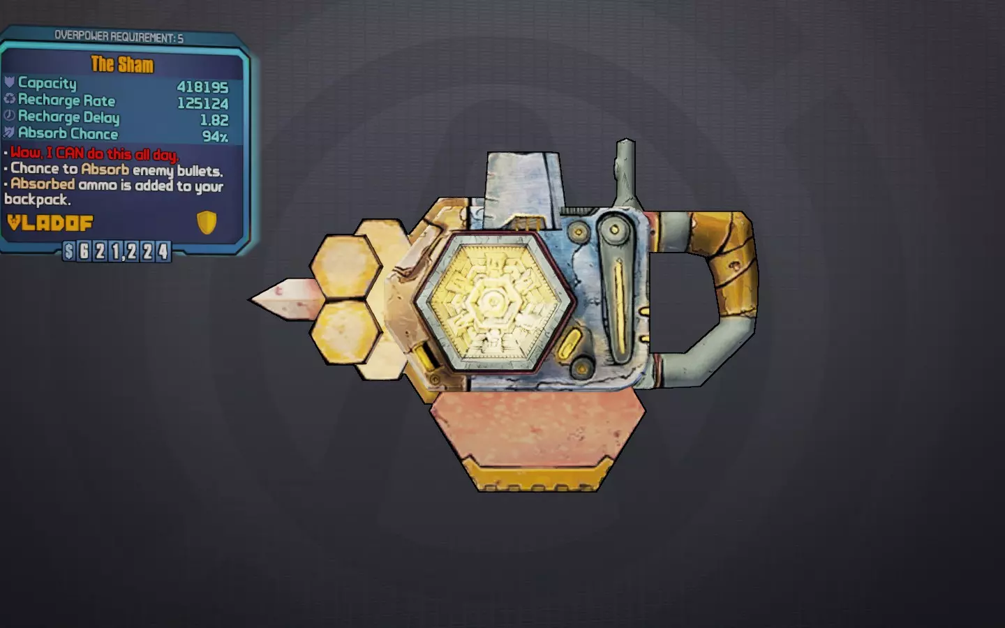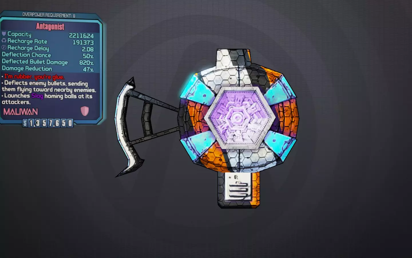 【反派】我是橡皮,你是胶水。 这是一款天使等级的马里旺护盾,具备诸多特性,包括最高880%伤害的子弹反射以及被动 slag(slag 效果)能力。其护盾容量、充能速率和充能延迟通常都相当不错,使其成为游戏中最灵活且平衡的护盾之一。它能与生命汲取和动能反射等技能很好地协同,但即使没有这些技能,也能充分发挥该护盾的全部优势。就像升级版的【骗术师】护盾一样,它在子弹密集的区域表现出色,在其他场景下也能独立发挥良好作用。需要注意的是,如果你站在部分掩体后方,它发射的 slag 球体可能会对自身造成 slag 伤害,因此要小心。 最佳部件:全亥伯龙 获取途径:可在《无主之地2》“小缇娜的龙堡之袭”DLC中的六翼天使商人处购买 荣誉提名: