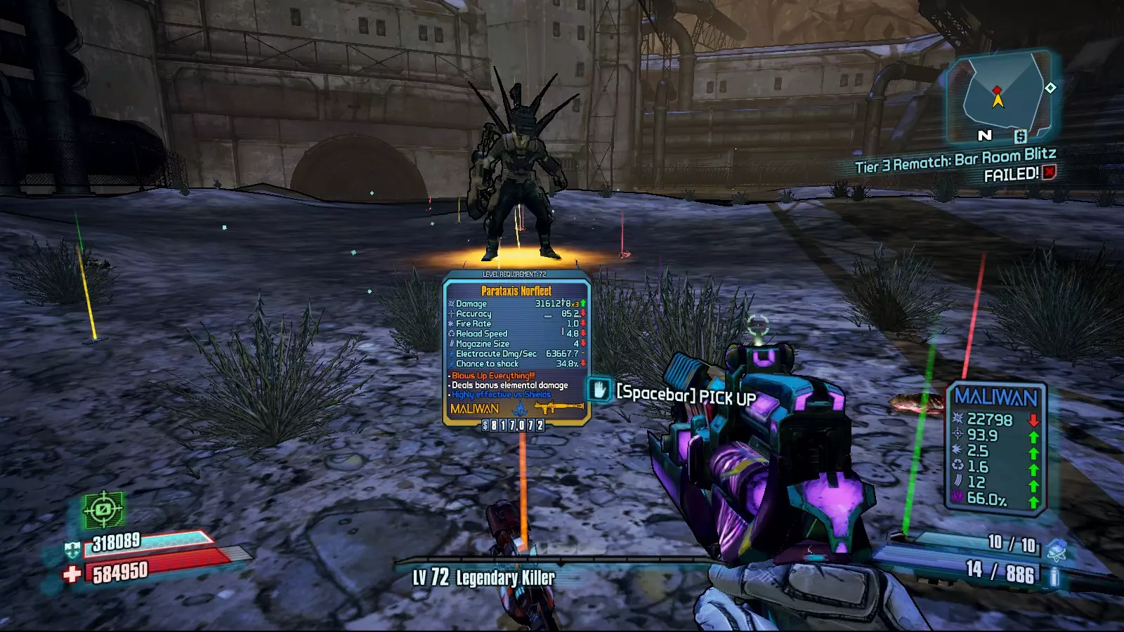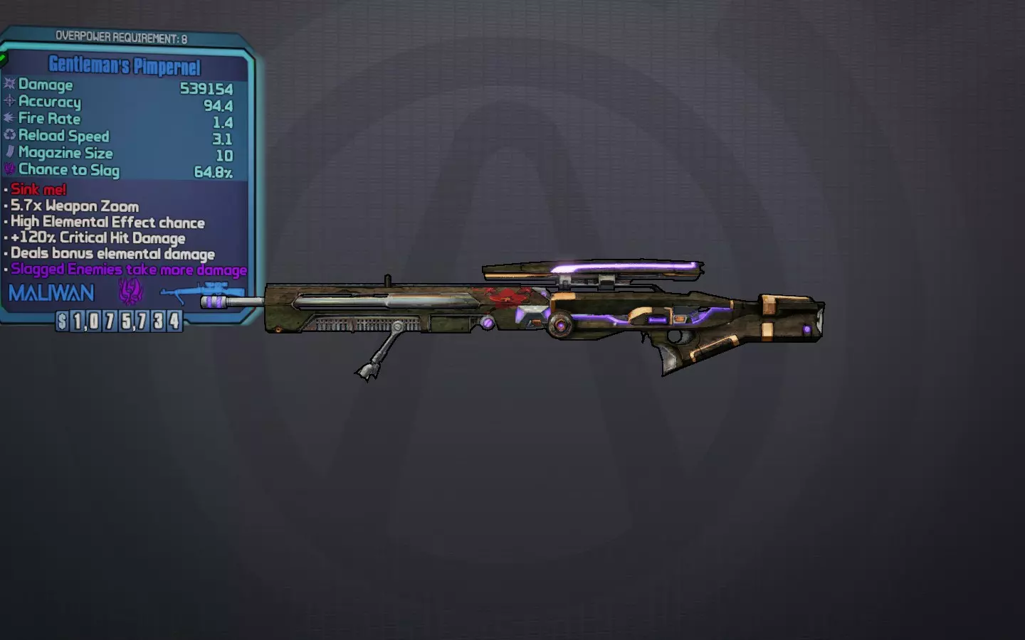 【皮普奈尔】击沉我! 一把蓝色的独特马里旺狙击步枪,也是整个游戏中最棒的狙击枪。它有一个小小的学习门槛,你需要瞄准要害区域的稍下方才能发挥最大伤害。当你用它射击敌人时,第二颗子弹会命中初始射击位置的上方,并呈星形模式分裂。每颗额外子弹都拥有与原子弹相同的全额伤害,附带50%的溅射伤害和100%的暴击加成。当玛雅的技能【连锁反应】激活时,额外子弹也可以弹跳并击中其他敌人。 最佳前缀:咆哮、班伯里 最佳元素:slag(slag元素)、腐蚀 最佳配件:达尔/亥伯龙枪托,雅各布斯/马里旺握把 获取途径:在【无主之地2】的“猩红船长的宝藏”DLC中,完成任务“别复制那张软盘”的奖励 荣誉提名: