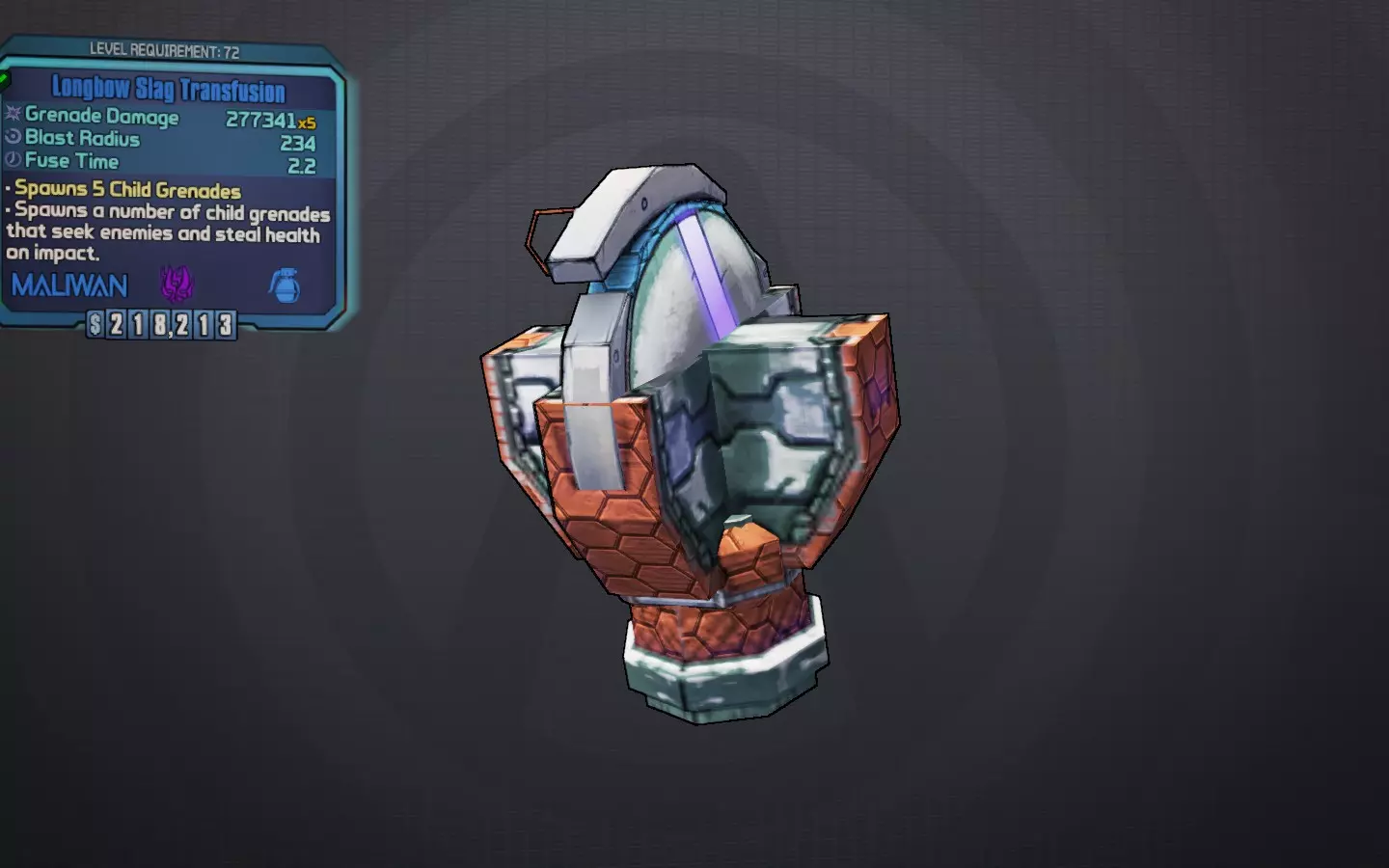 【吸血手雷】 吸血手雷会生成子手雷,从敌人身上窃取生命值并补充自身。这种手雷的独特天使变体——【O型阴性】值得注意。大多数情况下,莫西武器和烈酒治疗已取代吸血手雷,但它们在升级过程中是出色的过渡选择,尤其是能获得slag属性的吸血手雷。由于吸血手雷是常见的手雷模组,它们随处掉落,可能是除特斯拉手雷外最好的非独特手雷。在战斗中承受大量伤害时投掷效果最佳,它很可能让你复活并消灭敌人。 最佳投掷方式:长弓、追踪 最佳元素:slag 获取途径:任何地方掉落;O型阴性由托格DLC中的 pyro pete 掉落