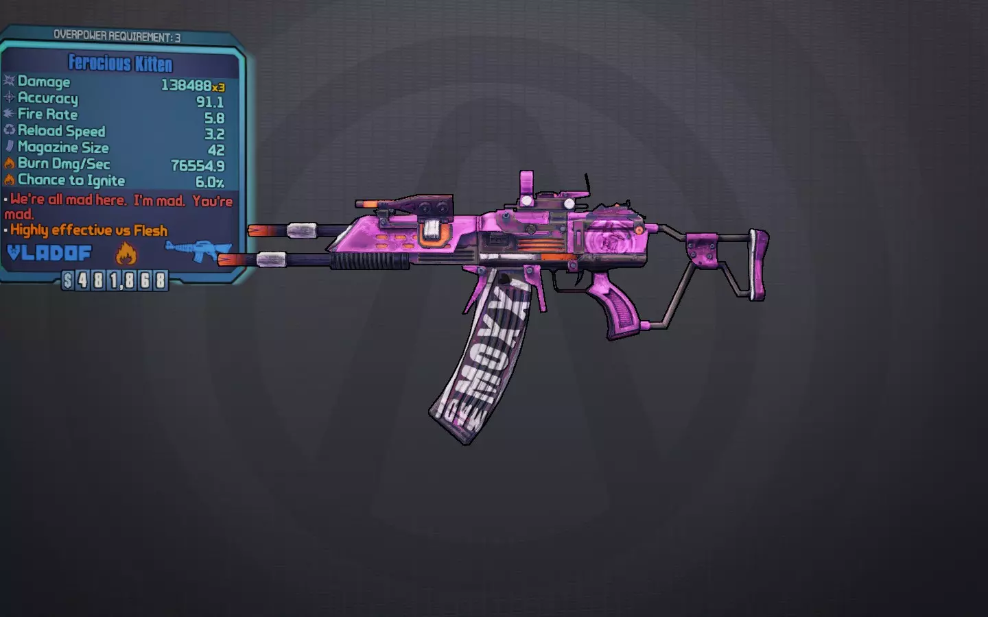 小猫咪 我们都疯了。我疯了。你也疯了。 一把蓝色的独特莫克西突击步枪,类似于冰雹。虽然冰雹的整体伤害更高,但它奇怪的射击模式使得小猫咪更受青睐。小猫咪会发射三发子弹,呈笑脸形状,并且能将造成伤害的4.0%用于治疗玩家。凭借其广泛的散布和高射速,它在机动性和实际命中目标的子弹数量方面往往能超越冰雹。由于它的作用类似霰弹枪,因此最适合在中近距离使用。虽然这对玛雅来说通常存在风险,但这把枪的治疗效果非常容错。这把枪的所有元素版本都很强大,能快速施加状态效果,使得slag Kitten成为Grog/slag Rubi的不错替代品,用于持续对敌人施加slag效果。 最佳前缀:Ferocious 最佳元素:腐蚀、火焰、slag、电击 最佳配件:Vladof握把、Dahl枪托 获取途径:托格DLC中“人人皆求关注”任务的奖励