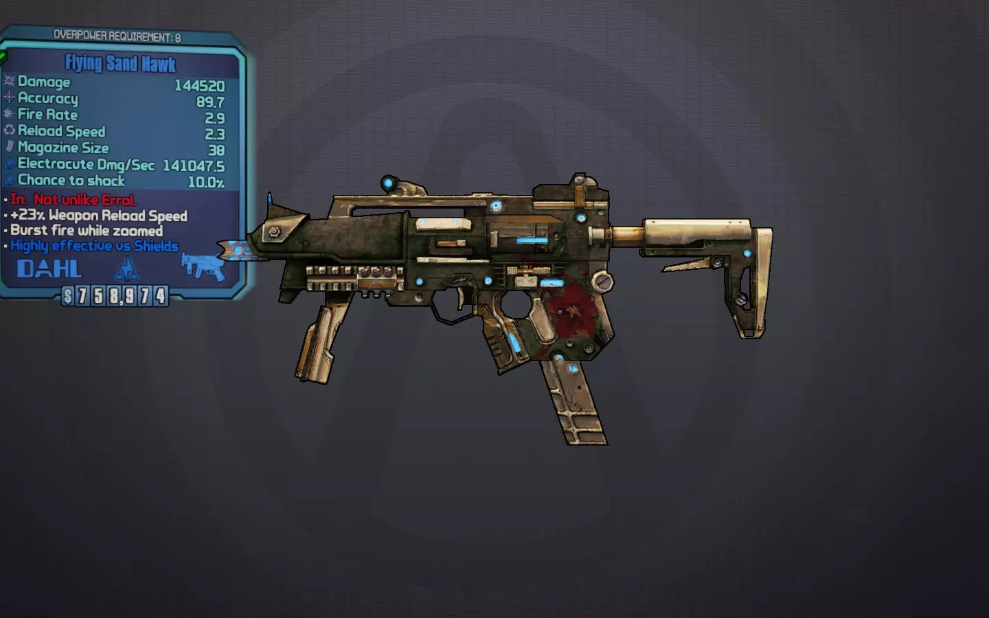 沙鹰。和埃罗尔有点像。 一把蓝色的独特达尔冲锋枪,发射的多发子弹呈飞鸟形状。作为达尔武器,瞄准射击时可以进行连发射击,释放出一连串的飞鸟子弹。由于额外的投射物未被列出,每一发都能从增幅护盾(最著名的是蜜蜂护盾)获得全额增幅伤害。在玛雅手中,它能在不到一个弹夹的时间内摧毁一切。 最佳前缀:飞行(投射物速度) 最佳元素:电击、腐蚀、火焰 最佳配件:达尔枪托、达尔握把 获取途径:在《无主之地2》“猩红船长的宝藏”DLC中,完成任务“哎呀”的奖励 荣誉提及: