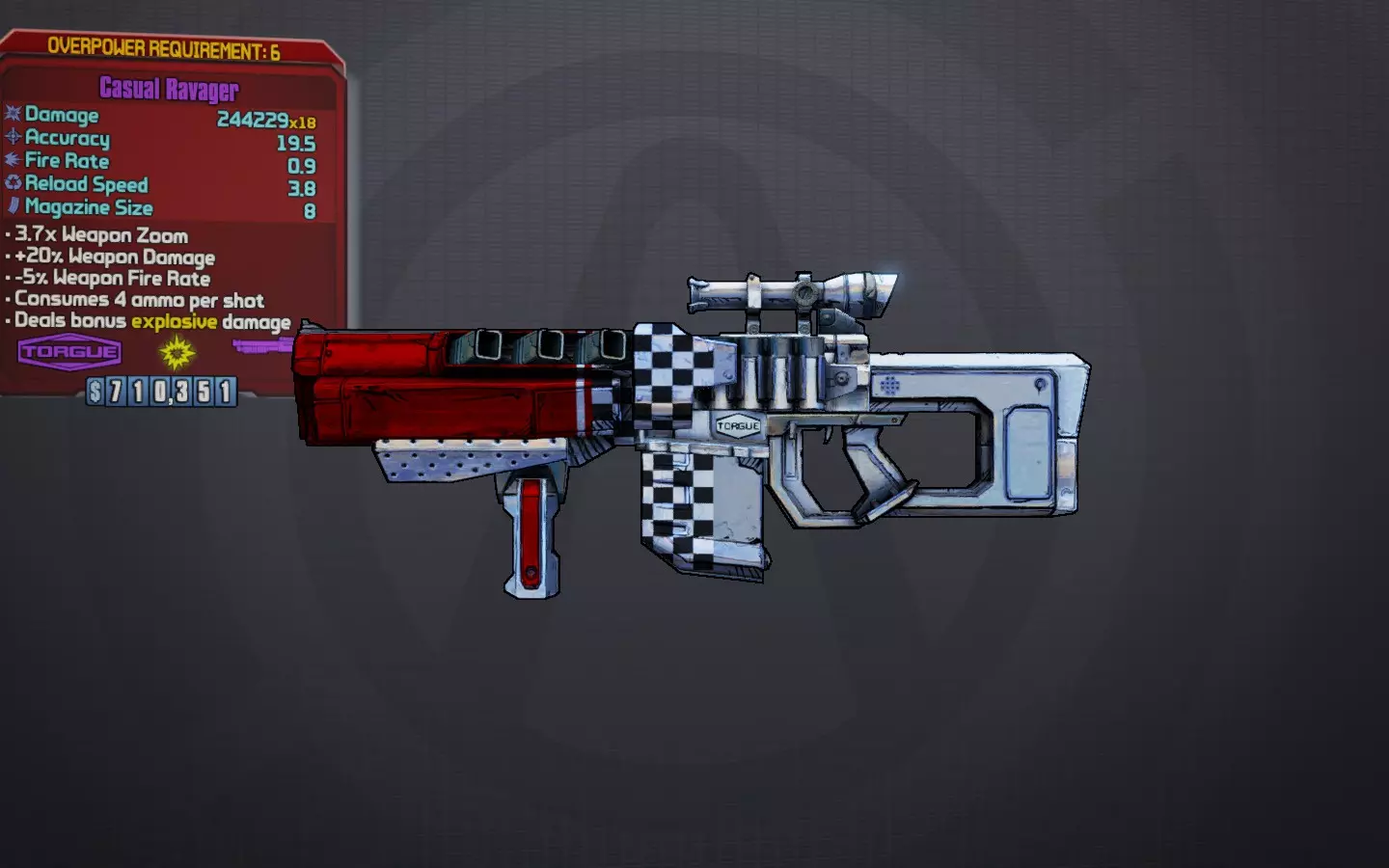 【碎颅者】开始行动吧。 这是玛雅唯一想要的匪徒枪械。这把蓝色独特品质突击步枪射速极快,会持续射击直到你手动换弹(因为弹匣容量很大,除非子弹耗尽否则不会自动换弹)或切换武器。它拥有全元素属性,虽然它在施加状态效果方面表现出色,但实际上我推荐玛雅使用无元素版本。这完全是因为配合“恢复”技能时,这把枪在治疗队友方面效果显著,而非对敌人造成伤害。与哈洛德不同,无元素版本也能安全准确地标记巨龙。(当巨龙处于飞行状态时对其施加状态效果,会导致它们在剩余战斗中对所有元素产生抗性。)几乎无需装弹和较快的射速,是这把枪在这两项活动中表现出色的原因。 最佳前缀:扩张型 最佳元素:无元素 最佳配件:强盗握把, Vladof枪管 获取途径:在哈默洛克的DLC中由德克西杜斯掉落。德克西杜斯是一个秘密突袭首领。