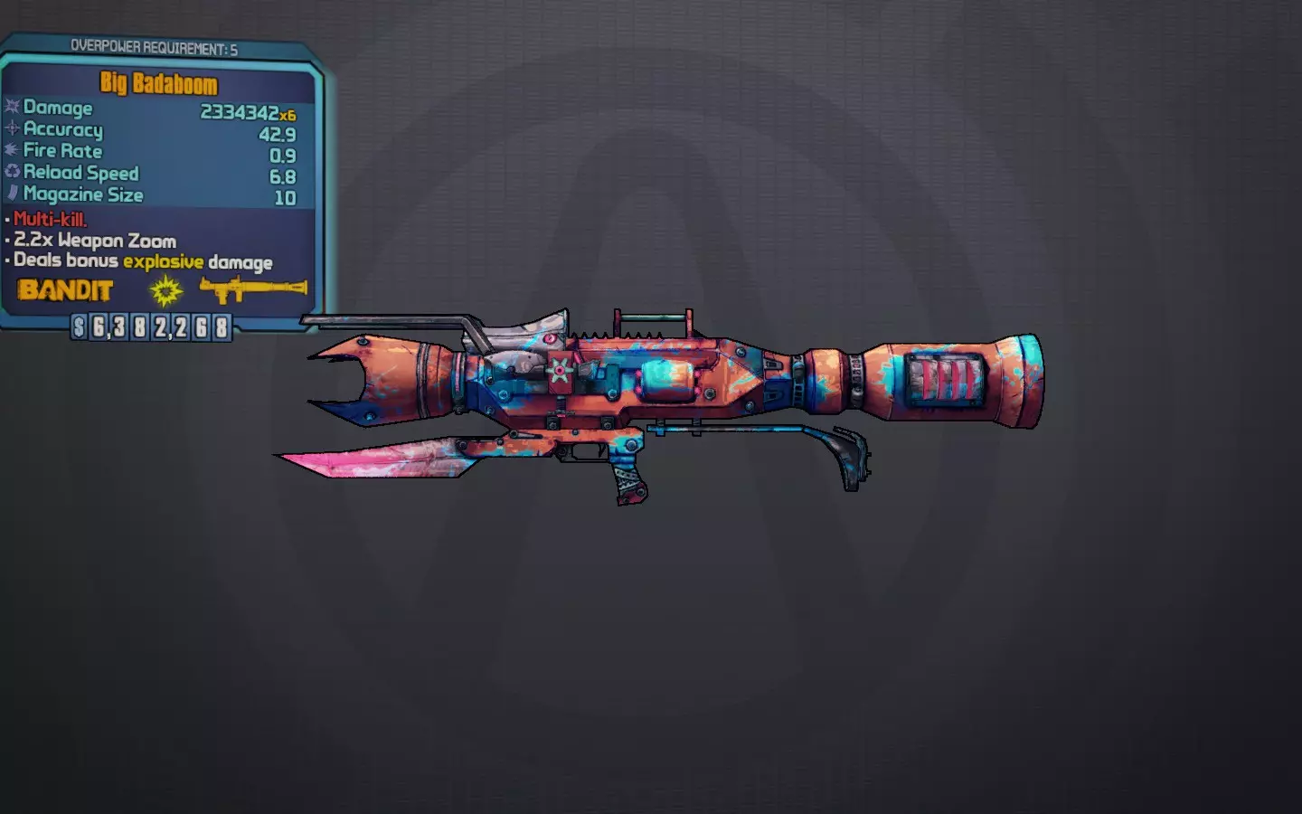 巴达布姆是一款传奇品质的强盗火箭筒,每消耗1发弹药可发射6枚火箭。它是除诺法莱特外最优秀的传奇火箭筒,可带有爆炸元素,且获取难度低得多。 最佳前缀:大型、快速 最佳元素:爆炸 最佳部件:强盗握把、泰迪尔/ Vladof瞄准镜、Vladof/马里旺排气管 获取途径:由铱矿荒野的国王蒙格掉落